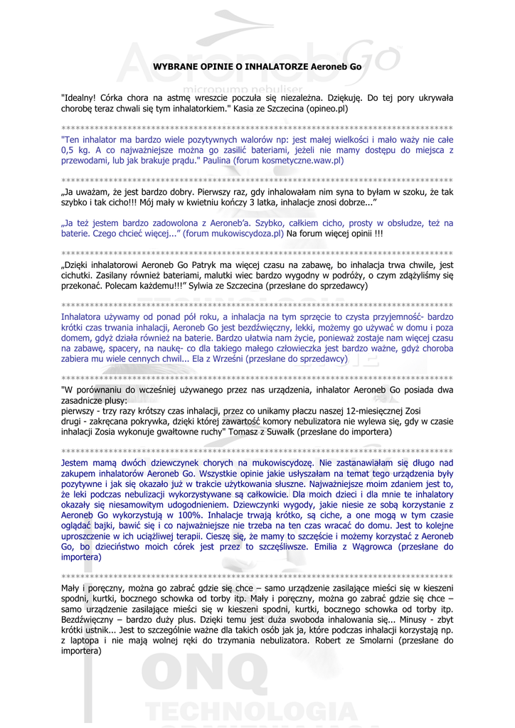 WYBRANE OPINIE O INHALATORZE Aeroneb Go "Idealny! Córka chora na astmę wreszcie poczuła się niezależna. Dziękuję. Do tej pory ukrywała chorobę teraz chwali się tym inhalatorkiem." Kasia ze Szczecina (opineo.pl) *********************************************************************************** "Ten inhalator ma bardzo wiele pozytywnych walorów np: jest małej wielkości i mało waży nie całe 0,5 kg. A co najważniejsze można go zasilić bateriami, jeżeli nie mamy dostępu do miejsca z przewodami, lub jak brakuje prądu." Paulina (forum kosmetyczne.waw.pl) *********************************************************************************** „Ja uważam, że jest bardzo dobry. Pierwszy raz, gdy inhalowałam nim syna to byłam w szoku, że tak szybko i tak cicho!!! Mój mały w kwietniu kończy 3 latka, inhalacje znosi dobrze...” „Ja też jestem bardzo zadowolona z Aeroneb’a. Szybko, całkiem cicho, prosty w obsłudze, też na baterie. Czego chcieć więcej...” (forum mukowiscydoza.pl) Na forum więcej opinii !!! *********************************************************************************** „Dzięki inhalatorowi Aeroneb Go Patryk ma więcej czasu na zabawę, bo inhalacja trwa chwile, jest cichutki. Zasilany również bateriami, malutki wiec bardzo wygodny w podróży, o czym zdążyliśmy się przekonać. Polecam każdemu!!!” Sylwia ze Szczecina (przesłane do sprzedawcy) *********************************************************************************** Inhalatora używamy od ponad pół roku, a inhalacja na tym sprzęcie to czysta przyjemność- bardzo krótki czas trwania inhalacji, Aeroneb Go jest bezdźwięczny, lekki, możemy go używać w domu i poza domem, gdyż działa również na baterie. Bardzo ułatwia nam życie, ponieważ zostaje nam więcej czasu na zabawę, spacery, na naukę- co dla takiego małego człowieczka jest bardzo ważne, gdyż choroba zabiera mu wiele cennych chwil... Ela z Wrześni (przesłane do sprzedawcy) *********************************************************************************** "W porównaniu do wcześniej używanego przez nas urządzenia, inhalator Aeroneb Go posiada dwa zasadnicze plusy: pierwszy - trzy razy krótszy czas inhalacji, przez co unikamy płaczu naszej 12-miesięcznej Zosi drugi - zakręcana pokrywka, dzięki której zawartość komory nebulizatora nie wylewa się, gdy w czasie inhalacji Zosia wykonuje gwałtowne ruchy" Tomasz z Suwałk (przesłane do importera) *********************************************************************************** Jestem mamą dwóch dziewczynek chorych na mukowiscydozę. Nie zastanawiałam się długo nad zakupem inhalatorów Aeroneb Go. Wszystkie opinie jakie usłyszałam na temat tego urządzenia były pozytywne i jak się okazało już w trakcie użytkowania słuszne. Najważniejsze moim zdaniem jest to, że leki podczas nebulizacji wykorzystywane są całkowicie. Dla moich dzieci i dla mnie te inhalatory okazały się niesamowitym udogodnieniem. Dziewczynki wygody, jakie niesie ze sobą korzystanie z Aeroneb Go wykorzystują w 100%. Inhalacje trwają krótko, są ciche, a one mogą w tym czasie oglądać bajki, bawić się i co najważniejsze nie trzeba na ten czas wracać do domu. Jest to kolejne uproszczenie w ich uciążliwej terapii. Cieszę się, że mamy to szczęście i możemy korzystać z Aeroneb Go, bo dzieciństwo moich córek jest przez to szczęśliwsze. Emilia z Wągrowca (przesłane do importera) *********************************************************************************** Mały i poręczny, można go zabrać gdzie się chce – samo urządzenie zasilające mieści się w kieszeni spodni, kurtki, bocznego schowka od torby itp. Mały i poręczny, można go zabrać gdzie się chce – samo urządzenie zasilające mieści się w kieszeni spodni, kurtki, bocznego schowka od torby itp. Bezdźwięczny – bardzo duży plus. Dzięki temu jest duża swoboda inhalowania się... Minusy - zbyt krótki ustnik... Jest to szczególnie ważne dla takich osób jak ja, które podczas inhalacji korzystają np. z laptopa i nie mają wolnej ręki do trzymania nebulizatora. Robert ze Smolarni (przesłane do importera) *********************************************************************************** Bardzo cichy i szybki, podoba się dziecku, bo jest taki mały i "ładny- jak dla dużych" jak powiedziała córeczka. Dla mnie jest przede wszystkim szybki i cichy oraz mobilny - ułatwi nam życie na wakacjach gdzie często mamy awarie w dostawie prądu jak i przyda się na pierwsze nocowania pod namiotem, które planujemy w tym roku na spływie kajakowym. Jestem zaskoczona, że inhalacja może tak krótko trwać, przez co i dziecko chętniej ją robi nawet nie musi przerywać za bardzo zabawy. Szkoda tylko, że ustnik nie jest mocniej przymocowany gdyż córka lubi "trzymać" nebulizator tylko ustami żeby mieć wolne ręce. Aleksandra z Józefosławia (przesłane do importera) *********************************************************************************** Dzięki Waszemu urządzeniu komfort inhalacji jest znacznie lepszy. Cicho działające urządzenie to wielki plus. A ponadto wygoda w sprawie takiej, że może z nim córka być wszędzie gdzie w danej chwili ma ochotę się inhalować. Nie można nie wspomnieć o cenie-super! Wielki ukłon dla Was kochani i wdzięczność, że takowe urządzenie pojawiło się w Polsce. Marzena Stosik (przesłane do importera) *********************************************************************************** OPINIE DZIECI i RODZICÓW "Jestem sobie mały skrzat Mam na imię Wiktoria i mam 8 lat. Moja choroba jest jeszcze nieuleczalna Może kiedyś nastąpi zmiana kolosalna. Mały prezent od mojej Mamy Otworzył dla mnie nowe bramy. Inhalator Aeroneb Go to małe cudeńko Co działa super cichuteńko. Dziękuję . że ktoś coś takiego wymyślił I moje dzieciństwo i życie ocalił. Inhalacja nim to sama radość Mam dla niego og
