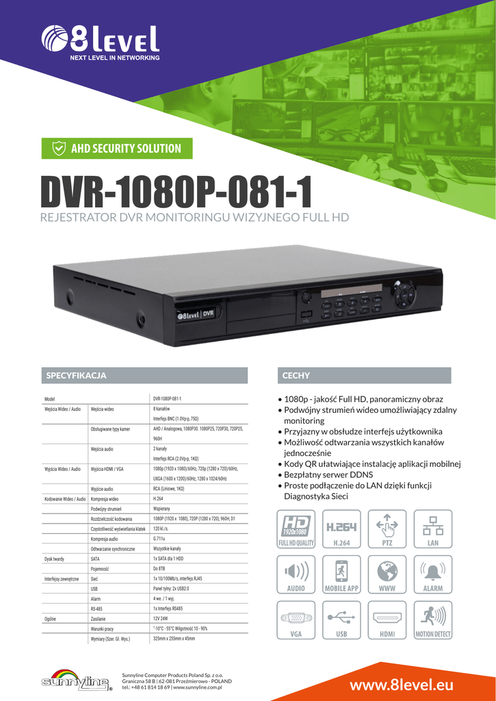 AHD SECURITY SOLUTION DVR-1080P-081-1 REJESTRATOR DVR MONITORINGU WIZYJNEGO FULL HD SPECYFIKACJA CECHY DVR-1080P-081-1 Model Wejścia Wideo / Audio 8 kanałów Wejścia wideo Interfejs BNC (1.0Vp-p, 75Ω) Obsługiwane typy kamer AHD / Analogowa, 1080P30. 1080P25, 720P30, 720P25, 960H 2 kanały Wejścia audio Interfejs RCA (2.0Vp-p, 1KΩ) Wyjścia Wideo / Audio Wyjścia HDMI / VGA 1080p (1920 x 1080)/60Hz, 720p (1280 x 720)/60Hz, UXGA (1600 x 1200)/60Hz, 1280 x 1024/60Hz RCA (Liniowe, 1KΩ) Wyjście audio H.264 Kodowanie Wideo / Audio Kompresja wideo Dysk twardy Interfejsy zewnętrzne Ogólne Podwójny strumień Wspierany Rozdzielczość kodowania 1080P (1920 x 1080), 720P (1280 x 720), 960H, D1 Częstotliwość wyświetlania klatek 120 kl./s. Kompresja audio G.711u Odtwarzanie synchroniczne Wszystkie kanały SATA 1x SATA dla 1 HDD Pojemność Do 8TB Sieć 1x 10/100Mb/s, interfejs RJ45 USB Panel tylny: 2x USB2.0 Alarm 4 we. / 1 wyj. RS-485 1x Interfejs RS485 Zasilanie 12V 24W Warunki pracy "-10°C - 55°C Wilgotność 10 - 90% Wymiary (Szer. Gł. Wys.) 325mm x 255mm x 45mm Sunnyline Computer Products Poland Sp. z o.o. Graniczna 58 B | 62-081 Przeźmierowo - POLAND tel.: +48 61 814 18 69 | www.sunnyline.com.pl • 1080p - jakość Full HD, panoramiczny obraz • Podwójny strumień wideo umożliwiający zdalny monitoring • Przyjazny w obsłudze interfejs użytkownika • Możliwość odtwarzania wszystkich kanałów jednocześnie • Kody QR ułatwiające instalację aplikacji mobilnej • Bezpłatny serwer DDNS • Proste podłączenie do LAN dzięki funkcji Diagnostyka Sieci 1920x1080 FULL HD QUALITY www.8level.eu