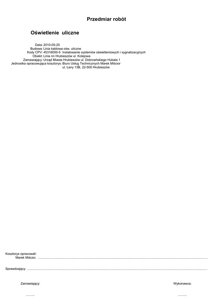 Przedmiar robót Oświetlenie uliczne Data: 2010-05-25 Budowa: Linia kablowa ośw. uliczne Kody CPV: 45316000-5 Instalowanie systemów oświetleniowych i sygnalizacyjnych Obiekt: Linia nn Hrubieszów ul. Kolejowa Zamawiający: Urząd Miasta Hrubieszów ul. Dobrzańskiego Hubala 1 Jednostka opracowująca kosztorys: Biuro Usług Technicznych Marek Miścior ul. Łany 13B, 22-500 Hrubieszów Kosztorys opracowali: Marek Miścior, .................................................................................................................................................................................................. Sprawdzający: ............................................................................................................................................................................................................... Zamawiający: Wykonawca: .......... .......... Zuzia (C) DataComp 1994-2009(lic. 2283) Przedmiar robót Podstawa nakładu, opis pozycji, wyliczenie ilości robót 1 Oświetlenie uliczne 1 KNNR 5/701/2 Kopanie rowów dla kabli, ręcznie, grunt kategorii III od szafy SO-2C do sł. 11 (34+48+27+29+45+48+48+45+41+41+23-920,5-21-12,5-10-9,5-3,5)*0,4*1,2 = od szafy SO-2C do słupa nr 19 (34+40+41+43+42+43+50+37-7-11-39-13)* 0,4*1,2 = Ilość Krot. Jedn. 164,640 124,800 289 ~289 m3 2 KNNR 5/702/2 Zasypanie rowów dla kabli, ręcznie, grunt kategorii III 289 m3 3 KNNR 5/724/2 Wykopy pionowe ręczne dla urządzenia przeciskowego wraz z jego zasypaniem, grunt nienawodniony, kategorii III-IV do sł nr 11 3*1,5*1,5*7 = 47,250 do sł nr 19 3*1,5*1,5*4 = 27,000 74,250 ~74,250 m3 4 KNNR 5/725/1 Wykonanie ściany oporowej, dla sił nacisku do 25·t (1 płyta) 11 szt 5 KNNR 5/723/1 Przewierty mechaniczne dla rur pod obiektami, rura do Fi·100·mm (pierwsza w wiązce) do sł. 11 9+20,5+21+12,5+10+9,5+3,5 = 86,000 do sł. 19 7+11+39+13 = 70,000 156 ~156 m 6 KNNR 5/705/1 Ułożenie rur osłonowych PVC do Fi·140·mm do sł nr 11 34+48+27+29+45+48+48+45+41+41+23-920,5-21-12,5-10-9,5-3,5 = 343,000 do sł nr 19 34+40+41+43+42+43+50+37-7-11-39-13 = 260,000 603 ~603 m 7 KNNR 5/713/2 Układanie kabli w rurach, pustakach lub kanałach zamkniętych, kabel do 1,0·kg/m 759 m 8 KNR 510/114/2 Układanie kabli wielożyłowych w rurach, pustakach lub kanałach zamkniętych, do 1,0·kg/m- w słupach R= 0,955 M= 1,000 S= 1,000 22*3+16*3+2*3 = 120,000 120,000~120,000 m 9 KNR 201/310/2 Wykopy ciągłe lub jamiste ze skarpami o szerokości dna do 1.5·m ze złożeniem urobku na odkład, wykopy o głębokości do 1.5·m, kategoria gruntu III R= 0,955 M= 1,000 S= 1,000 1,5*0,4*1*19 = 11,400 11,400 ~11,400 m3 10 KNR 202/351/1 Obsadzenie w stopach szklankowych słupów o masie do 2,0·t - fundamenty słupów oswietleniowych 19 element 11 KNR 201/320/2 (1) Ręczne zasypywanie wykopów liniowych o ścianach pionowych, głębokość do 1.5·m, kategoria gruntu III-IV, szerokość wykopu 0.8-1.5·m R= 0,955 M= 1,000 S= 1,000 11,40 m3 12 KNR 510/708/1 (1) Ręczne stawianie słupów oświetleniowych, do 250·kg, w gruncie kategorii I-III R= 0,955 M= 1,000 S= 1,000 19 szt 13 KNR 510/1002/1 Montaż wysięgników rurowych, na słupie, wysięgnik do 15·kg R= 0,955 M= 1,000 S= 1,000 19 szt 14 KNR 510/1005/7 Montaż na wysięgniku opraw do lamp, na zamontowanym wysięgniku, oprawa rtęciowa z 1 lampą R= 0,955 M= 1,000 S= 1,000 19 szt 15 KNR 510/1001/3 Montaż tabliczek zaciskowych bezpiecznikowych, tabliczka na konstrukcji, zaciskowa R= 0,955 M= 1,000 S= 1,000 19 szt 16 KNR 510/1004/1 Wciąganie przewodów, z udziałem podnośnika samochodowego w słupy latarń lub rury osłonowe R= 0,955 M= 1,000 S= 1,000 190 m 17 KNNR 5/726/10 Obróbka na sucho kabli na napięcie do 1kV o izolacji i powłoce z tworzyw sztucznych, kabel 4-żyłowy, do 50·mm2 38 2,00 szt 18 KNR 508/608/7 Układanie bednarki, w rowach kablowych, przekrój bednarki do 120·mm2 80 m Zuzia (C) DataComp 1994-2009(lic. 2283) Zuzia (C) DataComp 1994-2009(lic. 2283) Podstawa nakładu, opis pozycji, wyliczenie ilości robót Ilość Krot. Jedn. 19 KNR 508/614/2 Mechaniczne pogrążanie uziomów prętowych, kategoria gruntu III 36 m 20 KNR 403/1203/1 Badanie linii kablowej nn o ilości żył do 4 19 odcinek 21 KNR 201/310/2 Wykopy ciągłe lub jamiste ze skarpami o szerokości dna do 1.5·m ze złożeniem urobku na odkład, wykopy o głębokości do 1.5·m, kategoria gruntu III 1,5*1,2*0,8 = 1,440 1,440 ~1,440 m3 22 KNR 510/1106/1 Montaż szaf sterowniczych sygnalizacji ulicznej lub oświetlenia zewnętrznego na gotowym fundamencie, szafy do 100·kg R= 0,955 M= 1,000 S= 1,000 1 szt 23 KNNR 5/603/1 Przewody uziemiające i wyrównawcze w kanałach odkrytych i na słupach, w kanałach lub tunelach luzem, bednarka do 120·mm2 - uziemienie PEN szafy SO 2 m Zestawienie robocizny Lp. Nazwa zawodu Jedn. Ilość 1. Elektromonter grupa II . . . . . . . . . . . . . . . . . . . . . . . . . . . . . . . . . . . . . . . . . . . . . . . . . . . . . . . . . . . . . . . . . . . . . . . . . . . . . . . r-g 61,356 2. Elektromonter grupa III . . . . . . . . . . . . . . . . . . . . . . . . . . . . . . . . . . . . . . . . . . . . . . . . . . . . . . . . . . . . . . . . . . . . . . . . . . . . . . r-g 107,736 3. Elektromonter grupa IV . . . . . . . . . . . . . . . . . . . . . . . . . . . . . . . . . . . . . . . . . . . . . . . . . . . . . . . . . . . . . . . . . . . . . . . . . . . . . . r-g 24,246 4. Monter konstrukcji żelbetowych grupa II . . . . . . . . . . . . . . . . . . . . . . . . . . . . . . . . . . . . . . . . . . . . . . . . . . . . . . . . . . . . . . . . . r-g 14,44 5. Monter konstrukcji żelbetowych grupa III . . . . . . . . . . . . . . . . . . . . . . . . . . . . . . . . . . . . . . . . . . . . . . . . . . . . . . . . . . . . . . . . r-g 28,88 6. Robotnicy . . . . . . . . . . . . . . . . . . . . . . . . . . . . . . . . . . . . . . . . . . . . . . . . . . . . . . . . . . . . . . . . . . . . . . . . . . . . . . . . . . . . . . . . r-g 1 998,556 7. Robotnicy gru