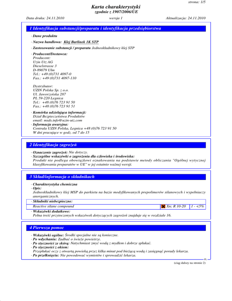 DR strona: 1/5 Karta charakterystyki zgodnie z 1907/2006/UE Data druku: 24.11.2010 wersja 1 Aktualizacja: 24.11.2010 1 Identyfikacja substancji/preparatu i identyfikacja przedsiębiorstwa · Dane produktu · Nazwa handlowa: Klej Barlinek 1K STP · Zastosowanie substancji / preparatu Jednoskładnikowy klej STP · Producent/Dostawca: Producent: Uzin Utz AG Dieselstrasse 3 D-89079 Ulm Tel.: +49 (0)731 4097-0 Fax.: +49 (0)731 4097-110 Dystrybutor: UZIN Polska Sp. z o.o. Ul. Jaworzyńska 287 PL 59-220 Legnica Tel.: +48 (0)76 723 91 50 Fax.: +48 (0)76 723 91 51 · Komórka udzielająca informacji: Dział Bezpieczeństwa Produktów email: [email protected] · Informacja awaryjna: Centrala UZIN Polska, Legnica +48 (0)76 723 91 50 W dni pracujące w godz. od 7 do 15 2 Identyfikacja zagroŜeń · Oznaczenie zagroŜeń: Nie dotyczy. · Szczególne wskazówki o zagroŜeniu dla człowieka i środowiska: Produkt nie podlega obowiązkowi oznakowania na podstawie metody obliczania "Ogólnej wytycznej klasyfikowania preparatów w UE" w jej ostatnio waŜnej wersji. 3 Skład/informacja o składnikach · Charakterystyka chemiczna · Opis: Jednoskładnikowy klej MSP do parkietu na bazie modyfikowanych prepolimerów silanowych i wypełniaczy anorganicznych. · Składniki niebezpieczne: Reactive silane compound Xn; R 10-20 1 - <5% · Wskazówki dodatkowe: Pełna treść przytoczonych wskazówek dotyczących zagroŜeń znajduje się w rozdziale 16. 4 Pierwsza pomoc · Wskazówki ogólne: Środki specjalne nie są konieczne. · Po wdychaniu: Zadbać o świeŜe powietrze. · Po styczności ze skórą: Natychmiast zmyć wodą z mydłem i dobrze spłukać. · Po styczności z okiem: Przepłukać oczy z otwartą powieką przez kilka minut pod bieŜącą wodą i zasięgnąć porady lekarza. · Po przełknięciu: Nie powodować wymiotów i sprowadzić lekarza. PL (ciąg dalszy na stronie 2) DR strona: 2/5 Karta charakterystyki zgodnie z 1907/2006/UE Data druku: 24.11.2010 wersja 1 Aktualizacja: 24.11.2010 Nazwa handlowa: Klej Barlinek 1K STP (ciąg dalszy od strony 1) 5 Postępowanie w przypadku poŜaru · Przydatne środki gaśnicze: CO₂, proszek gaśniczy lub strumień wody. Większy poŜar zwalczać strumieniem wody lub pianą odporną na działanie alkoholu. · Środki gaśnicze nieprzydatne ze względów bezpieczeństwa: Woda pełnym strumieniem. · Specjalne wyposaŜenie ochronne: ZałoŜyć urządzenie ochrony dróg oddechowych. 6 Postępowanie w przypadku niezamierzonego uwolnienia do środowiska · Środki ostroŜności dostosowane do danej osoby: Nosić ubranie ochronne. Osoby nie zabezpieczone przenieść w bezpieczne miejsce. · Środki ochrony środowiska: Nie dopuścić do przeniknięcia do kanalizacji /wód powierzchniowych /wód gruntowych. · Metoda oczyszczania/ wchłaniania: Zebrać za pomocą materiału wiąŜącego ciecze (piasek, ziemia okrzemkowa, materiał wiąŜący kwasy, materiał wiąŜący uniwersalny, trociny). 7 Postępowanie z substancją/preparatem i jej/jego magazynowanie · Sposób obchodzenia się: · Wskazówki dla bezpiecznego uŜytkowania: Unikać styczności z oczami i skórą. Myć ręce po zakończeniu pracy z substancją / preparatem. Zadbać o wystarczające przewietrzenie. · Wskazówki dla ochrony przeciwpoŜarowej i przeciwwybuchowej: Nie są potrzebne szczególne zabiegi. · Składowanie: · Wymagania w stosunku do pomieszczeń składowych i zbiorników: Brak szczególnych wymagań. · Wskazówki odnośnie wspólnego składowania: Nie konieczne. · Dalsze wskazówki odnośnie warunków składowania: Chronić przed wilgotnym powietrzem i wodą. 8 Kontrola naraŜenia i środki ochrony indywidualnej · Dodatkowe wskazówki dla wykonania urządzeń technicznych: Brak dalszych danych, patrz punkt 7. · Składniki wraz z kontrolowanymi wartościami granicznymi zaleŜnymi od miejsca pracy: Produkt nie zawiera znaczących ilości materiałów, których wartości graniczne musiałyby być kontrolowane pod kątem warunków miejsca pracy. · Osobiste wyposaŜenie ochronne: · Ogólne środki ochrony i higieny: NaleŜy przestrzegać zwyczajnych środków ostroŜności przy obchodzeniu się z chemikaliami. Unikać styczności z oczami i skórą. Myć ręce po zakończeniu pracy z substancją / preparatem. · Ochrona dróg oddechowych: Nie konieczne. Przy pracy z preparatem naleŜy dotrzymywać dopuszczalnych NDS w miejscu pracy. Środki ochrony dróg oddechowych nie są wtedy niezbędne. · Ochrona rąk: Rękawice z PCW lub PE · Materiał, z którego wykonane są rękawice Rękawice z PCW lub PE (ciąg dalszy na stronie 3) PL DR strona: 3/5 Karta charakterystyki zgodnie z 1907/2006/UE Data druku: 24.11.2010 wersja 1 Aktualizacja: 24.11.2010 Nazwa handlowa: Klej Barlinek 1K STP (ciąg dalszy od strony 2) · Czas penetracji dla materiału, z którego wykonane są rękawice Od producenta rękawic naleŜy uzyskać informację na temat dokładnego czasu przebicia i go przestrzegać. · Ochrona oczu: Okulary ochronne szczelnie zamknięte 9 Właściwości fizyczne i chemiczne · Ogólne dane Forma: Kolor: Zapach: W postaci pasty JasnobeŜowy Prawie bezwonny · Zmiana stanu Punkt topnienia/ Zakres topnienia: Nie jest określony. Nie jest określony. Punkt wrzenia/ Zakres wrzenia: · Punkt zapłonu: > 100°C · Samozapłon: Produkt nie jest samozapalny. · Niebezpieczeństwo wybuchu: Produkt nie grozi wybuchem. · Gęstość w 20°C: 1,6 g/cm3 · Rozpuszczalność w/ mieszalność z Woda: Nie lub mało mieszalny. · Lepkość: Kinetyczna w 20°C: 100000 s (DIN 53211/4) 10 Stabilność i reaktywność · Rozkład termiczny/ warunki których naleŜy unikać: Produkt w kontakcie z wilgocią hydrolizuje z utworzeniem methanolu. · Materiały, których naleŜy unikać: · Reakcje niebezpieczne Reakcje niebezpieczne nie są znane. · Niebezpieczne produkty rozkładu: Metanol jest moŜliwy śladowo. 11 Informacje toksykologiczne · Ostra toksyczność: · Pierwotne działanie draŜniące: Działa