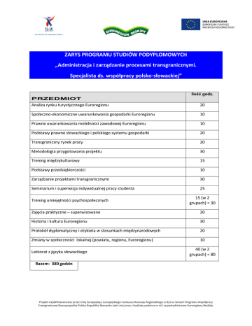 ZARYS PROGRAMU STUDIÓW PODYPLOMOWYCH „Administracja i zarządzanie procesami transgranicznymi. Specjalista ds. współpracy polsko-słowackiej” Ilość godz. PRZEDMIOT Analiza rynku turystycznego Euroregionu 20 Społeczno-ekonomiczne uwarunkowania gospodarki Euroregionu 10 Prawne uwarunkowania mobilności zawodowej Euroregionu 10 Podstawy prawne słowackiego i polskiego systemu gospodarki 20 Transgraniczny rynek pracy 20 Metodologia przygotowania projektu 30 Trening międzykulturowy 15 Podstawy przedsiębiorczości 10 Zarządzanie projektami transgranicznymi 30 Seminarium i superwizja indywidualnej pracy studenta 25 Trening umiejętności psychospołecznych 15 (w 2 grupach) = 30 Zajęcia praktyczne – superwizowane 20 Historia i kultura Euroregionu 30 Protokół dyplomatyczny i etykieta w stosunkach międzynarodowych 20 Zmiany w społeczności lokalnej (powiatu, regionu, Euroregionu) 10 Lektorat z języka słowackiego 40 (w 2 grupach) = 80 Razem: 380 godzin Projekt współfinansowany przez Unię Europejską z Europejskiego Funduszu Rozwoju Regionalnego w 85% w ramach Programu Współpracy Transgranicznej Rzeczpospolita Polska-Republika Słowacka 2007-2013 oraz z budżetu państwa w 10% za pośrednictwem Euroregionu Beskidy. Harmonogram zjazdów w I semestrze 1 – 2.10.2011r. 15 – 16.10.2011r. 5 – 6.11.2011r. 19 – 20.11.2011r. 10 – 11.12.2011r. 14 – 15.01.2012r. 28 – 29.01.2012r. 4 – 5.02.2012r. 18 – 19.02.2012r. Projekt współfinansowany przez Unię Europejską z Europejskiego Funduszu Rozwoju Regionalnego w 85% w ramach Programu Współpracy Transgranicznej Rzeczpospolita Polska-Republika Słowacka 2007-2013 oraz z budżetu państwa w 10% za pośrednictwem Euroregionu Beskidy.