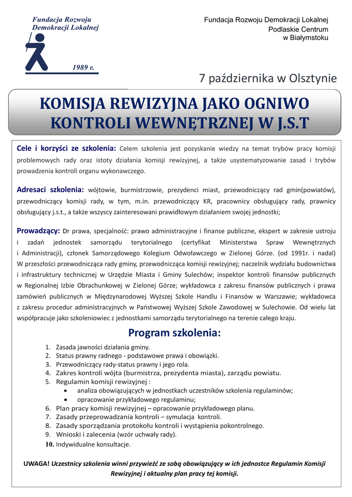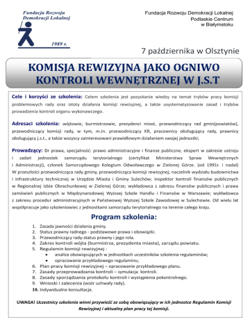 Fundacja Rozwoju Demokracji Lokalnej Podlaskie Centrum w Białymstoku 7 października w Olsztynie KOMISJA REWIZYJNA JAKO OGNIWO KONTROLI WEWNĘTRZNEJ W J.S.T Cele i korzyści ze szkolenia: Celem szkolenia jest pozyskanie wiedzy na temat trybów pracy komisji problemowych rady oraz istoty działania komisji rewizyjnej, a także usystematyzowanie zasad i trybów prowadzenia kontroli organu wykonawczego. Adresaci szkolenia: wójtowie, burmistrzowie, prezydenci miast, przewodniczący rad gmin(powiatów), przewodniczący komisji rady, w tym, m.in. przewodniczący KR, pracownicy obsługujący rady, prawnicy obsługujący j.s.t., a także wszyscy zainteresowani prawidłowym działaniem swojej jednostki; Prowadzący: Dr prawa, specjalność: prawo administracyjne i finanse publiczne, ekspert w zakresie ustroju i zadań jednostek samorządu terytorialnego (certyfikat Ministerstwa Spraw Wewnętrznych i Administracji), członek Samorządowego Kolegium Odwoławczego w Zielonej Górze. (od 1991r. i nadal) W przeszłości przewodnicząca rady gminy, przewodnicząca komisji rewizyjnej; naczelnik wydziału budownictwa i infrastruktury technicznej w Urzędzie Miasta i Gminy Sulechów; inspektor kontroli finansów publicznych w Regionalnej Izbie Obrachunkowej w Zielonej Górze; wykładowca z zakresu finansów publicznych i prawa zamówień publicznych w Międzynarodowej Wyższej Szkole Handlu i Finansów w Warszawie; wykładowca z zakresu procedur administracyjnych w Państwowej Wyższej Szkole Zawodowej w Sulechowie. Od wielu lat współpracuje jako szkoleniowiec z jednostkami samorządu terytorialnego na terenie całego kraju. Program szkolenia: 1. 2. 3. 4. 5. Zasada jawności działania gminy. Status prawny radnego - podstawowe prawa i obowiązki. Przewodniczący rady-status prawny i jego rola. Zakres kontroli wójta (burmistrza, prezydenta miasta), zarządu powiatu. Regulamin komisji rewizyjnej : analiza obowiązujących w jednostkach uczestników szkolenia regulaminów; opracowanie przykładowego regulaminu; 6. Plan pracy komisji rewizyjnej – opracowanie przykładowego planu. 7. Zasady przeprowadzania kontroli – symulacja kontroli. 8. Zasady sporządzania protokołu kontroli i wystąpienia pokontrolnego. 9. Wnioski i zalecenia (wzór uchwały rady). 10. Indywidualne konsultacje. UWAGA! Uczestnicy szkolenia winni przywieźć ze sobą obowiązujący w ich jednostce Regulamin Komisji Rewizyjnej i aktualny plan pracy tej komisji. SZKOLENIE: KOMISJA REWIZYJNA JAKO OGNIWO KONTROLI WEWNĘTRZNEJ W J.S.T Miejsce: DAN E DO KON TA KT U: Fundacja Rozwoju Demokracji Lokalnej Podlaskie Centrum ul. Choroszczańska 31, 15-732 Białystok (Dawny budynek Wyższej Szkoły Ekonomicznej) tel./fax. 85 732 17 88, 85 732 94 84 e-mail: [email protected] Warmińsko-Mazurska Agencja Rozwoju Regionalnego S. A. w Olsztynie Plac Gen. Józefa Bema 3, 10-516 Olsztyn Termin i godzina: 7 października 2016 r. godz. 10.00-15.00 Cena: 330 zł/os. + 23% VAT w w w.frd l.b ial ysto k.p l Rabat: OSO BA D O KON TA K TU: Agnieszka Lipińska [email protected] Zwolnione z VAT przy finansowaniu szkolenia ze środków publicznych. Cena zawiera materiały szkoleniowe, zaświadczenie o ukończeniu szkolenia, lunch i serwis kawowy. Urszula Szczesiul [email protected] Marlena Dojlidko [email protected] 10% - za zgłoszenie 2 lub więcej osób Zgłoszenia: Wypełnioną kartę zgłoszenia (zamieszczona poniżej) należy przesłać faksem lub mailem do 29 września 2016 r. Płatność przelewem na podstawie faktury otrzymanej po szkoleniu. Karta zgłoszenia (e-mail: [email protected], fax 85 732 94 84) (prosimy o wypełnienie drukowanymi literami) Dane do faktury .......................................................................................................................................................................... Adres............................................................................................................................................................................................. NIP................................................................................................................................................................................................. L.p. Imię i nazwisko Dział/Wydział Tel. kontaktowy e-mail 1. 2. 3. 4. Zgodnie z Ustawą o Ochronie Danych Osobowych z dnia 29.08.1997 r. wyrażam zgodę na przetwarzanie moich danych osobowych dla potrzeb działalności szkoleniowej FRDL Podlaskie Centrum - Oświadczam, że udział w szkoleniu finansowany jest w co najmniej 70% ze środków publicznych lub samorządowych, w związku z tym proszę o wystawienie faktury zwolnionej z podatku VAT. ……………………….………………………………….. UWAGA! podpis zgłaszającego uczestników Warunkiem uczestnictwa jest dokonanie zgłoszenia faksem pod nr (85) 732 94 84, na adres e-mail: [email protected] lub drogą pocztową na adres Ośrodka. Rezygnacja z uczestnictwa w szkoleniu może nastąpić telefonicznie na 2 dni robocze przed planowanym terminem szkolenia. W przypadku rezygnacji z potwierdzonego wcześniej uczestnictwa Centrum obciąży instytucje delegujące 50% kosztami ww. szkolenia. Konto: BPH 65 1060 0076 0000 3210 0019 7575 KOMISJA REWIZYJNA JAKO OGNIWO KONTROLI WEWNĘTRZNEJ W J.S.T – 7.10.2016 r.