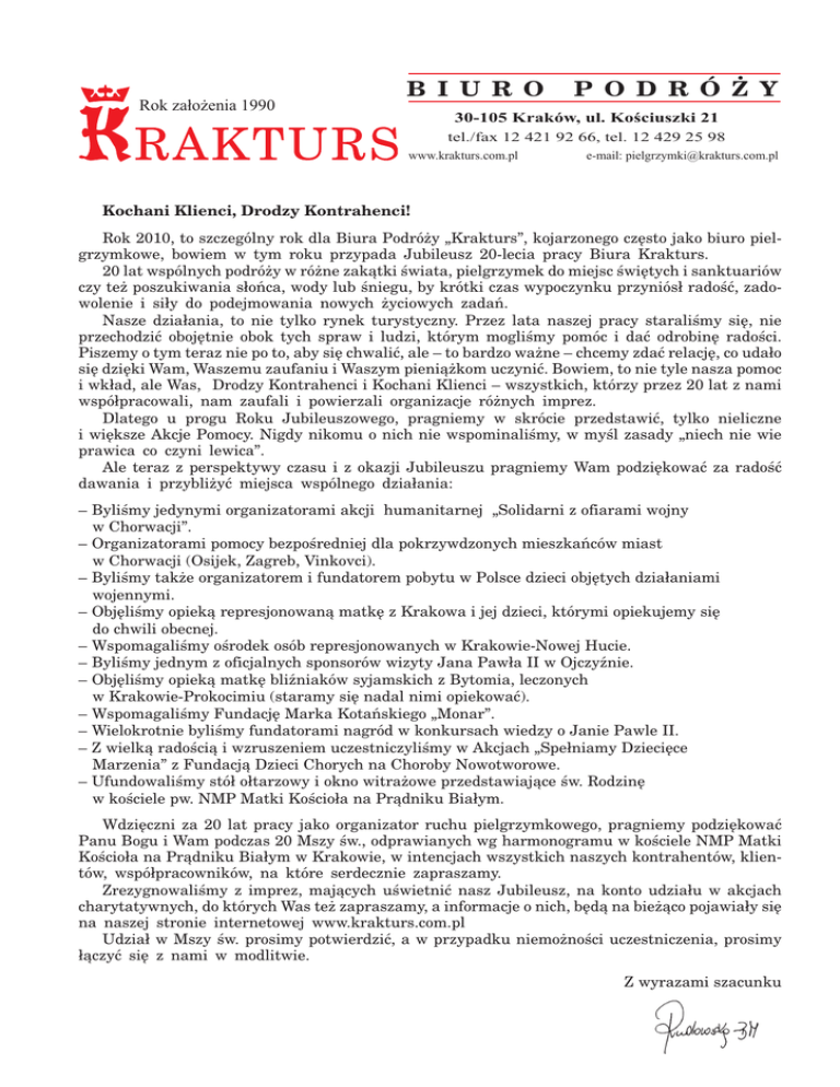 Rok założenia 1990 B I U R O P O D R Ó Ż Y 30-105 Kraków, ul. Kościuszki 21 tel./fax 12 421 92 66, tel. 12 429 25 98 www.krakturs.com.pl e-mail: [email protected] Kochani Klienci, Drodzy Kontrahenci! Rok 2010, to szczególny rok dla Biura Podróży „Krakturs”, kojarzonego często jako biuro pielgrzymkowe, bowiem w tym roku przypada Jubileusz 20-lecia pracy Biura Krakturs. 20 lat wspólnych podróży w różne zakątki świata, pielgrzymek do miejsc świętych i sanktuariów czy też poszukiwania słońca, wody lub śniegu, by krótki czas wypoczynku przyniósł radość, zadowolenie i siły do podejmowania nowych życiowych zadań. Nasze działania, to nie tylko rynek turystyczny. Przez lata naszej pracy staraliśmy się, nie przechodzić obojętnie obok tych spraw i ludzi, którym mogliśmy pomóc i dać odrobinę radości. Piszemy o tym teraz nie po to, aby się chwalić, ale – to bardzo ważne – chcemy zdać relację, co udało się dzięki Wam, Waszemu zaufaniu i Waszym pieniążkom uczynić. Bowiem, to nie tyle nasza pomoc i wkład, ale Was, Drodzy Kontrahenci i Kochani Klienci – wszystkich, którzy przez 20 lat z nami współpracowali, nam zaufali i powierzali organizacje różnych imprez. Dlatego u progu Roku Jubileuszowego, pragniemy w skrócie przedstawić, tylko nieliczne i większe Akcje Pomocy. Nigdy nikomu o nich nie wspominaliśmy, w myśl zasady „niech nie wie prawica co czyni lewica”. Ale teraz z perspektywy czasu i z okazji Jubileuszu pragniemy Wam podziękować za radość dawania i przybliżyć miejsca wspólnego działania: – Byliśmy jedynymi organizatorami akcji humanitarnej „Solidarni z ofiarami wojny w Chorwacji”. – Organizatorami pomocy bezpośredniej dla pokrzywdzonych mieszkańców miast w Chorwacji (Osijek, Zagreb, Vinkovci). – Byliśmy także organizatorem i fundatorem pobytu w Polsce dzieci objętych działaniami wojennymi. – Objęliśmy opieką represjonowaną matkę z Krakowa i jej dzieci, którymi opiekujemy się do chwili obecnej. – Wspomagaliśmy ośrodek osób represjonowanych w Krakowie-Nowej Hucie. – Byliśmy jednym z oficjalnych sponsorów wizyty Jana Pawła II w Ojczyźnie. – Objęliśmy opieką matkę bliźniaków syjamskich z Bytomia, leczonych w Krakowie-Prokocimiu (staramy się nadal nimi opiekować). – Wspomagaliśmy Fundację Marka Kotańskiego „Monar”. – Wielokrotnie byliśmy fundatorami nagród w konkursach wiedzy o Janie Pawle II. – Z wielką radością i wzruszeniem uczestniczyliśmy w Akcjach „Spełniamy Dziecięce Marzenia” z Fundacją Dzieci Chorych na Choroby Nowotworowe. – Ufundowaliśmy stół ołtarzowy i okno witrażowe przedstawiające św. Rodzinę w kościele pw. NMP Matki Kościoła na Prądniku Białym. Wdzięczni za 20 lat pracy jako organizator ruchu pielgrzymkowego, pragniemy podziękować Panu Bogu i Wam podczas 20 Mszy św., odprawianych wg harmonogramu w kościele NMP Matki Kościoła na Prądniku Białym w Krakowie, w intencjach wszystkich naszych kontrahentów, klientów, współpracowników, na które serdecznie zapraszamy. Zrezygnowaliśmy z imprez, mających uświetnić nasz Jubileusz, na konto udziału w akcjach charytatywnych, do których Was też zapraszamy, a informacje o nich, będą na bieżąco pojawiały się na naszej stronie internetowej www.krakturs.com.pl Udział w Mszy św. prosimy potwierdzić, a w przypadku niemożności uczestniczenia, prosimy łączyć się z nami w modlitwie. Z wyrazami szacunku Rok założenia 1990 B I U R O P O D R Ó Ż Y 30-105 Kraków, ul. Kościuszki 21 tel./fax 12 421 92 66, tel. 12 429 25 98 www.krakturs.com.pl Prosimy o potwierdzenie uczestnictwa we Mszy św. [email protected] [email protected] [email protected] [email protected] tel. 12 421 92 66 tel. 12 429 25 98 kom. 509 610 909 e-mail: [email protected]