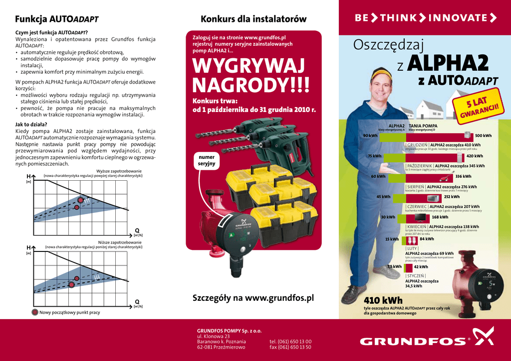 Funkcja AUTOAdapt Konkurs dla instalatorów Czym jest funkcja AUTOADAPT? Wynaleziona i opatentowana przez Grundfos funkcja AUTOADAPT: • automatycznie reguluje prędkość obrotową, • samodzielnie dopasowuje pracę pompy do wymogów instalacji, • zapewnia komfort przy minimalnym zużyciu energii. W pompach ALPHA2 funkcja AUTOADAPT oferuje dodatkowe korzyści: • możliwości wyboru rodzaju regulacji np. utrzymywania stałego ciśnienia lub stałej prędkości, • pewność, że pompa nie pracuje na maksymalnych obrotach w trakcie rozpoznania wymogów instalacji. Jak to działa? Kiedy pompa ALPHA2 zostaje zainstalowana, funkcja AUTOADAPT automatycznie rozpoznaje wymagania systemu. Następnie nastawia punkt pracy pompy nie powodując przewymiarowania pod względem wydajności, przy jednoczesnym zapewnieniu komfortu cieplnego w ogrzewanych pomieszczeniach. H Zaloguj sie na stronie www.grundfos.pl rejestruj numery seryjne zainstalowanych pomp Alpha2 i... Wygrywaj nagrody!!! Oszczędzaj z ALPHA2 z AUTOAdapt 5 LATNCJI! Konkurs trwa: od 1 października do 31 grudnia 2010 r. RA GWA alpha2 tania pompa klasy energetycznej A klasy energetycznej D 90 kWh 500 kWh | grudzień | ALPHA2 oszczędza 410 kWh zmywarka pracuje 30 godz. każdego miesiąca przez pół roku 75 kWh numer seryjny 420 kWh | paŹdziernik | ALPHA2 oszczędza 345 kWh to 3 miesiące ciągłej pracy chłodziarki Wyższe zapotrzebowanie (nowa charakterystyka regulacji powyżej starej charakterystyki) 60 kWh 336 kWh [m] | sierpień | ALPHA2 oszczędza 276 kWh kosiarka 2 godz. dziennie kosi trawe przez 7 miesięcy 45 kWh 252 kWh | czerwiec | ALPHA2 oszczędza 207 kWh kuchenka mikrofalowa pracuje 1 godz. dziennie przez 5 miesięcy 30 kWh Q to tyle ile mocy zużywa telewizor pracujący 9 godz. dziennie przez 207 dni w roku [m3/h] H 168 kWh | kwiecień | ALPHA2 oszczędza 138 kWh 15 kWh Niższe zapotrzebowanie (nowa charakterystyka regulacji poniżej starej charakterystyki) 84 kWh | LUTY | ALPHA2 oszczędza 69 kWh [m] tyle zużywaja 2 świetlówki kompaktowe przez cały miesiąc 7,5 kWh 42 kWh | STYCZEŃ | ALPHA2 oszczędza 34,5 kWh Q Szczegóły na www.grundfos.pl [m3/h] 410 kWh tyle oszczędza ALPHA2 AUTOAdapt przez cały rok dla gospodarstwa domowego Nowy początkowy punkt pracy GRUNDFOS POMPY Sp. z o.o. ul. Klonowa 23 Baranowo k. Poznania 62-081 Przeźmierowo tel. (061) 650 13 00 fax (061) 650 13 50 Pompy obiegowe do małych instalacji ciepłowniczych Grundfos ALPHA2 Unikalne cechy pompy ALPHA2 5 LAT GWARANCJI! ● AUTOADAPT – optymalne dostrojenie pompy do instalacji, jeszcze większe oszczędności energii, ● silnik z magnesem trwałym – wysoka sprawność, pewne uruchomienie, ● wyświetlacz poboru mocy – wizualizacja znikomych opłat za energię elektryczną, ● kompaktowa budowa – łatwy montaż w ograniczonej przestrzeni. Dane techniczne Wydajność, Q : do 2,6 m3/h Wysokość podn., H: 6m Tempertatura cieczy: +2°C do +110°C Ciśnienie robocze:Maks. 10 bar Pobór mocy: 5 W do 45 W Obroty:Zmienne i stałe (biegi I-III) Przyłącza: Śrubunek Długość montażowa: 130 do 180 mm Korpus pompy: Żeliwo, stal nierdzewna Pole pracy p [kPa] 60 50 H [m] GRUNDFOS ALPHA2 6 Dyrektywa Unii Europejskiej Zgodnie z odpowiednią Dyrektywą Unii Europejskiej, od 2013 r. nie będzie można sprzedawać pomp obiegowych i cyrkulacyjnych o niskich i standardowych klasach energetycznych. Od roku 2015 r. będzie można instalować tylko „inteligentne” pompy o regulo wanej prędkości obrotowej i wysokiej sprawności. 5 40 4 30 3 20 2 AL AL P 10 1 0 0 0.0 0.0 0.4 0.8 0 .2 1. 2 1. 6 0.4 AL H A2 2.0 X X -4 0 2.4 0 .6 PH A2 XX PH A2 XX -60 -5 0 2.8 Q [m³/h] 0.8 Q [l/s] Niezawodność Energooszczędność Prosty montaż PRZEGLĄD FUNKCJI oraz CECH Funkcja / cecha UPS seria 100 ALPHA2 Automatyczna regulacja prędkości • AUTOADAPT • Wyświetlacz poboru mocy • Ręczny wybór prędkości (biegi) • • Wtyczka ALPHA • Silnik z magnesem trwałym • Automatyczny tryb redukcji nocnej • Korpus pompy ze stali nierdzewnej • Korpus pompy z brązu • Korpus pompy z separatorem powietrza • • •