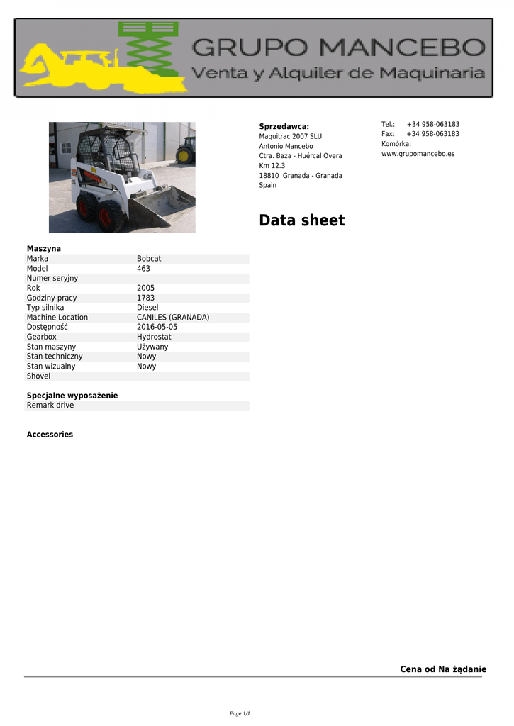 Sprzedawca: Maquitrac 2007 SLU Antonio Mancebo Ctra. Baza - Huércal Overa Km 12.3 18810 Granada - Granada Spain Tel.: +34 958-063183 Fax: +34 958-063183 Komórka: www.grupomancebo.es Data sheet Maszyna Marka Model Numer seryjny Rok Godziny pracy Typ silnika Machine Location Dostępność Gearbox Stan maszyny Stan techniczny Stan wizualny Shovel Bobcat 463 2005 1783 Diesel CANILES (GRANADA) 2016-05-05 Hydrostat Używany Nowy Nowy Specjalne wyposażenie Remark drive Accessories Cena od Na żądanie Page 1/1