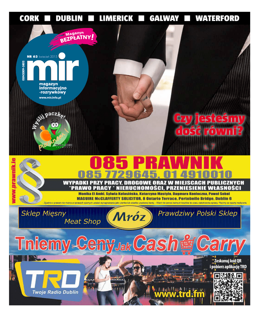 CORK n DUBLIN n LIMERICK n GALWAY n WATERFORD ISSN2009-3802 NR 63 kwiecień 2015 Czy jesteśmy dość równi? s. 7 W OBIE STRONY ¬¬ W subiektywie Czerwińskiego s. 4 ¬¬ Zima wasza, wiosna nasza... s. 6 POLITYKA Czy jesteśmy dość równi? s. 7 STYL ŻYCIA Wesoły autobus s. 8 ¬¬ 7 ¬¬ ZDROWIE Paranoja – największy wróg paranoika ¬¬ BĘDZIE SIĘ DZIAŁO Zapowiedzi koncertów ¬¬ 8 15 s. 10 s. 14–15 PRZYBORNIK Nowy system opłat za wodę s. 17 ¬¬ Wracają loty na trasie Dublin – Lublin s. 17 ¬¬ ROZRYWKA ¬¬ Czytelnia ¬¬ Krzyżówka ¬¬ Horoskop ¬¬ Uśmiechnijj się s. 18 s. 19 s. 19 s. 19 ZIELONA KUCHNIA Warto być czujnym ¬¬ Zrób to dobrze! s. 20 s. 20 ¬¬ OD REDAKCJI: Czytelniczko i Czytelniku, czy zastanawialiście się kiedyś, czy demokracja ma jeszcze jakiś sens? Czy rozważaliście ewentualność, że kraj, w którym żyjecie nie jest demokratycznie rządzony? Czy mieliście kiedyś cień wątpliwości, że demokracja nie jest wcale idealnym systemem rządów? Bo przecież tak naprawdę jest ona całkiem młoda, a przez wieki ludzkość i liczne cywilizacje jakoś się bez niej obchodziły. I nieprawda, że demokracja została wymyślona w starożytnej Grecji. Tam została wymyślona republika, gdzie aby móc dostąpić zaszczytu wybierania władzy, należało być obywatelem. A obywatelem nie stawał się każdy, kto chciał, czy tylko z racji urodzenia. Obywatelami byli mieszkańcy miast-państw, którzy byli świadomi swoich praw, ale przede wszystkim obowiązków wobec współobywateli. Dziś zapomniano już o tych ideałach i w imię, źle trochę pojmowanej, sprawiedliwości głos w demokracji daje się każdemu, choćby otwarcie mówił, że państwo, naród czy inni ludzie go wcale nie obchodzą. Głosować może każdy, nawet ten, który nie ma pojęcia o tym, kogo i dlaczego wybiera. Co gorsza, wybranym może być każdy, choćby nie miał za grosz kwalifikacji do rządzenia krajem. Demokracja w założeniu miała dać możliwość wyboru swoich przedstawicieli każdemu obywatelowi. Niestety, w praktyce dała taką możliwość także tym, którzy nie czują się obywatelami, a czasami nawet nie wiedzą, co to pojęcie znaczy. Bo przecież każde głosowanie to wielka odpowiedzialność, znacznie większa niż ta przy wyborze zwycięzcy „Tańca z gwiazdami” czy innego popularnego teleturnieju. To odpowiedzialność za to, jak wyglądać będzie nasze miasto czy nasz kraj za 5 lat, to wreszcie, mówiąc bardzo górnolotnie, odpowiedzialność za to, w jakim kraju będą mieszkać nasze dzieci, a może czy w ogóle będą mieszkać w tym kraju, co i my. Już niedługo wielu z Was wybierze prezydenta Polski i, abstrahując od tego, czy emigranci powinni w ogóle głosować, bo to temat na inną dyskusję, warto, żeby był to wybór świadomy i odpowiedzialny. A najważniejsze, by był taki, żeby się go nie wstydzić przez nadchodzące lata. Czego sobie, głosującym oraz niegłosującym, życzymy z całego serca. Redakcja MUZYKA, KTÓRA ZMIENIA ŻYCIE ¬¬ Trzy razy dwa s. 21 SPORT ¬¬ Remis kochajmy jak Irlandię s. 22 17 21 Wydawca: Mir Press Limited 2 nd Floor Office, 4 Washington Street Cork Redakcja: e-mail: [email protected] www.mir.info.pl Redaktor naczelny: Dariusz Trela Sekretarz redakcji: Marta Luksander Reklama: e-mail: [email protected] Agnieszka Gregorczyk Piotr Czerwiński Zespół redakcyjny: Ewelina Mucha Piotr Słotwiński Krzysztof Wiśniewski Maciej Weber Anna Leszczyńska Korekta: Monika Szeszko Widget (Mosor Marek) Studio graficzne: e-mail: [email protected] DTP: Tomasz Kuc MIR Press LTD nie ponosi odpowiedzialności za treść ogłoszeń, reklam i informacji. Redakcja nie zwraca materiałów nie zamówionych i zastrzega sobie prawo do skracania i redagowania tekstów. Nadesłane materiały przechodzą na własność redakcji, co jednocześnie oznacza przeniesienie na redakcję „Mir Press LTD” praw autorskich z prawem do publikacji w każdym obszarze. Przedruk materiałów publikowanych w magazynie „Mir Press LTD” możliwy tylko za zgodą redakcji. strona 3 mir | kwiecień 2015 NAZWA STRONY W OBIE DZIAŁU W sczyliubiektywie opowieści dziwnej treści Czerwińskiego Babcia w ciąży, czyli fiesta TT Zamierzałem tradycyjnie zacząć od tego, że świat oszalał i dzieją się na nim niesamowite rzeczy, ale zamierzam rozpocząć nową tradycję zaczynania od tego, że już nie będę od tego zaczynał. Zresztą, podobno prawdziwego faceta poznaje się po tym, jak kończy, choć ja kończę adresem swojej strony w Internecie, to i nie umiem się wypowiedzieć, czy to jakieś specjalnie mózgobijne osiągnięcie. A teraz przejdźmy do wiadomości. TT Z własnego podwórka nadeszła wieść piorunująca: jednak będą opłaty za wodę. Pierwszych rachunków należy się spodziewać między kwietniem a czerwcem, czyli teraz. Należy się też spodziewać, że będzie z tego niezła zadyma, bo póki co, ludzie wychodzili z tej przyczyny na ulicę przed wejściem tych opłat, toteż zapewnie nie spoczną na laurach po ich wprowadzeniu. No trudno. TT Inna wieść, dużo mniej radosna, jest taka, że przez całe święta słońce świeciło jak najęte i nie przestało jeszcze przez tydzień, i wszyscy, którym opowiadam o legendarnej irlandzkiej pogodzie, a którzy przybyli akurat w te strony, uznali, że najprawdopodobniej robiłem ich latami w balona, no bo przecież tutaj jest tak pięknie, a na drzewie nie drgnie nawet listek, a ja tu plotę legendy o deszczu padającym poziomo przez całe tygodnie i o wichurach bujających samochodami. No jakże tak można pociskać takie bajki. TT Jeszcze inna wieść, tym razem całkiem dobra, jest taka, że wciąż jesteśmy popularni w polskich mediach; odwiedził mnie niedawno reporter polskiego „Newsweeka”, z okazji obszernego materiału na temat irlandzkiej Polonii, opublikowanego w marcu, gdzie znalazł się i ustęp poświęcony mojej skromnej osobie, co mnie zasa