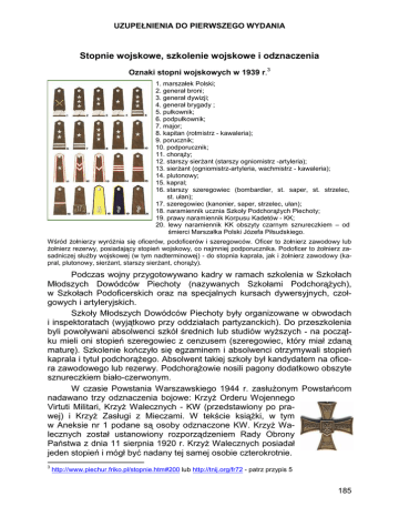 UZUPEŁNIENIA DO PIERWSZEGO WYDANIA Stopnie wojskowe, szkolenie wojskowe i odznaczenia Oznaki stopni wojskowych w 1939 r.3 1. marszałek Polski; 2. generał broni; 3. generał dywizji; 4. generał brygady ; 5. pułkownik; 6. podpułkownik; 7. major; 8. kapitan (rotmistrz - kawaleria); 9. porucznik; 10. podporucznik; 11. chorąŜy; 12. starszy sierŜant (starszy ogniomistrz -artyleria); 13. sierŜant (ogniomistrz-artyleria, wachmistrz - kawaleria); 14. plutonowy; 15. kapral; 16. starszy szeregowiec (bombardier, st. saper, st. strzelec, st. ułan); 17. szeregowiec (kanonier, saper, strzelec, ułan); 18. naramiennik ucznia Szkoły PodchorąŜych Piechoty; 19. prawy naramiennik Korpusu Kadetów - KK; 20. lewy naramiennik KK obszyty czarnym sznureczkiem – od śmierci Marszałka Polski Józefa Piłsudskiego. Wśród Ŝołnierzy wyróŜnia się oficerów, podoficerów i szeregowców. Oficer to Ŝołnierz zawodowy lub Ŝołnierz rezerwy, posiadający stopień wojskowy, co najmniej podporucznika. Podoficer to Ŝołnierz zasadniczej słuŜby wojskowej (w tym nadterminowej) - do stopnia kaprala, jak i Ŝołnierz zawodowy (kapral, plutonowy, sierŜant, starszy sierŜant, chorąŜy). Podczas wojny przygotowywano kadry w ramach szkolenia w Szkołach Młodszych Dowódców Piechoty (nazywanych Szkołami PodchorąŜych), w Szkołach Podoficerskich oraz na specjalnych kursach dywersyjnych, czołgowych i artyleryjskich. Szkoły Młodszych Dowódców Piechoty były organizowane w obwodach i inspektoratach (wyjątkowo przy oddziałach partyzanckich). Do przeszkolenia byli powoływani absolwenci szkół średnich lub studiów wyŜszych - na początku mieli oni stopień szeregowiec z cenzusem (szeregowiec, który miał zdaną maturę). Szkolenie kończyło się egzaminem i absolwenci otrzymywali stopień kaprala i tytuł podchorąŜego. Absolwent takiej szkoły był kandydatem na oficera zawodowego lub rezerwy. PodchorąŜowie nosili pagony dodatkowo obszyte sznureczkiem biało-czerwonym. W czasie Powstania Warszawskiego 1944 r. zasłuŜonym Powstańcom nadawano trzy odznaczenia bojowe: KrzyŜ Orderu Wojennego Virtuti Militari, KrzyŜ Walecznych - KW (przedstawiony po prawej) i KrzyŜ Zasługi z Mieczami. W tekście ksiąŜki, w tym w Aneksie nr 1 podane są osoby odznaczone KW. KrzyŜ Walecznych został ustanowiony rozporządzeniem Rady Obrony Państwa z dnia 11 sierpnia 1920 r. KrzyŜ Walecznych posiadał jeden stopień i mógł być nadany tej samej osobie czterokrotnie. 3 http://www.piechur.friko.pl/stopnie.htm#200 lub http://tnij.org/fr72 - patrz przypis 5 185