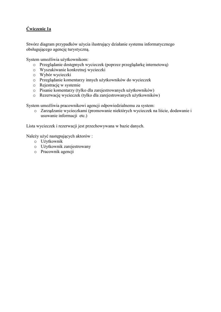Ćwiczenie 1a Stwórz diagram przypadków uŜycia ilustrujący działanie systemu informatycznego obsługującego agencję turystyczną. System umoŜliwia uŜytkownikom: o Przeglądanie dostępnych wycieczek (poprzez przeglądarkę internetową) o Wyszukiwanie konkretnej wycieczki o Wybór wycieczki o Przeglądanie komentarzy innych uŜytkowników do wycieczek o Rejestrację w systemie o Pisanie komentarzy (tylko dla zarejestrowanych uŜytkowników) o Rezerwację wycieczek (tylko dla zarejestrowanych uŜytkowników) System umoŜliwia pracownikowi agencji odpowiedzialnemu za system: o Zarządzanie wycieczkami (promowanie niektórych wycieczek na liście, dodawanie i usuwanie informacji etc.) Lista wycieczek i rezerwacji jest przechowywana w bazie danych. NaleŜy uŜyć następujących aktorów : o UŜytkownik o UŜytkownik zarejestrowany o Pracownik agencji Ćwiczenie 1b Stwórz diagram przypadków uŜycia ilustrujący działanie systemu informatycznego obsługującego hotel. System umoŜliwia gościom hotelowym: o Wyszukiwanie wolnych pokoi o Rejestrację w systemie o Rezerwowanie pokoju (tylko dla zarejestrowanych uŜytkowników). UŜytkownik moŜe wykonać maksymalnie dwie rezerwacje. o Potwierdzenie rezerwacji o Anulowanie rezerwacji o Płatność karta kredytową bądź przelewem System umoŜliwia gościom hotelowym o statusie VIP: o Wykonywanie dowolnej liczby rezerwacji System umoŜliwia menadŜerowi hotelu: o Modyfikowanie rezerwacji (konieczność poinformowania gości) o Usuwanie pokoju z listy o Dodawanie pokoju o Zmiana informacji nt. pokoju o Aprobowanie zniŜek dla dłuŜszych pobytów System przechowuje informacje o pokojach i rezerwacjach w bazie danych oraz obsługuje zewnętrzne metody płatności (karta kredytowa, przelew)