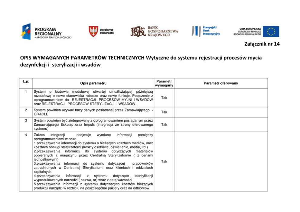 Załącznik nr 14 OPIS WYMAGANYCH PARAMETRÓW TECHNICZNYCH Wytyczne do systemu rejestracji procesów mycia dezynfekcji i sterylizacji i wsadów L.p. Opis parametru Parametr wymagany System o budowie modułowej otwartej umożliwiającej późniejszą rozbudowę o nowe stanowiska robocze oraz nowe funkcje. Połączenie z oprogramowaniem do REJESTRACJI PROCESÓW MYJNI I WSADÓW oraz REJESTRACJI PROCESÓW STERYLIZACJI I WSADÓW. Tak 2 System powinien używać bazy danych posiadanej przez Zamawiającego ORACLE Tak 3 System powinien być zintegrowany z oprogramowaniem posiadanym przez Zamawiającego Eskulap oraz Impuls (integracja ze strony oferowanego systemu) Tak Zakres integracji obejmuje wymianę informacji pomiędzy oprogramowaniami w celu: 1.przekazywania informacji do systemu o bieżących kosztach mediów, oraz kosztach obsługi sterylizatorni (koszty osobowe, oświetlenie, media, itd.) 2.przekazywania informacji do systemu dotyczących materiałów pobieranych z magazynu przez Centralną Sterylizatornię ( z cenami jednostkowymi) 3.przekazywania informacji do systemu dotyczącej pracowników zatrudnionych w Centralnej Sterylizatorni oraz klientach i oddziałach szpitalnych 4.przekazywania informacji z systemu dotyczące identyfikacji wyprodukowanych narzędzi ( nazwa, nr) wraz z datą ważności 5.przekazywania informacji z systemu dotyczących kosztów bieżących produkcji narządzi w rozbiciu na poszczególne pakiety oraz na odbiorców Tak 1 4 Parametr oferowany 6.przekazywania informacji dotyczącej cen wyliczanych przez moduł kosztów systemu produkowanych narzędzi 7.przekazywania z systemu bilingów dotyczących poszczególnych odbiorców 8.przekazywania z systemu danych pakietu do modułu obsługi zabiegów systemu szpitalnego Tworzenie własnych zapytań/reguł w oprogramowaniu, mających na celu potwierdzenie spełnienia określonych procedur obowiązujących w procesie sterylizacji przez pracujący personel, na które odpowiedzi są rejestrowane w oprogramowaniu ( po zweryfikowaniu, program powinien umożliwiać dalsze prowadzenie prac bądź też je blokować). Tak 6 Obsługa oprogramowania w języku polskim, komunikaty wyświetlane na ekranach systemu w języku polskim. Tak 7 Zdalna pomoc dla użytkowników (zdalny pulpit) Tak 8 Oprogramowanie ma być przystosowane do stosowania równolegle trzech metod wprowadzania danych przez pracowników obsługujących sterylizatory - przy pomocy ekranów dotykowych, - skanerów - myszy i klawiatury Tak 9 Przedstawienie informacji w postaci dźwiękowej istotnych informacji dotyczących artykułów oraz ich obróbki. (sygnały ostrzegawcze) Tak 10 Praca personelu wymagająca logowania personelu, a zakres uprawnień i wykonywane zadania archiwizowane z uwzględnieniem daty i godziny ich wykonania Tak System rejestrujący procesy obróbki narzędzi i sprzętu w obrębie Centralnej Sterylizatorni z przypisaniem wykonywanych czynności do personelu fizycznie go wykonującego Tak 12 System umożliwiający archiwizowanie danych oraz ich odtwarzanie Tak 13 Budowa umożliwiająca dalszą automatyczną pracę bez konieczności wprowadzania danych ręcznie w przypadku awarii hardwer’a bez użycia aplikacji administracyjnej 5 11 14 Oznakowanie tac narzędziowych i kontenerów narzędziowych pozwalające na identyfikację narzędzi na etapie ich obróbki w Centralnej Sterylizatorni Tak Tak 15 Automatyczne generowanie (format A4) protokołów przyjęć i wydań materiału poddawanego obróbce w Centralnej Sterylizatorni Tak 16 Dokumentacja przyjęcia materiału do Centralnej Sterylizatorni, dokumentacja wydania na zewnątrz oraz praca na stanowiskach w oparciu o używanie skanerów kodów kreskowych Tak 17 Tworzenie bilingu do faktur dla odbiorców Zamawiającego w oparciu o automatycznie wyliczane w systemie kosztów obróbki danych narzędzi Tak 18 Wyliczanie kosztów uwzględniające: amortyzację, koszty mycia i dezynfekcji w zależności od wielkości pakietu, koszty sterylizacji w zależności od wielkości pakietu, koszty materiałów opakowaniowych zewnętrznych i wewnętrznych, koszty testów, koszty czasu obróbki osobowej. 19 Eliminacja błędu wydania nie wysterylizowanych, przeterminowanych lub obarczonych błędem artykułów do odbiorcy 20 Przedstawianie w postaci zdjęć wyglądu danych narzędzi czy ułożenia zestawów, w tym przedstawienie krótkich filmów dotyczących procedury obróbki ( np. przygotowania do sterylizacji) 21 22 23 26 Możliwość użycia wszystkich polskich znaków diakrytycznych we wprowadzanych nazwach przedmiotów, które wykorzystuje system i drukowanych na etykietach Budowa systemu umożliwiająca dalszą automatyczną pracę bez konieczności wprowadzania danych ręcznie w przypadku awarii hardwer’a, bez użycia aplikacji administracyjnej. Dodatkowo system ma zawierać system pracy ręcznej umożliwiający pracę w przypadku awarii ulokowany w aplikacji administracyjnej Tak Tak Tak Tak Tak Monitorowanie temperatury, ciśnienia i wilgotności w trzech strefach technologicznych Centralnej Sterylizatorni oraz ich prezentacja na ekranie komputera administratora. System alarmów informujący o niewłaściwych wielkościach Rejestracja w bezpiecznej formie. Tak Pobieranie materiałów zużywalnych z magazynu Centralnej Sterylizatorni wg kolejki FIFO. Tak Możliwość tworzenia cennika produktów w oparciu o ekwiwalentne koszty materiałów oraz koszty procesów technologicznych i koszty godzinowe pracy sterylizatorni, uwzględnianie objętości narzędzi. Tak Możliwość wyliczania bieżących kosztów produktów w oparciu o ekwiwalentne koszty materiałów oraz koszty procesów ( uwzględniające rzeczywisty stan załadowania maszyn). Tak System posiada możliwość skanowania kodów 2D DPM w celu kontroli i weryfikacji składów zestawów. Oprogramowanie umożliwia weryfikację podczas pakowania. Tak 30 System zachowuje wersjonowanie narzędzi w zależności od zmian wprowadzonych w składzie czy tec