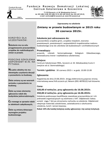 Zapraszamy na szkolenie Zmiany w prawie budowlanym w 2015 roku 30 czerwca 2015r. KORZYŚCI DLA UCZESTNIKÓW : Szkolenie ma na celu Szkolenie jest adresowane do: pracowników urzędów gmin, urzędów miejskich, starostw powiatowych, powiatowych i wojewódzkich inspektoratów nadzoru budowlanego oraz do członków izb budowlanych i architektonicznych przygotowanie pracowników urzędów do nadchodzących Prowadzący: zmian w prawie. prawnik, członek Samorządowego Kolegium doświadczony trener i wykładowca szkoleniowy. Odwoławczego, PODCZAS SZKOLENIA Miejsce: ODPOW IEMY M.IN. NA Centrum Szkoleniowe FRDL, Szczecin ul. M. Skłodowskiej-Curie 4 PYTANIA: (wejście od ul. Siemiradzkiego) Na jakie obiekty nie ma Termin i godzina: 30 czerwca 2015 r. w godz. 10.00-15.00 obowiązku uzyskania decyzji o pozwoleniu na budowę; Zgłoszenia: Jakie zmiany są we wzorach Najpóźniej do dnia 23.06.2015r. drogą elektroniczną poprzez stronę internetową www.frdl.szczecin.pl, faksem (091 4878522) lub listownie. wniosku o pozwolenie na budowę; Jakie są nowe elementy zgłoszenia robót dla budynków jednorodzinnych; Co nowego w sprawie robót w obiektach zabytkowych; Jakie są zmiany dotyczące wymogów projektu budowlanego. Cena: 320,00 zł netto/os. przy zgłoszeniu do 16.06.2015r. 350,00 zł netto/os. przy zgłoszeniu po 16.06.2015r. Szkolenia podnoszące kwalifikacje zawodowe pracowników jst i ich jednostek organizacyjnych są zwolnione z VAT. Odpłatność należy wnieść ciągu 7 dni po otrzymaniu rachunku za szkolenie. Odpłatność obejmuje materiały szkoleniowe, zaświadczenia o ukończeniu szkolenia, lunch i serwis kawowy. Rabat 10% dla każdej kolejnej osoby zgłoszonej z tej samej instytucji. Program szkolenia: 1. Usprawnienia procesu budowlanego poprzez zniesienie obowiązku uzyskania decyzji o pozwoleniu na budowę w stosunku do niektórych obiektów budowlanych – aspekty prawne i praktyczne. 2. Procedury poprzedzające rozpoczęcie robót budowlanych. 3. Zmiany na liście robót niewymagających pozwolenia na budowę i konsekwencje tych zmian. 4. Zmiany na liście budów niewymagających pozwolenia na budowę w małej nowelizacji Prawa budowlanego. 5. Pozwolenia na budowę: wykonalność decyzji o pozwoleniu na budowę odstępstwo od przepisów techniczno-budowlanych zmiany we wzorach wniosku o pozwolenie na budowę i rozbiórkę w małej nowelizacji Prawa budowlanego zmiany w procedurach pozwolenia na budowę w małej nowelizacji Prawa budowlanego roboty w obiektach wpisanych do rejestru zabytków i na obszarach wpisanych do rejestru zabytków na pozwolenie na budowę. • • • • • 6. • • • • • • • 7. Zgłoszenie robót: nowe elementy zgłoszenia dla budynków jednorodzinnych milcząca zgoda wniesienie sprzeciwu rejestr zgłoszeń nałożenie obowiązku uzyskania pozwolenia na budowę termin ważności zgłoszenia przenoszenie zgłoszenia na rzecz innej osoby Projekt budowlany: • zakres projektu budowlanego • zakres sprawdzenia projektu budowlanego przed wydaniem pozwolenia na budowę • wprowadzenie wymogu wyznaczenia obszaru oddziaływania dla budynków jednorodzinnych 8. • • • • Oddanie obiektu do użytkowania wymagalność zawiadomienia i zmiana terminu milczącej zgody wymagalność pozwolenia na użytkowanie zmian listy obiektów wymagających pozwolenia na użytkowanie dokumenty niezbędne w postępowaniu