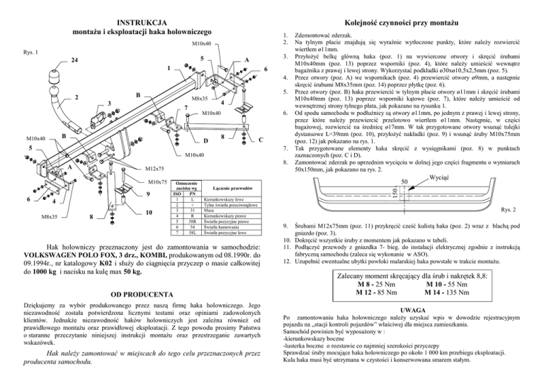 INSTRUKCJA montaŜu i eksploatacji haka holowniczego Kolejność czynności przy montaŜu 1. 2. M10x40 Rys. 1 5 24 3. A 1 6 4. 5. B 2 M8x35 3 7 B M10x40 4 6. M10x40 D 8 C 5 7. M10x40 8. A M12x75 6 9 4 M8x35 8 10 Oznaczenie zacisku wg ISO PN 1 L 2 + 3 31 4 R 5 58R 6 54 7 58L 50 Łączenie przewodów Kierunkowskazy lewe Tylne światła przeciwmgłowe Masa Kierunkowskazy prawe Światła pozycyjne prawe Światła hamowania Światła pozycyjne lewe Hak holowniczy przeznaczony jest do zamontowania w samochodzie: VOLKSWAGEN POLO FOX, 3 drz., KOMBI, produkowanym od 08.1990r. do 09.1994r., nr katalogowy K02 i słuŜy do ciągnięcia przyczep o masie całkowitej do 1000 kg i nacisku na kulę max 50 kg. OD PRODUCENTA Dziękujemy za wybór produkowanego przez naszą firmę haka holowniczego. Jego niezawodność została potwierdzona licznymi testami oraz opiniami zadowolonych klientów. JednakŜe niezawodność haków holowniczych jest zaleŜna równieŜ od prawidłowego montaŜu oraz prawidłowej eksploatacji. Z tego powodu prosimy Państwa o staranne przeczytanie niniejszej instrukcji montaŜu oraz przestrzeganie zawartych wskazówek. Hak naleŜy zamontować w miejscach do tego celu przeznaczonych przez producenta samochodu. Wyciąć 150 M10x75 Zdemontować zderzak. Na tylnym płacie znajdują się wyraźnie wytłoczone punkty, które naleŜy rozwiercić wiertłem ø11mm. PrzyłoŜyć belkę główną haka (poz. 1) na wywiercone otwory i skręcić śrubami M10x40mm (poz. 13) poprzez wsporniki (poz. 4), które naleŜy umieścić wewnątrz bagaŜnika z prawej i lewej strony. Wykorzystać podkładki ø30xø10,5x2,5mm (poz. 5). Przez otwory (poz. A) we wspornikach (poz. 4) przewiercić otwory ø9mm, a następnie skręcić śrubami M8x35mm (poz. 14) poprzez płytkę (poz. 6). Przez otwory (poz. B) haka przewiercić w tylnym płacie otwory ø11mm i skręcić śrubami M10x40mm (poz. 13) poprzez wsporniki kątowe (poz. 7), które naleŜy umieścić od wewnętrznej strony tylnego płata, jak pokazano na rysunku 1. Od spodu samochodu w podłuŜnicy są otwory ø11mm, po jednym z prawej i lewej strony, przez które naleŜy przewiercić przelotowo wiertłem ø11mm. Następnie, w części bagaŜowej, rozwiercić na średnicę ø17mm. W tak przygotowane otwory wsunąć tulejki dystansowe L=39mm (poz. 10), przyłoŜyć nakładki (poz. 9) i wsunąć śruby M10x75mm (poz. 12) jak pokazano na rys. 1. Tak przygotowane elementy haka skręcić z wysięgnikami (poz. 8) w punktach zaznaczonych (poz. C i D). Zamontować zderzak po uprzednim wycięciu w dolnej jego części fragmentu o wymiarach 50x150mm, jak pokazano na rys. 2. Rys. 2 9. Śrubami M12x75mm (poz. 11) przykręcić cześć kulistą haka (poz. 2) wraz z blachą pod gniazdo (poz. 3). 10. Dokręcić wszystkie śruby z momentem jak pokazano w tabeli. 11. Podłączyć przewody z gniazdka 7- bieg. do instalacji elektrycznej zgodnie z instrukcją fabryczną samochodu (zaleca się wykonanie w ASO). 12. Uzupełnić ewentualne ubytki powłoki malarskiej haka powstałe w trakcie montaŜu. Zalecany moment skręcający dla śrub i nakrętek 8,8: M 8 - 25 Nm M 10 - 55 Nm M 12 - 85 Nm M 14 - 135 Nm UWAGA Po zamontowaniu haka holowniczego naleŜy uzyskać wpis w dowodzie rejestracyjnym pojazdu na „stacji kontroli pojazdów” właściwej dla miejsca zamieszkania. Samochód powinien być wyposaŜony w : -kierunkowskazy boczne -lusterka boczne o rozstawie co najmniej szerokości przyczepy Sprawdzać śruby mocujące haka holowniczego po około 1 000 km przebiegu eksploatacji. Kula haka musi być utrzymana w czystości i konserwowana smarem stałym. PPUH AUTO-HAK S.J. WyposaŜenie haka: Produkcja Haków Holowniczych Henryk & Zbigniew Nejman 76-200 SŁUPSK ul. Słoneczna 16K tel/fax (059) 8-414-414; 8-414-413 E-mail: [email protected] www. autohak.com.pl Hak holowniczy bez wyposaŜenia elektrycznego Klasa: A50-X Nr kat. K02 Przeznaczony do zamontowania w samochodzie: Producent: VOLKSWAGEN Model: POLO Typ: FOX, 3 drz., KOMBI produkowanym od 08.1990r. do 09.1994r. Dane techniczne: Wartość siły D : 5,54 kN maksymalna masa przyczepy: 1000 kg maksymalny nacisk na kulę: 50 kg Numer homologacji zgodnie z wytycznymi regulaminu EKG/ONZ 55.01: KARTA GWARANCYJNA Producent udziela gwarancji niniejszą kartą gwarancyjną na okres 24 miesięcy licząc od dnia zakupu haka holowniczego do samochodu: VOLKSWAGEN POLO FOX 3 drz., KOMBI produkowanego od 08.1990r. do 09.1994r. Data produkcji .............................. Data zakupu............................................. Zakres gwarancji obejmuje wyłącznie wady jakościowe wynikające z winy producenta. Gwarancja nie obejmuje natomiast uszkodzeń zawinionych przez nabywcę, wynikających z niewłaściwego montaŜu, uŜytkowania lub konserwacji, uszkodzeń mechanicznych, normalnego zuŜycia podczas eksploatacji itp. Gwarancja udzielona na zakupiony towar nie wyłącza, nie ogranicza ani nie zawiesza uprawnień kupującego wynikających z niezgodności towaru z umową. Reklamacje naleŜy zgłaszać w punkcie sprzedaŜy, składając jednocześnie kartę gwarancyjną. Usunięcie "wady" następuje po stwierdzeniu przez punkt sprzedaŜy wspólnie z producentem słuszności złoŜonej reklamacji. Reklamacja powinna być załatwiona w ciągu 14 dni od dnia uznania reklamacji. Karta gwarancyjna jest niewaŜna jeŜeli nie jest wypełniona i podpisana. Data zgłoszenia reklamacji: ................................................................... INFORMACJA WSTĘPNA Hak holowniczy jest skonstruowany zgodnie z zasadami bezpieczeństwa ruchu drogowego. Hak holowniczy jest elementem wpływającym na bezpieczeństwo jazdy i moŜe zostać zainstalowany wyłącznie przez personel wyspecjalizowany. Niedopuszczalne jest dokonywanie jakichkolwiek zmian w konstrukcji haka. Powoduje to wygaśniecie dopuszczenia do stosowania. W przypadku obecności masy izolacyjnej lub osłony podwozia w miejscu przylegania haka, naleŜy ją usunąć. Nieosłonięte mie