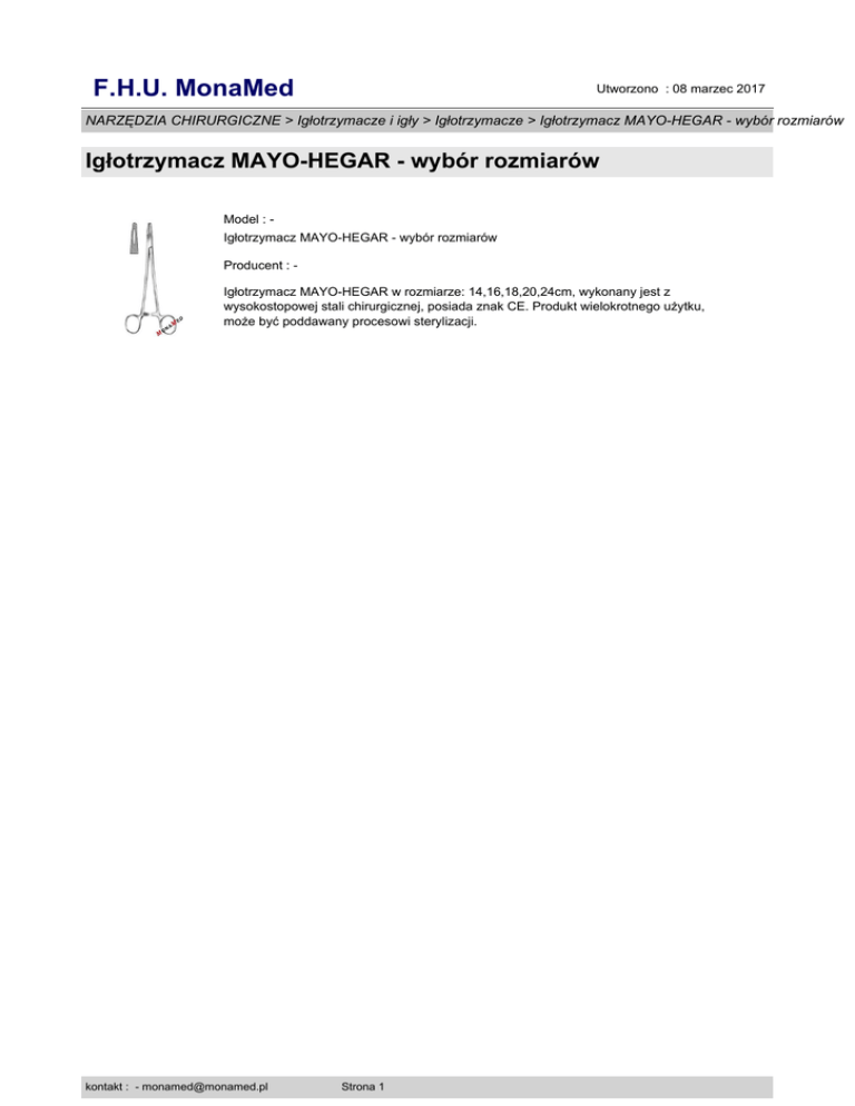 F.H.U. MonaMed Utworzono : 08 marzec 2017 NARZĘDZIA CHIRURGICZNE > Igłotrzymacze i igły > Igłotrzymacze > Igłotrzymacz MAYO-HEGAR - wybór rozmiarów Igłotrzymacz MAYO-HEGAR - wybór rozmiarów Model : Igłotrzymacz MAYO-HEGAR - wybór rozmiarów Producent : Igłotrzymacz MAYO-HEGAR w rozmiarze: 14,16,18,20,24cm, wykonany jest z wysokostopowej stali chirurgicznej, posiada znak CE. Produkt wielokrotnego użytku, może być poddawany procesowi sterylizacji. kontakt : - [email protected] Strona 1 F.H.U. MonaMed Utworzono : 08 marzec 2017 NARZĘDZIA CHIRURGICZNE > Igłotrzymacze i igły > Igłotrzymacze > Igłotrzymacz MAYO-HEGAR - wybór rozmiarów Igłotrzymacz MAYO-HEGAR - wybór rozmiarów kontakt : - [email protected] Strona 2 F.H.U. MonaMed Utworzono : 08 marzec 2017 NARZĘDZIA CHIRURGICZNE > Igłotrzymacze i igły > Igłotrzymacze > Igłotrzymacz MAYO-HEGAR - wybór rozmiarów Igłotrzymacz MAYO-HEGAR - wybór rozmiarów DefSemiHidden="true" DefQFormat="false" DefPriority="99" LatentStyleCount="267"> UnhideWhenUsed="false" QFormat="true" Name="Normal" /> UnhideWhenUsed="false" QFormat="true" Name="heading 1" /> UnhideWhenUsed="false" QFormat="true" Name="Title" /> UnhideWhenUsed="false" QFormat="true" Name="Subtitle" /> UnhideWhenUsed="false" QFormat="true" Name="Strong" /> UnhideWhenUsed="false" QFormat="true" Name="Emphasis" /> UnhideWhenUsed="false" Name="Table Grid" /> UnhideWhenUsed="false" QFormat="true" Name="No Spacing" /> UnhideWhenUsed="false" Name="Light Shading" /> UnhideWhenUsed="false" Name="Light List" /> UnhideWhenUsed="false" Name="Light Grid" /> UnhideWhenUsed="false" Name="Medium Shading 1" /> UnhideWhenUsed="false" Name="Medium Shading 2" /> UnhideWhenUsed="false" Name="Medium List 1" /> UnhideWhenUsed="false" Name="Medium List 2" /> kontakt : - [email protected] Strona 3 F.H.U. MonaMed Utworzono : 08 marzec 2017 NARZĘDZIA CHIRURGICZNE > Igłotrzymacze i igły > Igłotrzymacze > Igłotrzymacz MAYO-HEGAR - wybór rozmiarów Igłotrzymacz MAYO-HEGAR - wybór rozmiarów UnhideWhenUsed="false" Name="Medium Grid 1" /> UnhideWhenUsed="false" Name="Medium Grid 2" /> UnhideWhenUsed="false" Name="Medium Grid 3" /> UnhideWhenUsed="false" Name="Dark List" /> UnhideWhenUsed="false" Name="Colorful Shading" /> UnhideWhenUsed="false" Name="Colorful List" /> UnhideWhenUsed="false" Name="Colorful Grid" /> UnhideWhenUsed="false" Name="Light Shading Accent 1" /> UnhideWhenUsed="false" Name="Light List Accent 1" /> UnhideWhenUsed="false" Name="Light Grid Accent 1" /> UnhideWhenUsed="false" Name="Medium Shading 1 Accent 1" /> UnhideWhenUsed="false" Name="Medium Shading 2 Accent 1" /> UnhideWhenUsed="false" Name="Medium List 1 Accent 1" /> UnhideWhenUsed="false" QFormat="true" Name="List Paragraph" /> UnhideWhenUsed="false" QFormat="true" Name="Quote" /> UnhideWhenUsed="false" QFormat="true" Name="Intense Quote" /> UnhideWhenUsed="false" Name="Medium List 2 Accent 1" /> UnhideWhenUsed="false" Name="Medium Grid 1 Accent 1" /> UnhideWhenUsed="false" Name="Medium Grid 2 Accent 1" /> UnhideWhenUsed="false" Name="Medium Grid 3 Accent 1" /> UnhideWhenUsed="false" Name="Dark List Accent 1" /> UnhideWhenUsed="false" Name="Colorful Shading Accent 1" /> UnhideWhenUsed="false" Name="Colorful List Accent 1" /> UnhideWhenUsed="false" Name="Colorful Grid Accent 1" /> UnhideWhenUsed="false" Name="Light Shading Accent 2" /> UnhideWhenUsed="false" Name="Light List Accent 2" /> UnhideWhenUsed="false" Name="Light Grid Accent 2" /> kontakt : - [email protected] Strona 4 F.H.U. MonaMed Utworzono : 08 marzec 2017 NARZĘDZIA CHIRURGICZNE > Igłotrzymacze i igły > Igłotrzymacze > Igłotrzymacz MAYO-HEGAR - wybór rozmiarów Igłotrzymacz MAYO-HEGAR - wybór rozmiarów UnhideWhenUsed="false" Name="Medium Shading 1 Accent 2" /> UnhideWhenUsed="false" Name="Medium Shading 2 Accent 2" /> UnhideWhenUsed="false" Name="Medium List 1 Accent 2" /> UnhideWhenUsed="false" Name="Medium List 2 Accent 2" /> UnhideWhenUsed="false" Name="Medium Grid 1 Accent 2" /> UnhideWhenUsed="false" Name="Medium Grid 2 Accent 2" /> UnhideWhenUsed="false" Name="Medium Grid 3 Accent 2" /> UnhideWhenUsed="false" Name="Dark List Accent 2" /> UnhideWhenUsed="false" Name="Colorful Shading Accent 2" /> UnhideWhenUsed="false" Name="Colorful List Accent 2" /> UnhideWhenUsed="false" Name="Colorful Grid Accent 2" /> UnhideWhenUsed="false" Name="Light Shading Accent 3" /> UnhideWhenUsed="false" Name="Light List Accent 3" /> UnhideWhenUsed="false" Name="Light Grid Accent 3" /> UnhideWhenUsed="false" Name="Medium Shading 1 Accent 3" /> UnhideWhenUsed="false" Name="Medium Shading 2 Accent 3" /> UnhideWhenUsed="false" Name="Medium List 1 Accent 3" /> UnhideWhenUsed="false" Name="Medium List 2 Accent 3" /> UnhideWhenUsed="false" Name="Medium Grid 1 Accent 3" /> UnhideWhenUsed="false" Name="Medium Grid 2 Accent 3" /> UnhideWhenUsed="false" Name="Medium Grid 3 Accent 3" /> UnhideWhenUsed="false" Name="Dark List Accent 3" /> UnhideWhenUsed="false" Name="Colorful Shading Accent 3" /> UnhideWhenUsed="false" Name="Colorful List Accent 3" /> UnhideWhenUsed="false" Name="Colorful Grid Accent 3" /> UnhideWhenUsed="false" Name="Light Shading Accent 4" /> UnhideWhenUsed="false" Name="Light List Accent 4" /> UnhideWhenUsed="false" Name="Light Grid Accent 4" /> kontakt : - [email protected] Strona 5 F.H.U. MonaMed Utworzono : 08 marzec 2017 NARZĘDZIA CHIRURGICZNE > Igłotrzymacze i igły > Igłotrzymacze > Igłotrzymacz MAYO-HEGAR - wybór rozmiarów Igłotrzymacz MAYO-HEGAR - wybór rozmiarów UnhideWhenUsed="false" Name="Medium Shading 1 Accent 4" /> UnhideWhenUsed="false" Name="Medium Shading 2 Accent 4" /> UnhideWhenUsed="false" Name="Medium List 1 Accent 4" /> UnhideWhenUsed="false" Name="Medium List 2 Accent 4" /> UnhideWhenUsed="false" Name="Medium Grid 1 Accent 4" /> UnhideWhenUsed="false" Name="Medium Grid 2 Accent 4" /> UnhideWhenUsed="false" Name="Medium Grid 3 Accent 4" /> UnhideWhenUsed="false" Name="Dark List Accent 4" /> UnhideWhenUsed="false"