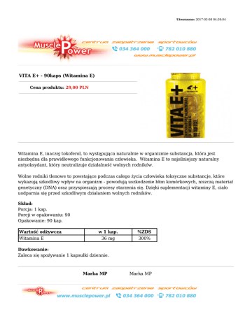 Utworzono: 2017-03-08 04:38:04 VITA E+ - 90kaps (Witamina E) Cena produktu: 29,00 PLN Witamina E, inaczej tokoferol, to występująca naturalnie w organizmie substancja, która jest niezbędna dla prawidłowego funkcjonowania człowieka. Witamina E to najsilniejszy naturalny antyoksydant, który neutralizuje działalność wolnych rodników. Wolne rodniki tlenowe to powstające podczas całego życia człowieka toksyczne substancje, które wykazują szkodliwy wpływ na organizm - powodują uszkodzenie błon komórkowych, niszczą materiał genetyczny (DNA) oraz przyspieszają procesy starzenia się. Dzięki suplementacji witaminy E, ciało uodparnia się przed szkodliwym działaniem wolnych rodników. Skład: Porcja: 1 kap. Porcji w opakowaniu: 90 Opakowanie: 90 kap. Wartość odżywcza Witamina E w 1 kap. %ZDS 36 mg 300% Dawkowanie: Zaleca się spożywanie 1 kapsułki dziennie. Marka MP Marka MP Adres: http://www.muscle.trustnet.pl/ Telefon: 34 36 43 000, 782 010 880 Email: [email protected]