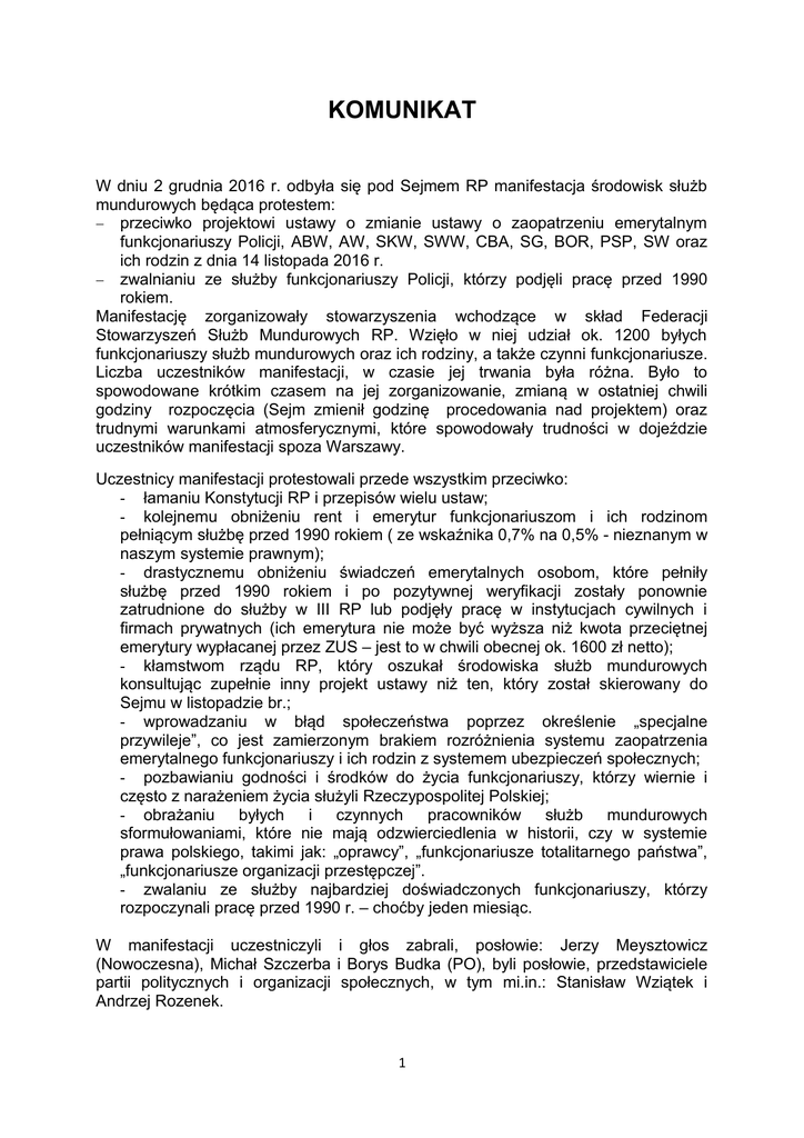 KOMUNIKAT W dniu 2 grudnia 2016 r. odbyła się pod Sejmem RP manifestacja środowisk służb mundurowych będąca protestem: przeciwko projektowi ustawy o zmianie ustawy o zaopatrzeniu emerytalnym funkcjonariuszy Policji, ABW, AW, SKW, SWW, CBA, SG, BOR, PSP, SW oraz ich rodzin z dnia 14 listopada 2016 r. zwalnianiu ze służby funkcjonariuszy Policji, którzy podjęli pracę przed 1990 rokiem. Manifestację zorganizowały stowarzyszenia wchodzące w skład Federacji Stowarzyszeń Służb Mundurowych RP. Wzięło w niej udział ok. 1200 byłych funkcjonariuszy służb mundurowych oraz ich rodziny, a także czynni funkcjonariusze. Liczba uczestników manifestacji, w czasie jej trwania była różna. Było to spowodowane krótkim czasem na jej zorganizowanie, zmianą w ostatniej chwili godziny rozpoczęcia (Sejm zmienił godzinę procedowania nad projektem) oraz trudnymi warunkami atmosferycznymi, które spowodowały trudności w dojeździe uczestników manifestacji spoza Warszawy. Uczestnicy manifestacji protestowali przede wszystkim przeciwko: - łamaniu Konstytucji RP i przepisów wielu ustaw; - kolejnemu obniżeniu rent i emerytur funkcjonariuszom i ich rodzinom pełniącym służbę przed 1990 rokiem ( ze wskaźnika 0,7% na 0,5% - nieznanym w naszym systemie prawnym); - drastycznemu obniżeniu świadczeń emerytalnych osobom, które pełniły służbę przed 1990 rokiem i po pozytywnej weryfikacji zostały ponownie zatrudnione do służby w III RP lub podjęły pracę w instytucjach cywilnych i firmach prywatnych (ich emerytura nie może być wyższa niż kwota przeciętnej emerytury wypłacanej przez ZUS – jest to w chwili obecnej ok. 1600 zł netto); - kłamstwom rządu RP, który oszukał środowiska służb mundurowych konsultując zupełnie inny projekt ustawy niż ten, który został skierowany do Sejmu w listopadzie br.; - wprowadzaniu w błąd społeczeństwa poprzez określenie „specjalne przywileje”, co jest zamierzonym brakiem rozróżnienia systemu zaopatrzenia emerytalnego funkcjonariuszy i ich rodzin z systemem ubezpieczeń społecznych; - pozbawianiu godności i środków do życia funkcjonariuszy, którzy wiernie i często z narażeniem życia służyli Rzeczypospolitej Polskiej; - obrażaniu byłych i czynnych pracowników służb mundurowych sformułowaniami, które nie mają odzwierciedlenia w historii, czy w systemie prawa polskiego, takimi jak: „oprawcy”, „funkcjonariusze totalitarnego państwa”, „funkcjonariusze organizacji przestępczej”. - zwalaniu ze służby najbardziej doświadczonych funkcjonariuszy, którzy rozpoczynali pracę przed 1990 r. – choćby jeden miesiąc. W manifestacji uczestniczyli i głos zabrali, posłowie: Jerzy Meysztowicz (Nowoczesna), Michał Szczerba i Borys Budka (PO), byli posłowie, przedstawiciele partii politycznych i organizacji społecznych, w tym mi.in.: Stanisław Wziątek i Andrzej Rozenek. 1 W czasie ponad 3 godzinnego trwania manifestacji głos zabierali przedstawiciele stowarzyszeń zrzeszonych w FSSM RP, w tym między innymi: - Zdzisław Czarnecki – Prezes Stowarzyszenia Emerytów i Rencistów Policyjnych, - Adam Miksiewicz – Prezes Związku Emerytów i Rencistów Straży Granicznej, - Grzegorz Domaszewicz – były Dyrektor Biura Emerytalnego Służby Więziennej, - Marek Bielec – członek Zarządu Związku Żołnierzy Wojska Polskiego, - Leszek Sucholewski – Prezes Stowarzyszenia byłych Policjantów Centralnego Biura Śledczego KGP i Centralnego Biura Śledczego Policji - Tomasz Kowalczyk – członek Zarządu Stowarzyszenia Spadkobierców Polskich Kombatantów II Wojny Światowej. Na manifestacji byli też z nami nasi szefowie, którzy zabierali głos, a wśród nich: gen. insp. Policji w st. spocz. Leszek Szreder – były Komendant Główny Policji, gen. bryg w st. spocz. Mirosław Gawor – były Szef Biura Ochrony Rządu. Głos zabierało też szereg innych osób: zwykli funkcjonariusze z różnych służb i ich rodziny, których chce się w sposób perfidny i niezgodny z prawem pozbawić środków do godnego życia, leczenia i normalnej egzystencji. Odczytano także dwa ważne dokumenty, listy skierowane do Ministra Mariusza Błaszczaka przez: - byłych Ministrów Spraw Wewnętrznych: Henryka Majewskiego, Andrzeja Milczanowskiego, Leszka Millera, Krzysztofa Janika, Ryszarda Kalisza i Bartłomieja Sienkiewicza; - byłych szefów służb UOP, ABW oraz AW: Andrzeja Milczanowskiego, Pawła Białka, Andrzeja Kapkowskiego, Jerzego Nóżkę, Krzysztofa Bondaryka , Dariusza Łuczaka. Należy podkreślić bardzo dobrą współpracę z Biurem Bezpieczeństwa i Zarządzania Kryzysowego Urzędu Miasta Stołecznego Warszawy oraz Policją, która manifestację zabezpieczała.