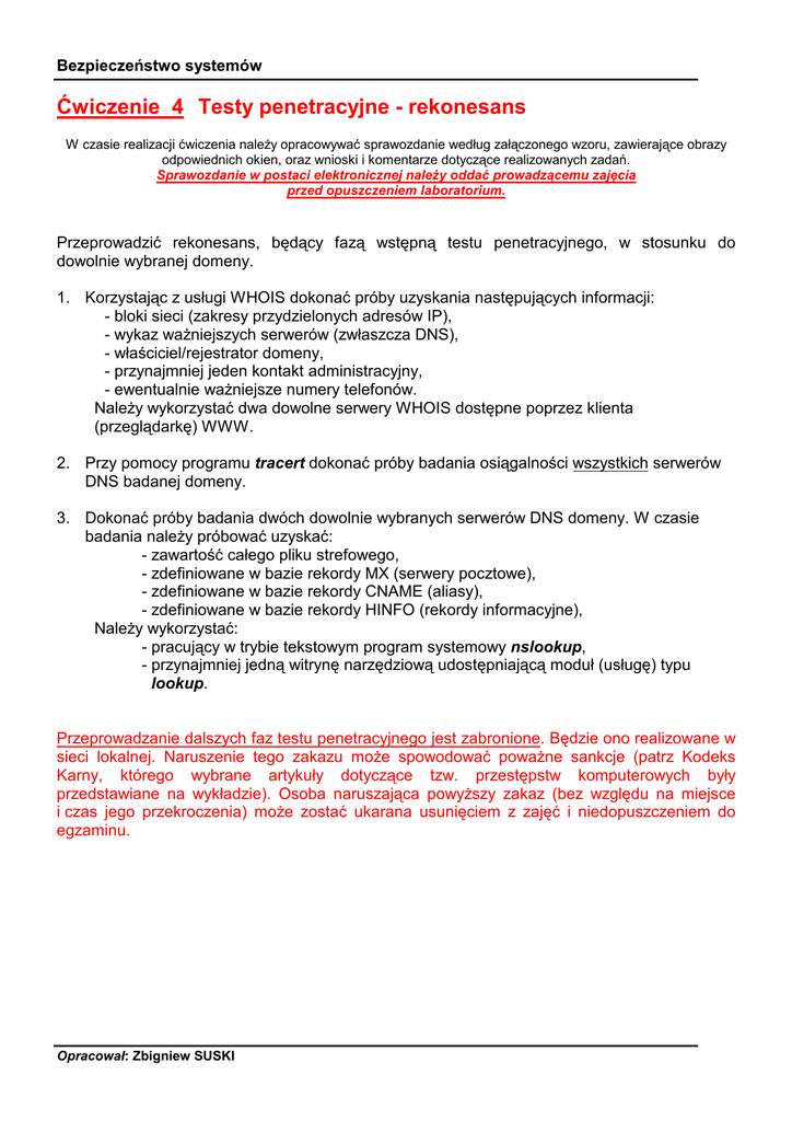 Bezpieczeństwo systemów Ćwiczenie 4 Testy penetracyjne - rekonesans W czasie realizacji ćwiczenia należy opracowywać sprawozdanie według załączonego wzoru, zawierające obrazy odpowiednich okien, oraz wnioski i komentarze dotyczące realizowanych zadań. Sprawozdanie w postaci elektronicznej należy oddać prowadzącemu zajęcia przed opuszczeniem laboratorium. Przeprowadzić rekonesans, będący fazą wstępną testu penetracyjnego, w stosunku do dowolnie wybranej domeny. 1. Korzystając z usługi WHOIS dokonać próby uzyskania następujących informacji: - bloki sieci (zakresy przydzielonych adresów IP), - wykaz ważniejszych serwerów (zwłaszcza DNS), - właściciel/rejestrator domeny, - przynajmniej jeden kontakt administracyjny, - ewentualnie ważniejsze numery telefonów. Należy wykorzystać dwa dowolne serwery WHOIS dostępne poprzez klienta (przeglądarkę) WWW. 2. Przy pomocy programu tracert dokonać próby badania osiągalności wszystkich serwerów DNS badanej domeny. 3. Dokonać próby badania dwóch dowolnie wybranych serwerów DNS domeny. W czasie badania należy próbować uzyskać: - zawartość całego pliku strefowego, - zdefiniowane w bazie rekordy MX (serwery pocztowe), - zdefiniowane w bazie rekordy CNAME (aliasy), - zdefiniowane w bazie rekordy HINFO (rekordy informacyjne), Należy wykorzystać: - pracujący w trybie tekstowym program systemowy nslookup, - przynajmniej jedną witrynę narzędziową udostępniającą moduł (usługę) typu lookup. Przeprowadzanie dalszych faz testu penetracyjnego jest zabronione. Będzie ono realizowane w sieci lokalnej. Naruszenie tego zakazu może spowodować poważne sankcje (patrz Kodeks Karny, którego wybrane artykuły dotyczące tzw. przestępstw komputerowych były przedstawiane na wykładzie). Osoba naruszająca powyższy zakaz (bez względu na miejsce i czas jego przekroczenia) może zostać ukarana usunięciem z zajęć i niedopuszczeniem do egzaminu. Opracował: Zbigniew SUSKI