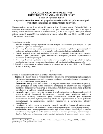 ZARZĄDZENIE Nr 0050.893.2017.VII PREZYDENTA MIASTA JELENIEJ GÓRY z dnia 19 stycznia 2017r. w sprawie procedur kontroli gospodarowania środkami publicznymi pod względem legalności, gospodarności i celowości. Na podstawie art. 44 ust.3, art. 68 ust.1 i art.69 ust.1 pkt 2 ustawy z dnia 27 sierpnia 2009 r. o finansach publicznych (Dz. U. z 2016r. poz. 1870, poz.1984 i poz.2260) i art. 21 ust.1 pkt 6 ustawy z dnia 29 września 1994r. o rachunkowości (Dz. U. z 2016r. poz. 1047 i poz. 2255) i ustawy z dnia 11 marca 2004r. o podatku od towarów i usług (Dz. U. z 2016r. poz.710 ze zm. 1 ), zarządzam, co następuje : §1 Zarządzenie reguluje: 1. Zasady wstępnej oceny wydatków dokonywanych ze środków publicznych, w tym zgodności z planem finansowym. 2. Procedury kontroli celowości, gospodarności i legalności wydatków ponoszonych w związku z realizacją zadań, w tym wydatków na koszty funkcjonowania jednostki. 3. Zasady wstępnej oceny pod względem legalności i celowości dokonywanych zwrotów nadpłat z tytułu podatków i opłat, należności cywilnoprawnych oraz niepodatkowych należności publicznoprawnych. 4. Procedury kontroli legalności i celowości zwrotu nadpłat z tytułu podatków i opłat, należności cywilnoprawnych oraz niepodatkowych należności publicznoprawnych. 5. Sposób wykorzystania wyników kontroli, o których mowa w ust. 1,2,3 i 4 w Urzędzie Miasta w Jeleniej Górze. §2 Ilekroć w zarządzeniu jest mowa o kontroli pod względem: 1. legalności - należy przez to rozumieć kontrolę dokumentu obrazującego przebieg operacji lub działania gospodarczego pod względem zgodności z obowiązującymi przepisami, w tym z uregulowaniami wewnętrznymi, 2. celowości - należy przez to rozumieć kontrolę dokumentu bądź zamierzonych operacji, jeżeli pociągają za sobą skutki finansowe, polegającą na badaniu ich pod względem zgodności podejmowanych decyzji z obowiązującymi kierunkami działalności jednostki określonymi w budżecie i planie finansowym, 3. gospodarności - należy przez to rozumieć kontrolę polegającą na dokonywaniu analiz i oceny wszelkich dostępnych dokumentów, z których mogą wypływać wnioski o zachowaniu należytej staranności przy wydatkowaniu środków pod względem oszczędności, wyboru najkorzystniejszej oferty dla wykorzystania zasobów jednostki pozwalających na minimalizację kosztów finansowych i optymalizację efektów gospodarczych, 4. rzetelności - należy przez to rozumieć kontrolę wszelkich dostępnych dokumentów, polegającą na badaniu ich zgodności z rzeczywistym przebiegiem operacji gospodarczej, 5. administracyjnym - należy przez to rozumieć ogół metod kontroli stosowanych w sposób syntetyczny, mających na celu ochronę własności mienia gminnego, powiatowego i Skarbu Państwa, zwiększenie efektywności działania i postępowania przez osoby 1 Zmiany tekstu jednolitego ogłoszono w Dz.U. z 2016r. poz.615, poz. 846, poz.960, poz.1052, poz.1228, poz.1206, poz. 1579, poz.1608 i poz. 2024 odpowiedzialne za przestrzeganie ustalonych zasad wykonywania powierzonych im zadań w zakresie działalności gospodarczo - finansowej. §3 Ilekroć w zarządzeniu jest mowa o dysponentach środków budżetowych należy przez to rozumieć naczelników wydziałów bądź osoby zajmujące samodzielne stanowiska, wskazanych w uchwale budżetowej na określony rok budżetowy. Szczegółowe zasady funkcjonowania systemu wewnętrznej kontroli gospodarowania środkami publicznymi pod względem legalności, gospodarności i celowości określa Załącznik do niniejszego Zarządzenia. §4 Traci moc Zarządzenie Nr 0050.687.2016.VII Prezydenta Miasta Jeleniej Góry z dnia 23 czerwca 2016r. w sprawie procedur kontroli oraz gospodarowania środkami publicznymi pod względem legalności, gospodarności i celowości. §5 Wykonanie Zarządzenia powierza się Zastępcom Prezydenta, Sekretarzowi Miasta, Skarbnikowi Miasta i dysponentom środków budżetowych. §6 Zarządzenie wchodzi w życie z dniem wydania, z mocą obowiązującą od 1 stycznia 2017r. Załącznik do Zarządzenia Nr 0050.893. 2017.VII Prezydenta Miasta Jeleniej Góry z dnia 19 stycznia 2017r. w sprawie procedur kontroli gospodarowania środkami publicznymi pod względem legalności, gospodarności i celowości ZASADY WSTĘPNEJ OCENY, PROCEDURY KONTROLI I SZCZEGÓŁOWE ZASADY GOSPODAROWANIA ŚRODKAMI PUBLICZNYMI POD WZGLĘDEM LEGALNOŚCI, GOSPODARNOŚCI I CELOWOŚCI Wstęp Różnorodność zdarzeń i operacji gospodarczo - finansowych, występujących w jednostkach samorządu terytorialnego, powoduje powstanie dużej liczby dokumentów zróżnicowanych pod względem formy i treści. W ramach kryterium chronologii wystawiania, dokumenty dzielą się na: a) dokumenty, które powinny być wystawiane przed dokonaniem operacji gospodarczej; do tej grupy dokumentów zalicza się zamówienia, umowy, zlecenia, zlecenia na pracę w godzinach nadliczbowych, itp. b) dokumenty wystawiane w trakcie dokonywania operacji gospodarczych; zalicza się do nich np. dokumenty obrotu kasowego, c) dokumenty wystawiane w określonym czasie po dokonaniu operacji; zalicza się do nich dokumenty wtórne, powstające na podstawie dokumentów wystawianych przed lub w trakcie operacji gospodarczych, np. polecenie wypłaty kwot zatrzymanych z faktur kontrahentów na zabezpieczenie należytego wykonania robót. I. Zasady wstępnej oceny pod względem legalności, gospodarności i celowości dokonywanych wydatków ze środków publicznych, w tym zgodności z planem finansowym. 1. Szczegółowy system funkcjonowania wstępnej oceny celowości, gospodarności i legalności wydatkowania środków wynika z ustalonych poniżej zasad dokumentowania wszelkich operacji gospodarczych i finansowych. Kontrola wewnętrzna dokumentów powinna być realizowana w taki sposób, aby zabezpieczyć rzetelność tych dokumentów na wejściu. Konieczne jest wdrożenie kontroli dowodów, poczynając już 