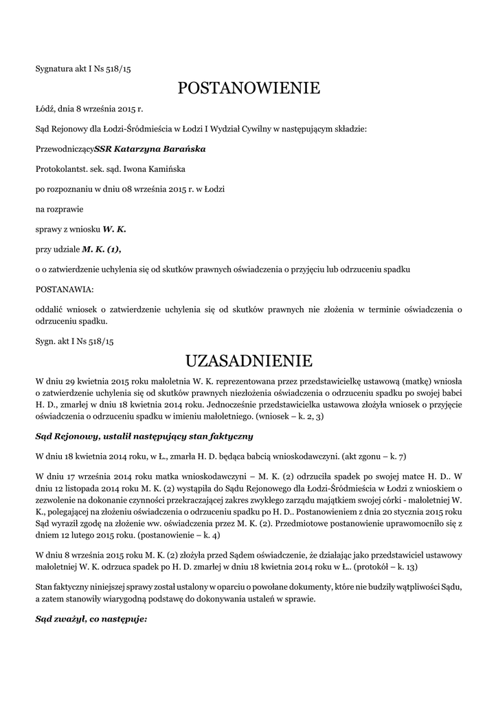 Sygnatura akt I Ns 518/15 POSTANOWIENIE Łódź, dnia 8 września 2015 r. Sąd Rejonowy dla Łodzi-Śródmieścia w Łodzi I Wydział Cywilny w następującym składzie: PrzewodniczącySSR Katarzyna Barańska Protokolantst. sek. sąd. Iwona Kamińska po rozpoznaniu w dniu 08 września 2015 r. w Łodzi na rozprawie sprawy z wniosku W. K. przy udziale M. K. (1), o o zatwierdzenie uchylenia się od skutków prawnych oświadczenia o przyjęciu lub odrzuceniu spadku POSTANAWIA: oddalić wniosek o zatwierdzenie uchylenia się od skutków prawnych nie złożenia w terminie oświadczenia o odrzuceniu spadku. Sygn. akt I Ns 518/15 UZASADNIENIE W dniu 29 kwietnia 2015 roku małoletnia W. K. reprezentowana przez przedstawicielkę ustawową (matkę) wniosła o zatwierdzenie uchylenia się od skutków prawnych niezłożenia oświadczenia o odrzuceniu spadku po swojej babci H. D., zmarłej w dniu 18 kwietnia 2014 roku. Jednocześnie przedstawicielka ustawowa złożyła wniosek o przyjęcie oświadczenia o odrzuceniu spadku w imieniu małoletniego. (wniosek – k. 2, 3) Sąd Rejonowy, ustalił następujący stan faktyczny W dniu 18 kwietnia 2014 roku, w Ł., zmarła H. D. będąca babcią wnioskodawczyni. (akt zgonu – k. 7) W dniu 17 września 2014 roku matka wnioskodawczyni – M. K. (2) odrzuciła spadek po swojej matce H. D.. W dniu 12 listopada 2014 roku M. K. (2) wystąpiła do Sądu Rejonowego dla Łodzi-Śródmieścia w Łodzi z wnioskiem o zezwolenie na dokonanie czynności przekraczającej zakres zwykłego zarządu majątkiem swojej córki - małoletniej W. K., polegającej na złożeniu oświadczenia o odrzuceniu spadku po H. D.. Postanowieniem z dnia 20 stycznia 2015 roku Sąd wyraził zgodę na złożenie ww. oświadczenia przez M. K. (2). Przedmiotowe postanowienie uprawomocniło się z dniem 12 lutego 2015 roku. (postanowienie – k. 4) W dniu 8 września 2015 roku M. K. (2) złożyła przed Sądem oświadczenie, że działając jako przedstawiciel ustawowy małoletniej W. K. odrzuca spadek po H. D. zmarłej w dniu 18 kwietnia 2014 roku w Ł.. (protokół – k. 13) Stan faktyczny niniejszej sprawy został ustalony w oparciu o powołane dokumenty, które nie budziły wątpliwości Sądu, a zatem stanowiły wiarygodną podstawę do dokonywania ustaleń w sprawie. Sąd zważył, co następuje: Wniosek podlegał oddaleniu. Zgodnie z treścią art. 1019 § 1, 2 i 3 k.c. spadkobierca, który pod wpływem błędu lub groźby nie złożył oświadczenia o odrzuceniu lub przyjęciu spadku w terminie, może uchylić się od skutków prawnych niezachowania terminu jeżeli było to wynikiem błędu lub groźby, stosuje się przy tym przepisy o wadach oświadczenia woli z następującymi zmianami: uchylenie się od skutków prawnych niezłożenia oświadczenia powinno nastąpić przed sądem, a spadkobierca powinien jednocześnie oświadczyć, czy i jak spadek przyjmuje, czy też go odrzuca. Uchylenie się od skutków prawnych niezłożenia oświadczenia o przyjęciu lub o odrzuceniu spadku wymaga zatwierdzenia przez sąd. W świetle powołanych przepisów podstawową przesłanką uwzględnienia wniosku, niezależnie od przyczyn niezłożenia stosownego oświadczenia, jest upływ terminu do jego złożenia. Co oczywiste w razie pozostawania terminu w biegu (a więc jego nieprzekroczenia) nie ma podstaw do zatwierdzenia uchylenia się od skutków prawnych niezłożenia oświadczenia w terminie. Stosownie do art. 1015 § 1 k.c. oświadczenie o przyjęciu lub o odrzuceniu spadku może być złożone w ciągu sześciu miesięcy od dnia, w którym spadkobierca dowiedział się o tytule swego powołania. W sprawie ustalono, że matka małoletniej wnioskodawczyni, będąca jednocześnie jej przedstawicielką ustawową odrzuciła spadek w dniu 17 września 2014 roku, a w dniu 12 listopada 2014 roku wystąpiła do Sądu o wyrażenie zgody na złożenie oświadczenia o odrzuceniu spadku w imieniu swojej małoletniej córki W. K.. Sąd wyraził zgodę, a postanowienie stało się prawomocne w dniu 12 lutego 2015 roku. W tym miejscu wymaga podkreślenia, że zgodnie z poglądem Sądu Najwyższego wyrażonym w postanowieniu z dnia 20 listopada 2013 r., wydanym w sprawie I CSK 329/13 (OSNC 2014/9/93), a potwierdzonym w postanowieniu z dnia 28 maja 2015 r., wydanym w sprawie III CSK 352/14 (LEX nr 1754053) do terminu określonego w art. 1015 § 1 k.c. ma odpowiednie zastosowanie (na zasadach analogii) art. 123 § 1 pkt 1 k.c., który stanowi, że bieg przedawnienia przerywa się przez każdą czynność przed sądem lub innym organem powołanym do rozpoznawania spraw lub egzekwowania roszczeń danego rodzaju albo przed sądem polubownym, przedsięwziętą bezpośrednio w celu dochodzenia lub ustalenia albo zaspokojenia lub zabezpieczenia roszczenia. Zgadzając się z powyższym poglądem należy zwrócić uwagę, że z dniem złożenia przez M. K. (2) wniosku o wyrażenie przez Sąd zgody na złożenie oświadczenia o odrzuceniu spadku w imieniu małoletniej W. K., nastąpiło przerwanie 6-miesięcznego terminu do złożenia tego oświadczenia. Ponieważ postanowienie wyrażające zgodę na ww. czynność uprawomocniło się w dniu 12 lutego 2015 roku, to stosownie do art. 124 § 1 i 2 k.c., od tego dnia przedmiotowy termin zaczął biec na nowo. W konsekwencji w chwili złożenia wniosku w niniejszej sprawie, tj. w dniu 29 kwietnia 2015 roku, 6-miesięczny termin do złożenia przez W. K. oświadczenia o odrzuceniu spadku nie upłynął. Z tego względu Sąd nie miał możliwości zatwierdzenia uchylenia się od skutków niezłożenia w terminie oświadczenia o odrzuceniu spadku w ww. małoletniej. Mając powyższe na uwadze należało orzec jak w sentencji.