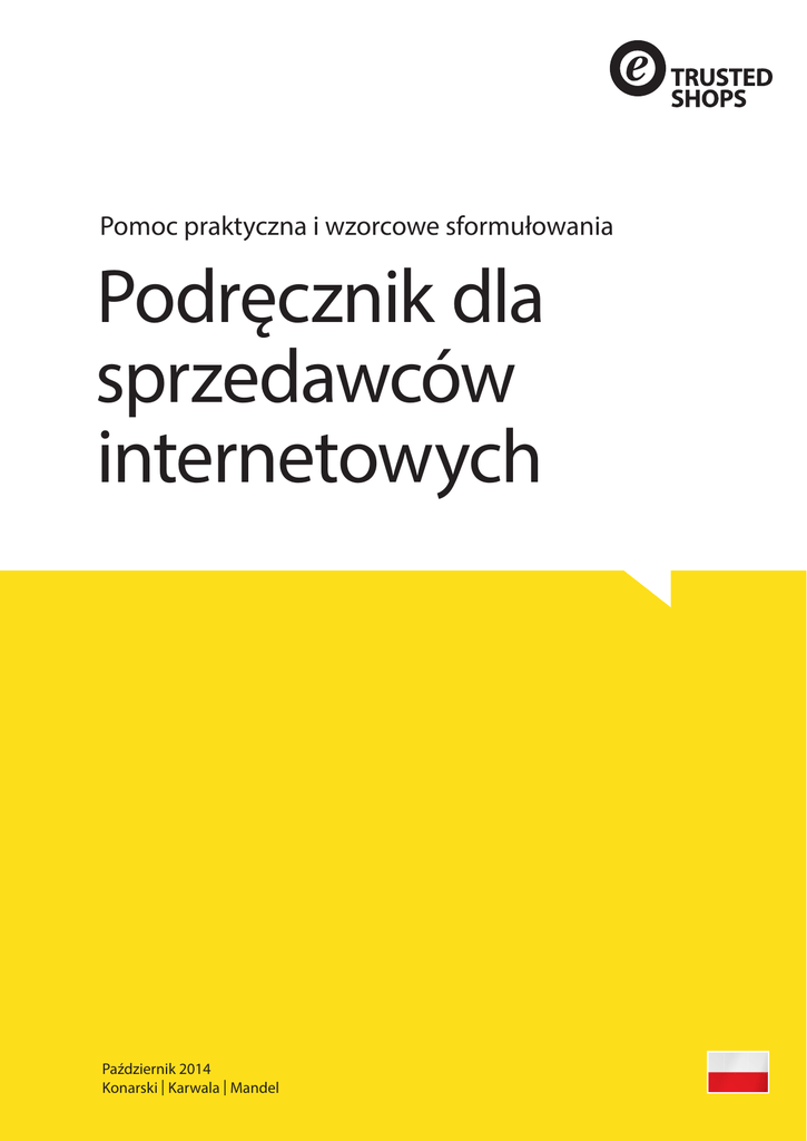 Pomoc praktyczna i wzorcowe sformułowania Podręcznik dla sprzedawców internetowych Październik 2014 Konarski | Karwala | Mandel Wstęp Wstęp Prowadzenie działalno ci gospodarczej polegającej na sprzeda y towarów lub wiadczeniu usług adresowanych do konsumentów za po rednictwem rodków komunikacji elektronicznej (w Internecie) wymaga zastosowania się do szeregu szczegółowych uregulowań prawnych. W poszczególnych aktach prawnych zamieszczone są postanowienia odnoszące się do takich kwestii, jakŚ wymogi identyfikacji przedsiębiorcy, ochrona danych osobowych, obowiązki informacyjne wobec konsumentów, czy te warunki zawarcia i rozwiązania umowy. Wymienione zagadnienia zostały unormowane w wy ej wskazanych Kryteriach, z uwzględnieniem przepisów zawartych wŚ Ustawie z dnia 18 lipca 2002 r. o wiadczeniu usług drogą elektroniczną (Dz. U. z 2002 r. Nr 144, poz. 1204 ze zm. – dalej jakoŚ „ustawa o wiadczeniu usług drogą elektroniczną”)ś Ustawie z dnia 30 maja 2014 r. o prawach konsumenta (Dz. U. 2014 r., poz. 827 – dalej jako: „ustawa o prawach konsumenta”) Ustawie z dnia 29 sierpnia 1997 r. o ochronie danych osobowych (tekst jednolity: Dz. U. z 2002 r., Nr 101, poz. 926 – dalej jako: „ustawa o ochronie danych osobowych”); oraz w regulacjach ogólnych, takich jak: Kodeks Spółek Handlowych z dnia 15 wrze nia 2000 r. (Dz. U. z 2000 r. Nr 94, poz. 1037 ze zm. – dalej jako: „KSH”); Ustawa z dnia 2 lipca 2004 r. o swobodzie działalno ci gospodarczej (tekst jednolityŚ Dz. U. z 2013 r., poz. 672 – dalej jakoŚ „ustawa o swobodzie działalno ci gospodarczej)ś czy te Kodeks Cywilny z dnia 23 kwietnia 1964 r. (Dz. U. Nr 16, poz. 93 ze zm. – dalej jako: „KC”). Niniejszy podręcznik dla sprzedawców internetowych ma na celu ułatwienie zaprojektowania i prowadzenia sklepu internetowego spełniającego wymogi okre lone w obowiązujących przepisach prawa oraz w dokumencie zatytułowanymŚ ”kryteria jako ci Trusted Shops” (zwanym dalejŚ „Kryteria”). Przed stosowaniem wymienionych w podręczniku wzorów nale y rozwa yć, o ile istnieje taka potrzeba, czy nale y dopasować odpowiedni wzór do konkretnych potrzeb sklepu internetowego. Prosimy te o sumienne przestudiowanie powiązanych z wzorami obja nień. Prosimy uwzględnić okoliczno ć, i stosowanie wzorów podręcznika nie zastępuje doradztwa prawnego oraz własnej pracy i indywidualnych rozwiązań zgodnych z odpowiednimi przepisami ustawowymi. W sytuacji, gdy istnieje potrzeba uzyskania porady prawnej, która uwzględnia indywidualne potrzeby sklepu internetowego, prosimy o kontakt z doradcą prawnym. UWAGAŚ Niniejszy podręcznik dla sprzedawców internetowych stworzony jest na podstawie nowej ustawy o prawach konsumenta, która obowiązuje od 25. grudnia 2014 r. Podane wzory, a w szczególno ci wzór formularza odstąpienia od umowy, należy stosować dopiero od tej daty. Podręcznik dla sprzedawców internetowych Trusted Shops | © 2014 Trusted Shops GmbH 3 Spis tre ci Spis tre ci Wstęp ......................................................................................................................... 3 Spis tre ci .................................................................................................................. 4 Czę ć 1Ś Odkryj Trusted Shops ............................................................................... 6 Spis tre ci .................................................................................................................. 7 1 1.1 1.2 1.3 1.4 System opinii Trusted Shops .......................................................................................................... 10 Sposób działania systemu opinii Trusted Shops................................................................................. 10 Skuteczne pro by o dodawanie opinii................................................................................................. 11 Review collector (dostępny jako usługa dodatkowa) .......................................................................... 12 System opinii w sklepie ....................................................................................................................... 13 2 2.1 2.2 2.3 2.4 Certyfikacja i znak jako ci Trusted Shops ..................................................................................... 14 Kryteria jako ci Trusted Shops ........................................................................................................... 14 Pomoc techniczna w procesie certyfikacji ........................................................................................... 14 Integracja i aktywacja ......................................................................................................................... 15 Korzy ci wynikające z korzystania ze wstępnie certyfikowanego oprogramowania ............................... sklepu internetowego .......................................................................................................................... 17 3 Gwarancja Trusted Shops................................................................................................................ 19 4 Usługa dodatkowaŚ marketing/SEO ................................................................................................ 21 5 Trusted Shops – partner w rozwoju sprzedaży internetowej na terenie Europy......................... 22 Czę ć 2Ś Pomoc praktyczna i wzorcowe sformułowania ..................................... 28 I. Spis tre ci ............................................................................................................. 29 II. Wstępne uwagi .................................................................................................... 31 1 Dyrektywa w sprawie praw konsumentów i ustawa o prawach konsumenta.............................. 31 2 Umowy zawierane na odległo ć ...........................................