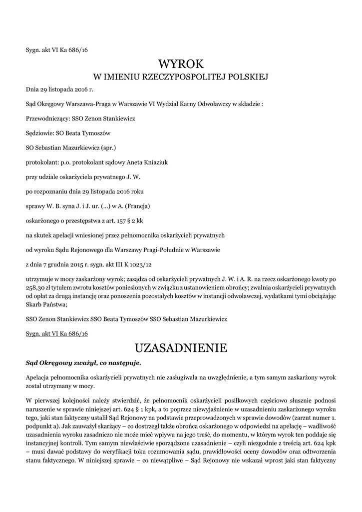 Sygn. akt VI Ka 686/16 WYROK W IMIENIU RZECZYPOSPOLITEJ POLSKIEJ Dnia 29 listopada 2016 r. Sąd Okręgowy Warszawa-Praga w Warszawie VI Wydział Karny Odwoławczy w składzie : Przewodniczący: SSO Zenon Stankiewicz Sędziowie: SO Beata Tymoszów SO Sebastian Mazurkiewicz (spr.) protokolant: p.o. protokolant sądowy Aneta Kniaziuk przy udziale oskarżyciela prywatnego J. W. po rozpoznaniu dnia 29 listopada 2016 roku sprawy W. B. syna J. i J. ur. (...) w A. (Francja) oskarżonego o przestępstwa z art. 157 § 2 kk na skutek apelacji wniesionej przez pełnomocnika oskarżycieli prywatnych od wyroku Sądu Rejonowego dla Warszawy Pragi-Południe w Warszawie z dnia 7 grudnia 2015 r. sygn. akt III K 1023/12 utrzymuje w mocy zaskarżony wyrok; zasądza od oskarżycieli prywatnych J. W. i A. R. na rzecz oskarżonego kwoty po 258,30 zł tytułem zwrotu kosztów poniesionych w związku z ustanowieniem obrońcy; zwalnia oskarżycieli prywatnych od opłat za drugą instancję oraz ponoszenia pozostałych kosztów w instancji odwoławczej, wydatkami tymi obciążając Skarb Państwa; SSO Zenon Stankiewicz SSO Beata Tymoszów SSO Sebastian Mazurkiewicz Sygn. akt VI Ka 686/16 UZASADNIENIE Sąd Okręgowy zważył, co następuje. Apelacja pełnomocnika oskarżycieli prywatnych nie zasługiwała na uwzględnienie, a tym samym zaskarżony wyrok został utrzymany w mocy. W pierwszej kolejności należy stwierdzić, że pełnomocnik oskarżycieli posiłkowych częściowo słusznie podnosi naruszenie w sprawie niniejszej art. 624 § 1 kpk, a to poprzez niewyjaśnienie w uzasadnieniu zaskarżonego wyroku tego, jaki stan faktyczny ustalił Sąd Rejonowy na podstawie przeprowadzonych w sprawie dowodów (zarzut numer 1. podpunkt a). Jak zauważył skarżący – co dostrzegł także obrońca oskarżonego w odpowiedzi na apelację – wadliwość uzasadnienia wyroku zasadniczo nie może mieć wpływu na jego treść, do momentu, w którym wyrok ten poddaje się instancyjnej kontroli. Tym samym niewłaściwie sporządzone uzasadnienie – czyli niezgodnie z treścią art. 624 kpk – musi dawać podstawy do weryfikacji toku rozumowania sądu, prawidłowości oceny dowodów oraz odtworzenia stanu faktycznego. W niniejszej sprawie – co niewątpliwe – Sąd Rejonowy nie wskazał wprost jaki stan faktyczny ustalił w sprawie, czyli w formie tradycyjnej w uzasadnieniu trudno wyodrębnić część zwaną potocznie „stanem faktycznym”, ale jednak nie przeszkadza to w ustaleniu jaki był – zdaniem Sądu Rejonowego – przebieg zdarzeń z udziałem W. B. i pokrzywdzonych. Tym samym usterki w uzasadnieniu wyroku – w ocenie Sądu Okręgowego – nie miały wpływu na treść wyroku, albowiem poddaje się on kontroli instancyjnej. Wyrażone w uzasadnieniu apelacji na poparcie tego zarzutu argumenty o braku wskazania przyczyn niewiarygodności zeznań świadków L. W., M. B., W. Z. i W. J. o tyle nie są zasadne, że treść uzasadnienia wyroku daje odpowiedź na powyższe. Ocena owych świadków (z błędami dotyczącymi ich imion i nazwisk, co nie ma wpływu na treść samego uzasadnienia, a więc tym bardziej wyroku) wyrażona została – choć nie do końca wprost – na kartach 497-498 akt sprawy, gdzie sąd meriti wskazał z jakiego powodu kwestionuje bezstronność tych osób, co w istocie nie dawało podstaw do stwierdzenia niewiarygodności wyjaśnień W. B., a jednocześnie – logicznie rozumując – nie dawało tym samym podstaw do stwierdzenia wiarygodności zeznań pokrzywdzonych. W podpunkcie b. zarzutu numer 1. pełnomocnik oskarżycieli prywatnych zarzucił naruszenie trzech przepisów kodeksu postępowania karnego, a to art. 7 kpk, art. 4 kpk, art. 410 kpk, zaś – jak zdaje się wskazywać konstrukcja apelacji – o tym, że naruszenie to mogło mieć wpływ na treść wyroku świadczą częściowo zarzuty określone numerem 2 (zwłaszcza, że uzasadnienie owych dwóch zarzutów sporządzono niejako zbiorczo). Poza słusznym spostrzeżeniem obrońcy oskarżonego o pewnej wadliwości zarzutów apelacyjnych (wyrażonym w odpowiedzi na apelację), trzeba również zwrócić uwagę na to, że art. 4 kpk – wyrażający tak zwaną zasadę obiektywizmu – nie może być podstawą zarzutu, albowiem przepis ten nie nakazuje (ani nie zakazuje) sądowi konkretnego sposobu procedowania. Ta ogólna dyrektywa prowadzenia postępowania karnego nie może stanowić – bez wskazania uchybień konkretnym przepisom służącym realizacji określonych w nich zasad – podstawy zarzutów odwoławczych. Wskazać należy, iż naruszenie zasady obiektywizmu (art. 4 kpk) in concreto oznaczałoby, że sąd przyjął odnośny wariant wydarzeń, jeszcze przed zakończeniem postępowania dowodowego podczas postępowania jurysdykcyjnego, co niewątpliwie nie nastąpiło. W realiach niniejszej sprawy nie można także stwierdzić, aby sąd I instancji naruszył dyrektywy wynikające z art. 7 kpk i 410 kpk. Z uzasadnienia zaskarżonego wyroku wynika, że przekonanie sądu orzekającego o winie oskarżonego wynikało z oceny dowodów dokonanej zgodnie z zasadami logiki oraz wskazań wiedzy i doświadczenia życiowego, a także z analizy i oceny wszystkich dowodów ujawnionych w toku przewodu sądowego. Zarzut naruszenia art. 7 kpk byłby słuszny tylko wówczas, gdyby zasadność ocen i wniosków wyprowadzonych przez sąd z ujawnionych okoliczności nie odpowiadałaby prawidłowości logicznego rozumowania i adekwatności ze wskazaniami wiedzy i doświadczenia życiowego. Możliwość przedstawienia odmiennego poglądu nie może prowadzić do wniosku o dokonaniu przez sąd błędu w ustaleniach faktycznych. W przedmiocie określonego w podpunkcie a. zarzutu numer 2. dotyczącego nieprawidłowej oceny wyjaśnień oskarżonego B., stwierdzić trzeba – wbrew argumentom z apelacji – iż Sąd Rejonowy dając wiarę wyjaśnieniom oskarżonego nie wykluczył, że J. W. mógł mieć kontakt z opuszczającym pomieszczenie W. B., 