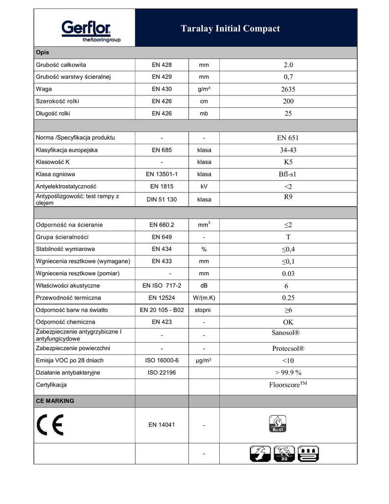 Taralay Initial Compact Opis Grubość całkowita EN 428 mm 2.0 Grubość warstwy ścieralnej EN 429 mm 0,7 Waga EN 430 g/m² 2635 Szerokość rolki EN 426 cm 200 Długość rolki EN 426 mb 25 - - EN 651 EN 685 klasa 34-43 - klasa K5 EN 13501-1 klasa Bfl-s1 EN 1815 kV DIN 51 130 klasa <2 R9 EN 660.2 mm Grupa ścieralności EN 649 - T Stabilność wymiarowa EN 434 % ≤0,4 Wgniecenia resztkowe (wymagane) EN 433 mm ≤0,1 - mm 0.03 Norma /Specyfikacja produktu Klasyfikacja europejska Klasowość K Klasa ogniowa Antyelektrostatyczność Antypoślizgowość: test rampy z olejem Odporność na ścieranie Wgniecenia resztkowe (pomiar) 3 ≤2 6 Właściwości akustyczne EN ISO 717-2 dB Przewodność termiczna EN 12524 W/(m.K) 0.25 EN 20 105 - B02 stopni ≥6 EN 423 - Zabezpieczenie antygrzybiczne I antyfungicydowe - - OK Sanosol® Zabezpieczenie powierzchni - - Protecsol® Emisja VOC po 28 dniach ISO 16000-6 µg/m3 <10 Działanie antybakteryjne ISO 22196 Odporność barw na światło Odporność chemiczna > 99.9 % FloorscoreTM Certyfikacja CE MARKING EN 14041 - -