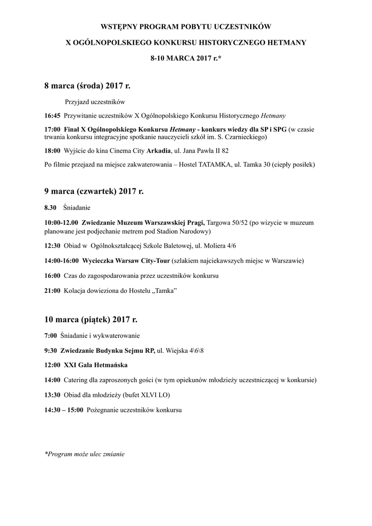 WSTĘPNY PROGRAM POBYTU UCZESTNIKÓW X OGÓLNOPOLSKIEGO KONKURSU HISTORYCZNEGO HETMANY 8-10 MARCA 2017 r.* 8 marca (środa) 2017 r. Przyjazd uczestników 16:45 Przywitanie uczestników X Ogólnopolskiego Konkursu Historycznego Hetmany 17:00 Finał X Ogólnopolskiego Konkursu Hetmany - konkurs wiedzy dla SP i SPG (w czasie trwania konkursu integracyjne spotkanie nauczycieli szkół im. S. Czarnieckiego) 18:00 Wyjście do kina Cinema City Arkadia, ul. Jana Pawła II 82 Po filmie przejazd na miejsce zakwaterowania – Hostel TATAMKA, ul. Tamka 30 (ciepły posiłek) 9 marca (czwartek) 2017 r. 8.30 Śniadanie 10:00-12.00 Zwiedzanie Muzeum Warszawskiej Pragi, Targowa 50/52 (po wizycie w muzeum planowane jest podjechanie metrem pod Stadion Narodowy) 12:30 Obiad w Ogólnokształcącej Szkole Baletowej, ul. Moliera 4/6 14:00-16:00 Wycieczka Warsaw City-Tour (szlakiem najciekawszych miejsc w Warszawie) 16:00 Czas do zagospodarowania przez uczestników konkursu 21:00 Kolacja dowieziona do Hostelu „Tamka” 10 marca (piątek) 2017 r. 7:00 Śniadanie i wykwaterowanie 9:30 Zwiedzanie Budynku Sejmu RP, ul. Wiejska 4\6\8 12:00 XXI Gala Hetmańska 14:00 Catering dla zaproszonych gości (w tym opiekunów młodzieży uczestniczącej w konkursie) 13:30 Obiad dla młodzieży (bufet XLVI LO) 14:30 – 15:00 Pożegnanie uczestników konkursu *Program może ulec zmianie