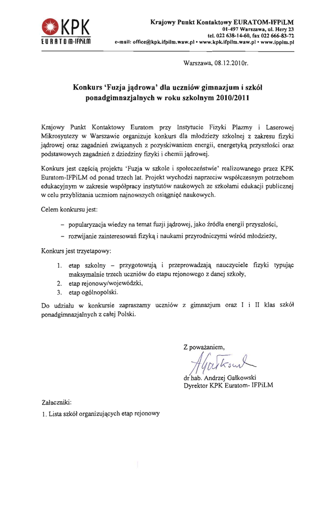 Załącznik nr 1 do konkursu „Fuzja jądrowa” 1 Lista szkół organizujących etap rejonowy konkursu z fizyki i astronomii „Fuzja jądrowa” L.P. REJON NAUCZYCIEL ORGANIZUJĄCY ETAP REJONOWY 1. Śląsk Krystyna Pilot 2. Bielsko-Biała, Wadowice i okolica Urszula Czudak-Wójcik Jerzy Rajda 3. Kraków i okolice Agnieszka Bożek Małgorzata Kaźmierczak 4. Małopolskie Piotr Ptaś 5. Opolskie 6. Dolnośląskie ADRES SZKOŁY LUB OŚRODKA IV Liceum Ogólnokształcące im. gen St. Maczka ul. Katowicka 54 40 165 Katowice Zespół Szkół Budowlanych im. Stanisława Maczka ul. Budowlanych 4, 43-300 Bielsko Biała Zespól Szkół Publicznych nr 1, ul. Słowackiego 2, 34-100 Wadowice TERMIN POZIOM 26.02.2011 LO + G 11.03.2011 LO G VIII LO im. Stanisława Wyspiaoskiego w Krakowie ul. Grzegórzecka 24, 31-531 Kraków 25.02.2011 LO + G Zespół Szkól w Dobczycach, ul. Szkolna 20a, Dobczyce 11.03.2011 LO + G Krystyna Kosek Olga Chimczak ZSO im. A. Mickiewicza, ul. Mickiewicza 10, 46-200 Kluczbork 5.03.2011 LO + G Marta Młyoczyk III LO im. Mikołaja Kopernika, ul. dr Jordana 4, 58-305 Wałbrzych 7.03.2011 LO + G Załącznik nr 1 do konkursu „Fuzja jądrowa” L.P. REJON NAUCZYCIEL ORGANIZUJĄCY ETAP REJONOWY 7. Świętokrzyskie Mirosław Pargieła Podkarpackie Andrzej Kukla Wiesław Ostafin 8. 2 ADRES SZKOŁY LUB OŚRODKA TERMIN POZIOM Instytut Fizyki Uniwersytetu Humanistyczno-Przyrodniczego w Kielcach, ul. Świętokrzyska 15, 25-406 Kielce 25.02.2011 LO + G Zespół Szkól Nr 3 w Jaśle, ul. Szkolna 23, 38-200 Jasło 11.03.2011 LO I LO im. Króla Władysława Jagiełły w Dębicy ul. Słowackiego 9, 39-200 Dębica 11.03.1011 G 9. Lublin -miasto Dominika Brus III LO im. Unii Lubelskiej, Plac Wolności 4, 20-005 Lublin 25.02.2011 LO + G 10. Lubelskie Jolanta Rzeźnik ZSO Nr 1 im. KEN w Puławach, ul. Kaniowczyków 9, 24-100 Puławy 5.03.2011 LO + G 11. Łódź-miasto Jadwiga Jarmuszczak XXXIII LO w Łodzi, ul. Kusocioskiego 116, 96-004 Łódź 10.03.2011 LO + G ILO im. T. Kościuszki, ul. Nadodrzaoska 4, 99-300 Wieluo 23.02.2011 LO Łódzkie Zenona Stojecka Maria Miklewska Gimnazjum Nr 7, ul. Św. Antoniego 2 97-200 Tomaszów Mazowiecki 23.02.2011 G 12. 13. Mazowieckie Anna Maksimowska Jan Rusak I LO im. Gen. J. Bema w Ostrołęce, ul. Traugutta 1, 07-410 Ostrołęka Zespół Szkół w Wyszkowie, ul. Geodetów 45, 07-200 Wyszków LO 5.03.2011 G Załącznik nr 1 do konkursu „Fuzja jądrowa” L.P. REJON NAUCZYCIEL ORGANIZUJĄCY ETAP REJONOWY 14. Bydgoszcz i okolica Grzegorz Wojewoda 15. Toruo i okolica Jacek Rybicki Krzysztof Gołębiowski 16. Lubuskie 17. 3 ADRES SZKOŁY LUB OŚRODKA TERMIN POZIOM I LO, ul. Plac Wolności 9, 85-004 Bydgoszcz 11.03.2011 LO + G I LO. im. M. Kopernika w Toruniu ul. Zaułek Prosowy 1, 87-100 Toruo 11.03.2011 LO + G Wojciech Sysło Paostwowa Wyższa Szkoła Zawodowa, Instytut Techniczny, ul. Myśliborska 34, 66-400 Gorzów Wlkp. 5.03.2011 LO + G Szczecin i okolica Józefa Kochelak VIII LO im. Olimpijczyków Polskich w Szczecinie ul. Królowej Jadwigi 27/28, 70-262 Szczecin 1.03.2011 G 18. Koszalin i okolica Małgorzata Romanowska V LO Zespół Szkół nr 2 im St. Lema ul. Jedności 9, 75-401 Koszalin 1.03.2011 LO + G 19. Olsztyn i okolica Beata Urbaoska Soboo Zespół Szkól Gastronomiczno-Spożywczych w Olsztynie ul. Żołnierska 49, Olsztyn 3.03.2011 LO + G 20. Południowa Wielkopolska - Kalisz Wiesława Idziak Stanisław Plebaoski ODN w Kaliszu, ul. Wrocławska 182, 62-800 Kalisz 11.03.2011 LO + G Załącznik nr 1 do konkursu „Fuzja jądrowa” L.P. REJON NAUCZYCIEL ORGANIZUJĄCY ETAP REJONOWY 21. Białystok i okolica Jerzy Zielinko 22. Pomorskie Przemysław Rojewski 23. Warmiosko-Mazurskie 24. Północna Wielkopolska Poznao- Konin 4 ADRES SZKOŁY LUB OŚRODKA TERMIN POZIOM Gimnazjum im. Ks. Wacława Raczyoskiego w Wasilkowie 11.03.2011 LO + G PCE ZSP Lębork, ul. Pionierów 16, 84-300 Lębork 10.03.2011 LO + G Romuald Gajdzis Zespół Szkól P. nr 2 w Bartoszycach ul. Słowackiego 1, 11-200 Bartoszyce 5.03.2011 LO + G Danuta Hewelt Adam Mazgajczyk VII LO i Gimnazjum Dwujęzyczne im. Dąbrówki w Poznaniu ul. Żeromskiego 8, 60-193 Poznao 11.03.2011 LO + G