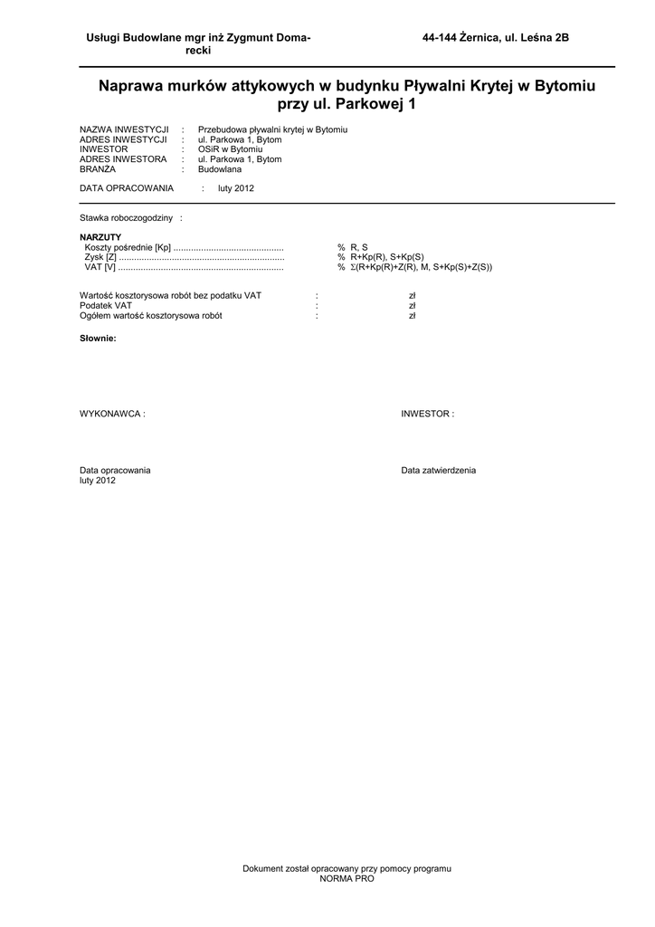 44-144 Żernica, ul. Leśna 2B Usługi Budowlane mgr inż Zygmunt Domarecki Naprawa murków attykowych w budynku Pływalni Krytej w Bytomiu przy ul. Parkowej 1 NAZWA INWESTYCJI ADRES INWESTYCJI INWESTOR ADRES INWESTORA BRANŻA : : : : : DATA OPRACOWANIA Przebudowa pływalni krytej w Bytomiu ul. Parkowa 1, Bytom OSiR w Bytomiu ul. Parkowa 1, Bytom Budowlana : luty 2012 Stawka roboczogodziny : NARZUTY Koszty pośrednie [Kp] ............................................ Zysk [Z] .................................................................. VAT [V] .................................................................. Wartość kosztorysowa robót bez podatku VAT Podatek VAT Ogółem wartość kosztorysowa robót % R, S % R+Kp(R), S+Kp(S) % Σ(R+Kp(R)+Z(R), M, S+Kp(S)+Z(S)) : : : zł zł zł Słownie: WYKONAWCA : INWESTOR : Data opracowania luty 2012 Data zatwierdzenia Dokument został opracowany przy pomocy programu NORMA PRO Lp. Podstawa Opis 1 Odbudowa murków ogniowych 1 TZKNBK VIII Zabezpieczenie dachu płytą pilśniową d.1 05-163 analogia obmiar = (8.40+12.84*2+9.18+14.55+31.57+ 9.91+28.68+10.34*2+4.49*2)*1.50 = 236.445 m2 1* 2* 3* 4* -- R -robocizna 0.5r-g/m2 -- M -Deski iglaste obrzynane gr.19-25mm,kl.III 0.0024m3/m2 Płyta pilśn.porowata,bitumowana gr.12,5 mm 0.167m2/m2 Gwoździe budowlane okrągłe gołe 0.0072kg/m2 jm Nakłady m2 r-g 118.2225 m3 0.5675 m2 39.4863 kg 1.7024 Razem z narzutami: Cena jednostkowa: 2 KNR-W 4-01 Rozebranie obróbek murów ogniowych z blachy m2 d.1 0545-08 nie nadającej się do użytku obmiar = 0.40*(8.40+12.84*2+9.18+14.55+ 31.57+9.91+28.68+10.34*2+4.49*2) = 63.052 m2 1* -- R -robocizna 0.3r-g/m2 r-g 18.9156 Razem z narzutami: Cena jednostkowa: 3 KNR-W 2-02 Obróbki przy szerokości w rozwinięciu ponad 25 m2 d.1 0514-02 cm - z blachy stalowej ocynkowanej - ogniomur obmiar = 0.40*(8.40+12.84*2+9.18+14.55+ 31.57+9.91+28.68+10.34*2+4.49*2) = 63.052 m2 1* 2* 3* 4* 5* 6* -- R -robocizna 1.57r-g/m2 -- M -Blacha stal.ocynk.płask.gr.0,50-0,55mm 5.03kg/m2 Spoiwo cynowo-ołowiane w prętach LC 60 0.029kg/m2 kołki rozporowe plastikowe 6.7szt/m2 materiały pomocnicze 0.015%(od M) -- S -Samochód dostaw.do 0.9t (1) 0.0069m-g/m2 r-g 98.9916 kg 317.1516 kg 1.8285 szt 422.4484 % 0.0150 mg 0.4351 Razem z narzutami: Cena jednostkowa: 4 KNR 4-01 Odbudowa murów ogniowych na zaprawie cem3 d.1 0311-02 mentowo-wapiennej o grub. ponad 1 ceg. analogia obmiar = (0.58*0.21+0.12*0.30)*(8.40+12.84*2+ 9.18+14.55+31.57+9.91+28.68+10.34*2+4.49*2) = 24.874 m3 1* 2* 3* 4* 5* -- R -robocizna 13.32r-g/m3 -- M -cegła klinkierowa 365szt./m3 zaprawa murarska 0.43t/m3 Woda z rurociągów 0.19m3/m3 materiały pomocnicze 1.5%(od M) -- S -- Norma PRO Wersja 4.37 Nr seryjny: 7325 r-g 331.3217 szt 9079.010 . 0 t 10.6958 m3 4.7261 % 1.5000 Koszt jedn. R M S Lp. 6* 7* Podstawa Opis Betoniarka wolnospadowa spal. 0.45m-g/m3 Wyciąg jednomaszt. elektr.0.5t 2.12m-g/m3 Razem z narzutami: Cena jednostkowa: 5 KNR AT-17 Docinanie cegieł klinkierowych piłą elektryczną z d.1 0108-06 tarczą diamentową analogia obmiar = ((0.58)*(8.40+12.84*2+9.18+14.55+ 31.57+9.91+28.68+10.34*2+4.49*2))*20% = 18.285 m2 1* 2* 3* 4* 5* -- R -robocizna 15.9r-g/m2 -- M -tarcza diamentowa 0.17szt./m2 Woda z rurociągów 0.1m3/m2 materiały pomocnicze 0.5%(od M) -- S -ręczna piła tarczowa spalinowa 2.43m-g/m2 jm Nakłady mg mg 11.1933 52.7329 m2 r-g 290.7315 szt . m3 3.1085 % 0.5000 mg 44.4326 1.8285 Razem z narzutami: Cena jednostkowa: 6 KNR 2-02 Mur ogniowy z cegły klinkierowej - dodatek za m2 d.1 0120-09 zbrojenie analogia obmiar = (0.58)*(8.40+12.84*2+9.18+14.55+ 31.57+9.91+28.68+10.34*2+4.49*2) = 91.425 m2 1* 2* 3* -- R -robocizna 0.16r-g/m2 -- M -pręty okr.gład.do zbr.bet. fi 8mm 158*4=632m materiały pomocnicze 1.5%(od M) r-g 14.6280 m 632.0000 % 1.5000 Razem z narzutami: Cena jednostkowa: 7 KNR BC-02 Czyszczenie ręczne poziomych powierzchni beto- m2 d.1 0201-01 nowych obmiar = (0.12+0.30)*158.00 = 66.360 m2 1* -- R -robocizna 0.2r-g/m2 r-g 13.2720 Razem z narzutami: Cena jednostkowa: 8 KNR 5-08 Mechaniczne wykonanie ślepych otworów w beto- szt d.1 0803-02 nie głębokości do 8 cm i śr do 20 mm . obmiar = 157.63/1.5 = 105.087 szt. 1* -- R -robocizna 0.0759*0.955=0.072485r-g/szt. Razem z narzutami: Cena jednostkowa: 9 KNNR 5 Osadzenie w podłożu prętów zbrojeniowych żed.1 1201-05 browanych fi 14 na żywicy obmiar = 105 szt. r-g 7.6172 szt . 1* -- R -robocizna 0.0238r-g/szt. r-g 2.4990 2* -- M -pręty żebr.skoś.do zbr.bet. fi 14mm 0.54kg/szt. kg 56.7000 Norma PRO Wersja 4.37 Nr seryjny: 7325 Koszt jedn. R M S Lp. 3* 4* Podstawa Opis Żywica epoksydowa iniekcyjna 0.1kg/szt. materiały pomocnicze 2.5%(od M) Razem z narzutami: Cena jednostkowa: 10 KNR 2-02 Izolacje cieplne i przeciwdźwiękowe z płyt styrod.1 0609-10 pianowych pionowe na zaprawie - dylatacja gr. 4cm przy ogniomurze obmiar = 0.27*158.00 = 42.660 m2 1* 2* 3* 4* 5* 6* -- R -robocizna 0.5052r-g/m2 -- M -płyty styropianowe gr. 4cm 1.05m2/m2 zaprawa cementowa M 50 0.012m3/m2 materiały pomocnicze 1.5%(od M) -- S -Wyciąg jednomaszt. elektr.0.5t 0.022m-g/m2 Samochód dostaw.do 0.9t (1) 0.0047m-g/m2 jm Nakłady kg 10.5000 % 2.5000 m2 r-g 21.5518 m2 44.7930 m3 0.5119 % 1.5000 mg mg 0.9385 0.2005 Razem z narzutami: Cena jednostkowa: 11 Przeklejenie izoklinów styropianowych 50x50mm mb d.1 kalk. własna obmiar = 158.00 mb 1* -- R -robocizna 0.11r-g/mb r-g 17.3800 2* -- M -izoklin styropianowy 50x50mm 1m/mb m 158.0000 3* -- S -Samochód dostaw.do 0.9t (1) 0.0076m-g/mb mg 1.2008 Razem z narzutami: Cena jednostkowa: 12 KNR-W 2-02 Pokrycie dachów papą termozgrzewalną - obrób- m2 d.1 0504-03 ka ogniomuru z papy obmiar = 158.00*0.50 = 79.000 m2 1* 2* 3* 4* 5* 6* 7* -- R -robocizna 0.584r-g/m2 -- M -Papa zgrzew.polimer-asf.w/krycia 1.22m2/m2 Gaz propanowo-butanowy płynny 0.38kg/m2 Roztwór asfaltowy do gruntowania 0.46kg/m2 materiały pomocnicze 1.5%(od M) -- S -Wyciąg jednomaszt. elektr.0.5t 0.0051m-g/m2 Samochód dostaw.do 0.9t (1) 0.013m-g/m2