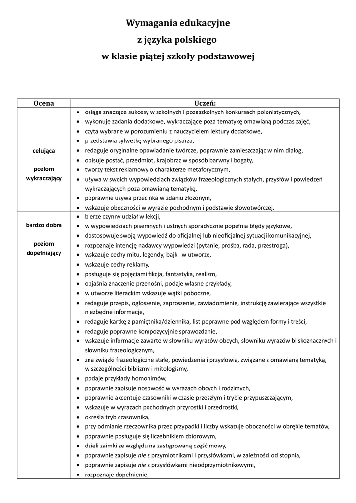 Wymagania edukacyjne z języka polskiego w klasie piątej szkoły podstawowej Ocena celująca poziom wykraczający bardzo dobra poziom dopełniający Uczeń: osiąga znaczące sukcesy w szkolnych i pozaszkolnych konkursach polonistycznych, wykonuje zadania dodatkowe, wykraczające poza tematykę omawianą podczas zajęć, czyta wybrane w porozumieniu z nauczycielem lektury dodatkowe, przedstawia sylwetkę wybranego pisarza, redaguje oryginalne opowiadanie twórcze, poprawnie zamieszczając w nim dialog, opisuje postać, przedmiot, krajobraz w sposób barwny i bogaty, tworzy tekst reklamowy o charakterze metaforycznym, używa w swoich wypowiedziach związków frazeologicznych stałych, przysłów i powiedzeń wykraczających poza omawianą tematykę, poprawnie używa przecinka w zdaniu złożonym, wskazuje oboczności w wyrazie pochodnym i podstawie słowotwórczej. bierze czynny udział w lekcji, w wypowiedziach pisemnych i ustnych sporadycznie popełnia błędy językowe, dostosowuje swoją wypowiedź do oficjalnej lub nieoficjalnej sytuacji komunikacyjnej, rozpoznaje intencję nadawcy wypowiedzi (pytanie, prośba, rada, przestroga), wskazuje cechy mitu, legendy, bajki w utworze, wskazuje cechy reklamy, posługuje się pojęciami fikcja, fantastyka, realizm, objaśnia znaczenie przenośni, podaje własne przykłady, w utworze literackim wskazuje wątki poboczne, redaguje przepis, ogłoszenie, zaproszenie, zawiadomienie, instrukcję zawierające wszystkie niezbędne informacje, redaguje kartkę z pamiętnika/dziennika, list poprawne pod względem formy i treści, redaguje poprawne kompozycyjnie sprawozdanie, wskazuje informacje zawarte w słowniku wyrazów obcych, słowniku wyrazów bliskoznacznych i słowniku frazeologicznym, zna związki frazeologiczne stałe, powiedzenia i przysłowia, związane z omawianą tematyką, w szczególności biblizmy i mitologizmy, podaje przykłady homonimów, poprawnie zapisuje nosowość w wyrazach obcych i rodzimych, poprawnie akcentuje czasowniki w czasie przeszłym i trybie przypuszczającym, wskazuje w wyrazach pochodnych przyrostki i przedrostki, określa tryb czasownika, przy odmianie rzeczownika przez przypadki i liczby wskazuje oboczności w obrębie tematów, poprawnie posługuje się liczebnikiem zbiorowym, dzieli zaimki ze względu na zastępowaną część mowy, poprawnie zapisuje nie z przymiotnikami i przysłówkami, w zależności od stopnia, poprawnie zapisuje nie z przysłówkami nieodprzymiotnikowymi, rozpoznaje dopełnienie, dobra poziom rozszerzający dostateczna poziom podstawowy przedstawia zdanie pojedyncze za pomocą schematu graficznego, odróżnia zdania podrzędne od współrzędnych, dyskutuje na temat zagadnień poruszanych w lekturach, uzasadnia własne opinie, dyskutuje na temat wartości pozytywnych oraz ich przeciwieństw wpisanych w teksty kultury (np. praca, miłość). w wypowiedziach pisemnych i ustnych popełnia nieliczne błędy językowe, wskazuje nadawcę i odbiorcę wypowiedzi (autor, narrator, czytelnik, słuchacz), wskazuje elementy świata przedstawionego w utworze literackim, wskazuje przesłanie utworu, wskazuje wątek główny utworu, stosuje akapity w swoich wypowiedziach, wskazuje przenośnie, wyrazy dźwiękonaśladowcze, poprawnie zapisuje dialog, redaguje poprawny kompozycyjnie opis przedmiotu, postaci, redaguje plan ramowy i szczegółowy, redaguje proste sprawozdanie, redaguje spójny kompozycyjnie opis krajobrazu, redaguje krótką notatkę z lektury, wyjaśnia pisownię wyrazów, przywołując poznane zasady ortograficzne, wskazuje informacje zawarte w słowniku ortograficznym i słowniku języka polskiego, rozpoznaje w wypowiedziach biblizmy i mitologizmy, dzieli głoski na: miękkie twarde, ustne i nosowe, dźwięczne i bezdźwięczne, poprawnie akcentuje wyrazy pochodzenia obcego zakończone na -ika, -yka , w parze wyrazów wskazuje wyraz podstawowy i pochodny, określa rodzaj i aspekt czasownika, odmienia rzeczownik przez przypadki i liczby, wskazuje temat i końcówkę, odmienia przymiotnik przez przypadki, liczby i rodzaje, zna i stosuje trzy typy stopniowania przymiotnika i przysłówka, odróżnia liczebnik główny, porządkowy i zbiorowy, przekształca zdania na równoważniki zdań i równoważniki na zdania, przekształca zdania pojedyncze na złożone i zdania złożone na pojedyncze, wskazuje związki poboczne w zdaniu pojedynczym, rozpoznaje przydawkę i okolicznik, zna spójniki łączące zdania współrzędne oraz podrzędne, poprawnie stawia przecinek w zdaniu pojedynczym, rozumie problematykę przeczytanych lektur, recytuje wiersz/fragment prozy, dbając o interpretację głosową, stara się uzasadniać własne opinie. popełnia w wypowiedzi ustnej lub pisemnej błędy językowe, które jednak nie wpływają na jej zrozumienie, odróżnia oficjalną sytuację komunikacyjną od nieoficjalnej, odróżnia tekst dramatu od tekstów prozatorskich i poetyckich, wskazuje strofę, wers, refren, rym, rozumie pojęcie wątek, posługuje się pojęciami związanymi z przedstawieniem teatralnym, rozpoznaje mit, legendę, bajkę, rozpoznaje notatkę z lektury, rozpoznaje formę i strukturę sprawozdania, dopuszczająca poziom konieczny identyfikuje tekst reklamowy, formułuje życzenia, gratulacje, redaguje zrozumiałe ogłoszenie, zaproszenie, przepis, instrukcję, zawiadomienie, opisuje krajobraz, podając najważniejsze jego cechy, redaguje opowiadanie odtwórcze i twórcze, wskazuje najważniejsze wydarzenia w utworze, łączy pary antonimów, rozpoznaje w tekście związki frazeologiczne, powiedzenia, przysłowia, posługuje się słownikiem wyrazów obcych, słownikiem wyrazów bliskoznacznych i słownikiem frazeologicznym, wskazuje i tworzy epitety i porównania, rozumie pojęcia przenośnia, wyraz dźwiękonaśladowczy, redaguje odtwórczy plan ramowy, zna zasady dotyczące pisowni ó-u, ż-rz, h-ch, zna zasady dotyczące pisowni wielkiej i małej litery w nazwach własnych i pospol