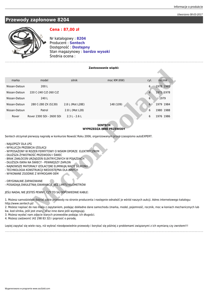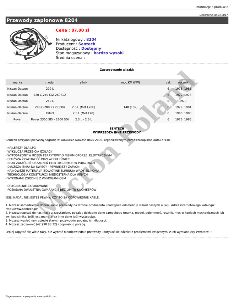 Informacje o produkcie Utworzono 08-03-2017 Przewody zapłonowe 8204 Cena : 87,00 zł Nr katalogowy : 8204 Producent : Sentech Dostępność : Dostępny Stan magazynowy : bardzo wysoki Średnia ocena : Zastosowanie wiązki: moc KM (KW) Nissan-Datsun 200 L Nissan-Datsun 220 C-240 C/Z-260 C/Z Nissan-Datsun 240 L Nissan-Datsun 280 C-280 ZX (S130) 2.8 L (Mot L28E) Nissan-Datsun Patrol 2.8 L (Mot L28) Rover Rover 2300 SDi - 2600 SDi 2.3 L - 2.6 L 148 (109) cyl. rocznik 6 1978 1985 6 1972 1978 6 1979 6 1979 1984 6 1980 1988 6 1976 1986 nd silnik la model Po marka SENTECH WYPRZEDZA INNE PRZEWODY Sentech otrzymał pierwszą nagrodę w konkursie Nowość Roku 2006, organizowanym przez czasopismo autoEXPERT. ic ro n - NAJLEPSZY DLA LPG - WYKLUCZA PRZEBICIA IZOLACJI - WYPOSAŻONY W RDZEŃ FERRYTOWY O NISKIM OPORZE ELEKTRYCZNYM - DŁUŻSZA ŻYWOTNOŚĆ PRZEWODU I ŚWIEC - BRAK ZAKŁÓCEŃ URZĄDZEŃ ELEKTRYCZNYCH W POJAZDACH - DŁUŻSZA ISKRA NA ŚWIECY - PEWNIEJSZY ZAPŁON - NAJNOWSZE MATERIAŁY IZOLACYJNE ELIMINUJĄ WADY SILIKONU - TECHNOLOGIA KONSTRUKCJI NIEDOSTĘPNA DLA INNYCH - WYKONANE ZGODNIE Z WYMOGAMI OEM - ORYGINALNIE ZAPAKOWANE - POSIADAJĄ DWULETNIĄ GWARANCJĘ BEZ LIMITU KILOMETRÓW M JEŚLI NADAL NIE JESTEŚ PEWNY, CZY TO SĄ ODPOWIEDNIE KABLE: 1. Możesz samodzielnie dobrać sobie przewody na stronie producenta i następnie odnaleźć je wśród naszych aukcji. Adres internetowego katalogu: http://www.sentech.pl/ 2. Możesz napisać do nas maila z zapytaniem, podając dokładne dane samochodu (marka, model, pojemność, rocznik, moc w koniach mechanicznych lub kw, kod silnika, jeśli jest znany oraz inne dane jeśli występują). 3. Możesz wysłać nam zdjęcie starych przewodów podając ich długości. 4. Możesz zadzwonić (42 298 83 32) i poprosić o poradę. Lepiej zapytać się wiele razy, niż wybrać nieodpowiednie przewody i borykać się później z problemami związanymi z ich wymianą czy zwrotem!!! Wygenerowano w programie www.oscGold.com