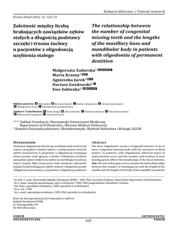Badania kliniczne / Clinical research Forum Ortod 2016; 12: 165-73 The relationship between the number of congenital missing teeth and the lengths of the maxillary base and mandibular body in patients with oligodontia of permanent dentition Zależność między liczbą brakujących zawiązków zębów stałych a długością podstawy szczęki i trzonu żuchwy u pacjentów z oligodoncją uzębienia stałego Małgorzata Zadurska1 Marta Krasny2 B F Agnieszka Jurek3 B F Dariusz Gozdowski4 C Ewa Sobieska5 A B D E F A B DE F Wkład autorów: A Plan badań B Zbieranie danych C Analiza statystyczna D Interpretacja danych E Redagowanie pracy F Wyszukiwanie piśmiennictwa Authors’ Contribution: A Study design B Data Collection C Statistical Analysis D Data Interpretation E Manuscript Preparation F Literature Search Zakład Ortodoncji, Warszawski Uniwersytet Medyczny Department of Orthodontics, Warsaw Medical Uniwersity 4 Katedra Doświadczalnictwa i Bioinformatyki, Wydział Rolnictwa i Biologii SGGW 1,2,3,5 Streszczenie Terminem oligodoncja określa się wrodzony brak sześciu lub więcej zawiązków stałych zębów, z wyłączeniem trzecich zębów trzonowych. U pacjentów z oligodoncją występują różne postaci wad zgryzu, a liczba i lokalizacja braków zawiązków zębów stałych ma wpływ na morfologię twarzowej części czaszki. Cel. Celem pracy było zbadanie zależności między liczbą brakujących zębów stałych a długością szczęki i długością trzonu żuchwy u pacjentów z oligodoncją uzębienia Abstract The term ‘oligodontia’ means a congenital absence of six or more congenital missing teeth with the exclusion of third molars. In patients with oligodontia, different types of malocclusions occur and the number and location of such missing germs affects the morphology of the facial skeleton. Aim. The aim of this paper was to examine the interrelationships between the number of missing germs and the length of the maxilla and the length of the body of the mandible in patients dr hab. n. med., Kierownik Zakładu Ortodoncji WUM / DDS, PhD, Associate Professor, Head of the Department of Orthodontics dr n. med., stażysta specjalizujący się w ortodoncji / DDS, PhD, postgraduate orthodontic resident 3 lek. dent., specjalista ortodonta / DDS, specialist in orthodontics 4 dr n. rol. / PhD 5 dr n. med., specjalista ortodonta / DDS, PhD, specialist in orthodontics 1 2 Dane do korespondencji/correspondence address: Zakład Ortodoncji WUM ul. Nowogrodzka 59 02-006 Warszawa ForumOrthodontic Ortodontyczneforum 165 Badania kliniczne / Clinical research M. Zadurska et al. stałego. Materiał. Badaniem objęto 123 pacjentów – 55 płci żeńskiej i 68 płci męskiej w wieku od 9 do 25 lat, z oligodoncją uzębienia stałego. Metody. U pacjentów wykonano zdjęcia cefalometryczne. Zbadano korelację między liczbą brakujących zawiązków zębów stałych w szczęce a długością szczęki oraz między liczbą brakujących zawiązków zębów stałych w żuchwie a długością trzonu żuchwy. Analizę statystyczną przeprowadzono z wykorzystaniem programu Excel 2003 oraz Statistica 8.0. Wyniki. Stwierdzono dużą rozpiętość w pomiarach długości szczęki (od 33,90 do 58,00 mm) i żuchwy (od 46,30 do 115,40 mm). Stwierdzono ujemną statystycznie istotną zależność (poziom p = 0,0001) między długością szczęki a liczbą brakujących zawiązków zębów stałych w szczęce. Nie stwierdzono istnienia zależności między długością trzonu żuchwy a liczbą brakujących zawiązków stałych zębów w żuchwie. Wnioski. Istnieje ujemna korelacja między długością szczęki a liczbą brakujących zawiązków zębów stałych w szczęce. Liczba brakujących zawiązków zębów stałych w żuchwie nie ma wpływu na długość trzonu żuchwy. (Zadurska M, Krasny M, Jurek A, Gozdowski D, Sobieska E. Zależność między liczbą brakujących zawiązków zębów stałych a długością podstawy szczęki i trzonu żuchwy u pacjentów z oligodoncją uzębienia stałego. Forum Ortod 2016; 12: 165-74). Nadesłano: 20.06.2016 Przyjęto do druku: 23.08.2016 Słowa kluczowe: długość szczęki, długość trzonu żuchwy, liczba brakujących zawiązków zębów Terminem oligodoncja (OMIM #604625) określa się wrodzony brak sześciu lub więcej zawiązków zębów w uzębieniu mlecznym, stałym lub w obu rodzajach uzębienia, z wyłączeniem trzecich zębów trzonowych (ryc. 1). Zęby obecne w jamie ustnej mogą mieć zmniejszone wymiary i zmieniony kształt – zęby sieczne i kły najczęściej przyjmują kształt stożkowaty, pieńkowaty lub kołkowaty, a zęby boczne mogą mieć zmniejszoną liczbę guzków na powierzchni żującej (1, 2, 3). Schalk-van der Weide (4) i Gungor (5) w swoich badaniach wykazali, że im bardziej rozległe są wrodzone braki zawiązków zębowych, tym większa redukcja wymiarów zębów. Obserwuje się także opóźnione formowanie zawiązków zębowych, opóźnione wyrzynanie zębów, ektopowe wyrzynanie kłów, transpozycję kłów z bocznymi siekaczami, taurodontyzm i obroty zębów przedtrzonowych (6, 7, 8, 9). Oligodoncja może występować jako nieprawidłowość samodzielna (oligodoncja izolowana, oligodontia/I, nonsyndromic oligodontia) lub łącznie z innymi zaburzeniami struktur pochodzących z ektodermy i mezodermy (syndromic oligodontia, oligodontia/S, oligodontia associated with syndromes) (10, 11). Obserwowana jest stosunkowo rzadko – w około 0,01% do 0,3% populacji (1, 12, 13). Według with oligodontia of permanent teeth. Material. The study involved 123 patients – 55 females and 68 males at the age from 9 to 25 years of age with oligodontia of permanent teeth. Methods. Cephalometric photographs were made of the patients. Correlation was examined between the number of missing germs and the length of the maxilla and the number of the missing germs in the mandible and the length of the body of the mandible. A statistical analysis was con