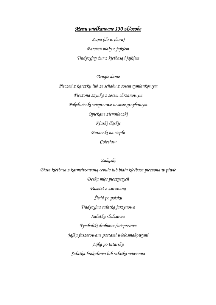 Menu wielkanocne 130 zł/osobę Zupa (do wyboru) Barszcz biały z jajkiem Tradycyjny żur z kiełbasą i jajkiem Drugie danie Pieczeń z karczku lub ze schabu z sosem tymiankowym Pieczona szynka z sosem chrzanowym Polędwiczki wieprzowe w sosie grzybowym Opiekane ziemniaczki Kluski śląskie Buraczki na ciepło Colesław Zakąski Biała kiełbasa z karmelizowaną cebulą lub biała kiełbasa pieczona w piwie Deska mięs pieczystych Pasztet z żurawiną Śledź po polsku Tradycyjna sałatka jarzynowa Sałatka śledziowa Tymbaliki drobiowe/wieprzowe Jajka faszerowane pastami wielosmakowymi Jajka po tatarsku Sałatka brokułowa lub sałatka wiosenna Deser Bufet świątecznych ciast (babka wielkanocna, sernik, makowiec, pascha wielkanocna) Napoje Kawa/herbata/woda/soki