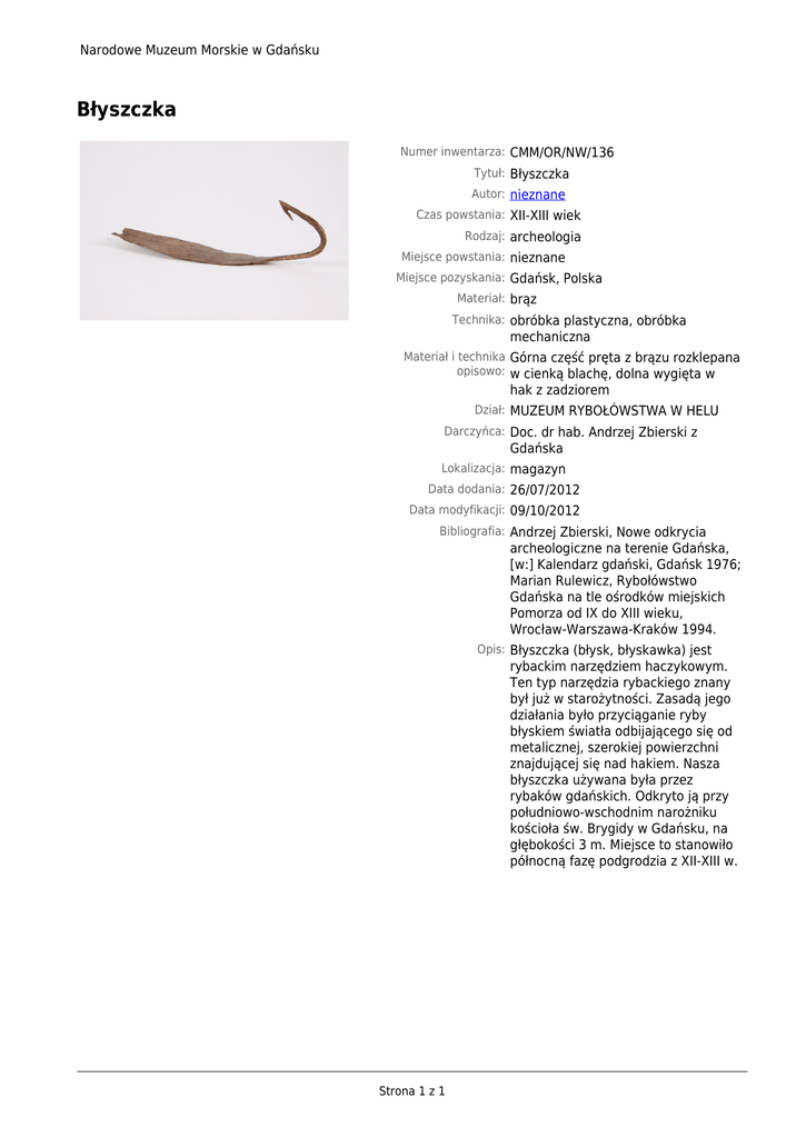 Narodowe Muzeum Morskie w Gdańsku Błyszczka Numer inwentarza: CMM/OR/NW/136 Tytuł: Błyszczka Autor: nieznane Czas powstania: XII-XIII wiek Rodzaj: archeologia Miejsce powstania: nieznane Miejsce pozyskania: Gdańsk, Polska Materiał: brąz Technika: obróbka plastyczna, obróbka mechaniczna Materiał i technika Górna część pręta z brązu rozklepana opisowo: w cienką blachę, dolna wygięta w hak z zadziorem Dział: MUZEUM RYBOŁÓWSTWA W HELU Darczyńca: Doc. dr hab. Andrzej Zbierski z Gdańska Lokalizacja: magazyn Data dodania: 26/07/2012 Data modyfikacji: 09/10/2012 Bibliografia: Andrzej Zbierski, Nowe odkrycia archeologiczne na terenie Gdańska, [w:] Kalendarz gdański, Gdańsk 1976; Marian Rulewicz, Rybołówstwo Gdańska na tle ośrodków miejskich Pomorza od IX do XIII wieku, Wrocław-Warszawa-Kraków 1994. Opis: Błyszczka (błysk, błyskawka) jest rybackim narzędziem haczykowym. Ten typ narzędzia rybackiego znany był już w starożytności. Zasadą jego działania było przyciąganie ryby błyskiem światła odbijającego się od metalicznej, szerokiej powierzchni znajdującej się nad hakiem. Nasza błyszczka używana była przez rybaków gdańskich. Odkryto ją przy południowo-wschodnim narożniku kościoła św. Brygidy w Gdańsku, na głębokości 3 m. Miejsce to stanowiło północną fazę podgrodzia z XII-XIII w. Strona 1 z 1