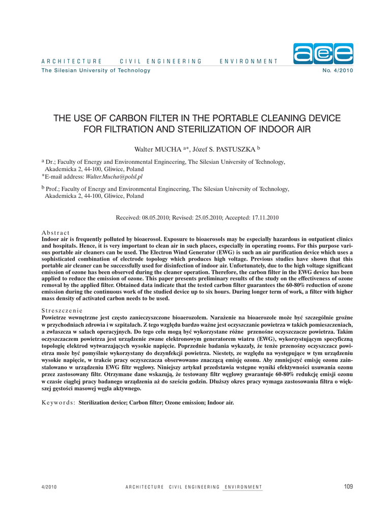 A R C H I T E C T U R E C I V I L E N G I N E E R I N G E N V I R O N M E N T T h e S i l e s i a n U n i v e r s i t y o f Te c h n o l o g y N o. 4 / 2 0 1 0 THE USE OF CARBON FILTER IN THE PORTABLE CLEANING DEVICE FOR FILTRATION AND STERILIZATION OF INDOOR AIR Walter MUCHA a*, Józef S. PASTUSZKA b a Dr.; Faculty of Energy and Environmental Engineering, The Silesian University of Technology, Akademicka 2, 44-100, Gliwice, Poland *E-mail address: [email protected] b Prof.; Faculty of Energy and Environmental Engineering, The Silesian University of Technology, Akademicka 2, 44-100, Gliwice, Poland Received: 08.05.2010; Revised: 25.05.2010; Accepted: 17.11.2010 Abstract Indoor air is frequently polluted by bioaerosol. Exposure to bioaerosols may be especially hazardous in outpatient clinics and hospitals. Hence, it is very important to clean air in such places, especially in operating rooms. For this purpose various portable air cleaners can be used. The Electron Wind Generator (EWG) is such an air purification device which uses a sophisticated combination of electrode topology which produces high voltage. Previous studies have shown that this portable air cleaner can be successfully used for disinfection of indoor air. Unfortunately, due to the high voltage significant emission of ozone has been observed during the cleaner operation. Therefore, the carbon filter in the EWG device has been applied to reduce the emission of ozone. This paper presents preliminary results of the study on the effectiveness of ozone removal by the applied filter. Obtained data indicate that the tested carbon filter guarantees the 60-80% reduction of ozone emission during the continuous work of the studied device up to six hours. During longer term of work, a filter with higher mass density of activated carbon needs to be used. Streszczenie Powietrze wewnętrzne jest często zanieczyszczone bioaerozolem. Narażenie na bioaerozole może być szczególnie groźne w przychodniach zdrowia i w szpitalach. Z tego względu bardzo ważne jest oczyszczanie powietrza w takich pomieszczeniach, a zwłaszcza w salach operacyjnych. Do tego celu mogą być wykorzystane różne przenośne oczyszczacze powietrza. Takim oczyszczaczem powietrza jest urządzenie zwane elektronowym generatorem wiatru (EWG), wykorzystującym specyficzną topologię elektrod wytwarzających wysokie napięcie. Poprzednie badania wykazały, że tenże przenośny oczyszczacz powietrza może być pomyślnie wykorzystany do dezynfekcji powietrza. Niestety, ze względu na występujące w tym urządzeniu wysokie napięcie, w trakcie pracy oczyszczacza obserwowano znaczącą emisję ozonu. Aby zmniejszyć emisję ozonu zainstalowano w urządzeniu EWG filtr węglowy. Niniejszy artykuł przedstawia wstępne wyniki efektywności usuwania ozonu przez zastosowany filtr. Otrzymane dane wskazują, że testowany filtr węglowy gwarantuje 60-80% redukcję emisji ozonu w czasie ciągłej pracy badanego urządzenia aż do sześciu godzin. Dłuższy okres pracy wymaga zastosowania filtra o większej gęstości masowej węgla aktywnego. K e y w o r d s : Sterilization device; Carbon filter; Ozone emission; Indoor air. 4/2010 ARCHITECTURE CIVIL ENGINEERING ENVIRONMENT 109