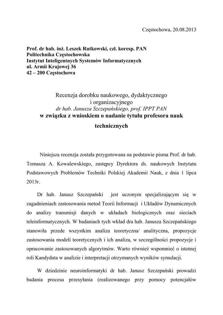 Częstochowa, 20.08.2013 Prof. dr hab. inż. Leszek Rutkowski, czł. koresp. PAN Politechnika Częstochowska Instytut Inteligentnych Systemów Informatycznych ul. Armii Krajowej 36 42 – 200 Częstochowa Recenzja dorobku naukowego, dydaktycznego i organizacyjnego dr hab. Janusza Szczepańskiego, prof. IPPT PAN w związku z wnioskiem o nadanie tytułu profesora nauk technicznych Niniejsza recenzja została przygotowana na podstawie pisma Prof. dr hab. Tomasza A. Kowalewskiego, zastępcy Dyrektora ds. naukowych Instytutu Podstawowych Problemów Techniki Polskiej Akademii Nauk, z dnia 1 lipca 2013r. Dr hab. Janusz Szczepański jest uczonym specjalizującym się w zagadnieniach zastosowania metod Teorii Informacji i Układów Dynamicznych do analizy transmisji danych w układach biologicznych oraz sieciach teleinformatycznych. W badaniach tych wkład dra hab. Janusza Szczepańskiego stanowiła przede wszystkim analiza teoretyczna/ analityczna, propozycje zastosowania modeli teoretycznych i ich analiza, w szczególności propozycje i opracowanie zastosowanych algorytmów. Warto również wspomnieć o istotnej roli Kandydata w analizie i interpretacji otrzymanych wyników symulacji. W dziedzinie neuroinformatyki dr hab. Janusz Szczepański prowadzi badania procesu przesyłania (realizowanego przy pomocy potencjałów czynnościowych, ang. Spikes) informacji w korze mózgowej pod wpływem bodźców wizualnych. Kandydat poddał analizie głównie związki pomiędzy własnościami sygnałów wejściowych a złożonością sygnałów wyjściowych, jak również własności kodowania takich układów. Kolejnym istotnym nurtem badań dra hab. Janusza Szczepańskiego jest bezpieczeństwo transmisji w sieciach teleinformatycznych pod kątem zastosowań kryptografii. W tym, jak również w pozostałych zakresach problematycznych, Kandydat uzyskał znaczący dorobek naukowy, czego dowodem są liczne artykuły opublikowane w czasopismach i w materiałach konferencji krajowych i zagranicznych. Dr hab. Janusz Szczepański od 1984 roku jest pracownikiem Instytutu Podstawowych Problemów Techniki, Zakładu Mechaniki i Fizyki Płynów PAN. W roku 1985 uzyskał doktorat z nauk technicznych, a w roku 2007 przedłożył pracę habilitacyjną na temat „Zastosowanie układów dynamicznych w kryptografii”. Dr hab. Janusz Szczepański jest autorem lub współautorem około 37 prac. Do najważniejszych z nich można zaliczyć: 1. B. Paprocki, J. Szczepański, „ How do amplitudę fluctuations affect the neuronal transmission efficiency”, Neurocomputing, Elsevier Science Publishers, 104, 50-56 (2013), 2. B. Paprocki, J. Szczepański, “Efficiency of neural transmission as a function of synaptic noise, threshold, and source characteristics”, BioSystems, Elsevier Science Publishers, 105: 62-72 (2011), 3. J. Szczepański, M.M. Arnold, E. Wajnryb, J.M. Amigo, M.V. SanchesVives, „Mutual information and redundancy in spontaneous communication between cortical neurons”, Biological Cybernetics, Springer, 104 (3) :161-174 (2011), 4. J. Szczepański, “On the distribution function of the complexity of finite sequences”, Information Sciences, Elsevier Science Publishers, 179 (9): 1217-1220 (2009), 5. J.M. Amigo, L. Kocarev, J. Szczepa…ński, “Theory and practice of chaotic cryptography”, Physics Letters A, Elsevier Science Publishers, 366(3): 211-216 (2007), 6. J. M.Amigo, L. Kocarev, J. Szczepański, „Discrete Lyapunov exponent and resistance to differentia cryptanalysis”, IEEE Transactions on Circuits and Systems II, Institute of Electrical and Electronics Engineers INC. USA, 54(10); 882-886 (2007) 7. L. Kocarev, J. Szczespański, „Finite-space Lyapunov exponents and pseudo-chaos”, Physical Review Letters, American Physical Society, 234101 1-4, Dec 3, (2004) Ogólna liczba cytowań prac dra hab. Januszcza Szczepańskiego wynosi zgodnie z bazą ISI Web of Science 259, a indeks Hirscha równa się 11. Po habilitacji opublikował 11 prac z tzw. listy filadelfijskiej. Kompetencje Kandydata do tytułu zostały dostrzeżone przez redakcje wielu czasopism, dla których recenzował prace naukowe, między innymi: IEEE Transactions on Circuits and Systems I IEEE Transactions on Circuits and Systems II Physics Letters A Neurocomputing Information Sciences Applied Mathematical Modelling Physica Scripta IET Circuits Devices & Systems Chinese Physicsa Letters IEE Sensor Journal Nonlinear Dynamics Scientia Iranica Archives of Mechanics Ponadto, dr hab. Janusz Szczepański może pochwalić się członkowstwem w wielu komitetach redakcyjnych i radach naukowych czasopism. Warto wymienić parę z tych funkcji: członek Editorial Board oraz Review Board czasopisma: International Journal of Computional Science, Hong Kong, od 2007roku członek Programming Committee Communication and Networking, konferencji Future Generation organizowanej w roku 2011- Jeju Island, Korea, a w roku 2012 w Kangwondo, Korea, podobnie w latach 2010, 2009, 2008, 2007 Członek Programming Committee konferencji The 3rd International Conference on Advanced Communication and Networking, 2011, Brno, Czechy Kandydat brał również aktywny udział w ponad trzydziestu krajowych i międzynarodowych konferencjach. Warto zwrócić uwagę na istotny udział dra hab. Janusza Szczepańskiego w wielu projektach naukowo - badawczych o zakresie krajowym oraz międzynarodowym, m. in. : 2011-2013 „Zastosowanie metod komputerowych bazujących na teorii informacji do analizy efektywności transmisji sygnałów w sieciach neuronowych”, Badania własne, grant NCN; 2005-2007 Projekt „Caos Discreto y Sys Aplicaciones a Las Communicationes Seguras”finansowany przez Hiszpańskie Ministerstwo Nauki i Edukacji. Niezależnie od imponującej działalności badawczej i organizacyjnej dr hab. Janusz Szczepański zyskał miano i reputację rzetelnego nauczyciela akademickiego, prowadzącego wykłady i seminaria na wysokim poziomie merytorycznym. Prowadził lub też