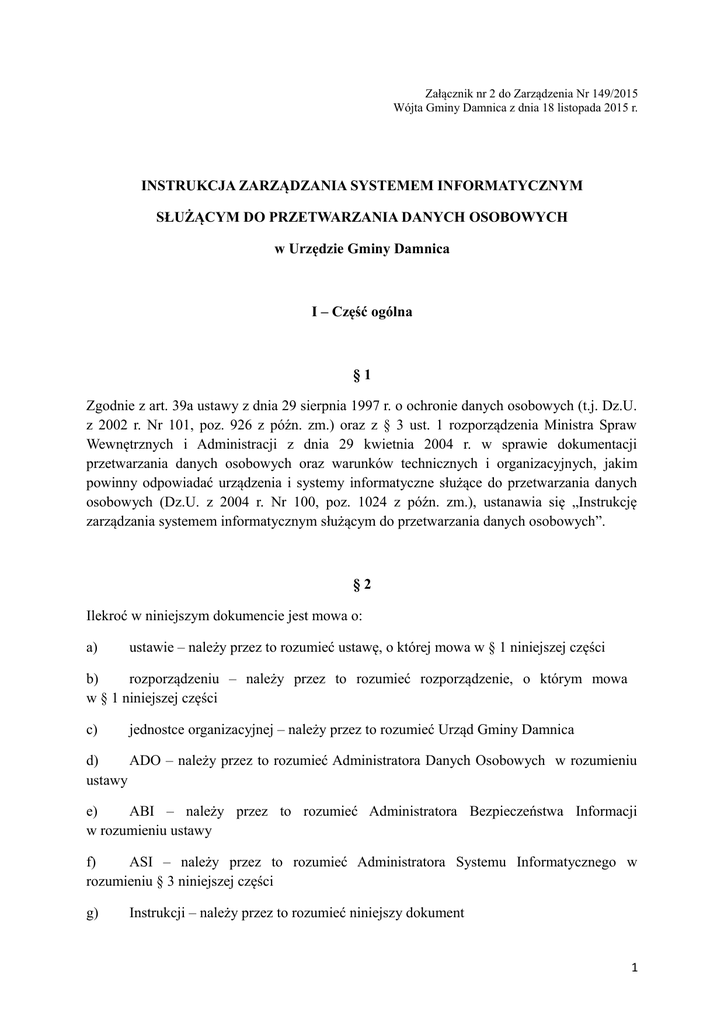 Załącznik numer 1 do „Instrukcji Zarządzania Systemem Informatycznym” Załącznik nr 2 do Zarządzenia Nr 149/2015 Wójta Gminy Damnica z dnia 18 listopada 2015 r. INSTRUKCJA ZARZĄDZANIA SYSTEMEM INFORMATYCZNYM SŁUŻĄCYM DO PRZETWARZANIA DANYCH OSOBOWYCH w Urzędzie Gminy Damnica I – Część ogólna §1 Zgodnie z art. 39a ustawy z dnia 29 sierpnia 1997 r. o ochronie danych osobowych (t.j. Dz.U. z 2002 r. Nr 101, poz. 926 z późn. zm.) oraz z § 3 ust. 1 rozporządzenia Ministra Spraw Wewnętrznych i Administracji z dnia 29 kwietnia 2004 r. w sprawie dokumentacji przetwarzania danych osobowych oraz warunków technicznych i organizacyjnych, jakim powinny odpowiadać urządzenia i systemy informatyczne służące do przetwarzania danych osobowych (Dz.U. z 2004 r. Nr 100, poz. 1024 z późn. zm.), ustanawia się „Instrukcję zarządzania systemem informatycznym służącym do przetwarzania danych osobowych”. §2 Ilekroć w niniejszym dokumencie jest mowa o: a) ustawie – należy przez to rozumieć ustawę, o której mowa w § 1 niniejszej części b) rozporządzeniu – należy przez to rozumieć rozporządzenie, o którym mowa w § 1 niniejszej części c) jednostce organizacyjnej – należy przez to rozumieć Urząd Gminy Damnica d) ADO – należy przez to rozumieć Administratora Danych Osobowych w rozumieniu ustawy e) ABI – należy przez to rozumieć Administratora Bezpieczeństwa Informacji w rozumieniu ustawy f) ASI – należy przez to rozumieć Administratora Systemu Informatycznego w rozumieniu § 3 niniejszej części g) Instrukcji – należy przez to rozumieć niniejszy dokument 1 Załącznik numer 1 do „Instrukcji Zarządzania Systemem Informatycznym” h) Polityce Bezpieczeństwa – należy przez to rozumieć przyjęty do stosowania w jednostce organizacyjnej dokument zatytułowany: „Polityka Bezpieczeństwa w Urzędzie Gminy Damnica” i) użytkowniku – należy przez to rozumieć osobę upoważnioną do przetwarzania danych osobowych w systemie informatycznym w drodze upoważnienia, o jakim mowa w części II § 4 Polityki Bezpieczeństwa. Postanowienia dotyczące użytkowników należy stosować odpowiednio do ADO oraz ABI. j) systemie informatycznym – należy przez to rozumieć system informatyczny, w którym przetwarzane są dane osobowe w jednostce organizacyjnej k) kopii pełnej – należy przez to rozumieć kopię zapasową całości danych osobowych przetwarzanych w systemie informatycznym l) osobie wyznaczonej przez ASI w sytuacji wyjątkowej – należy przez to rozumieć osobę, która podpisała oświadczenie stanowiące załącznik nr 4 do Polityki Bezpieczeństwa, otrzymała upoważnienie stanowiące załącznik nr 3 do Polityki Bezpieczeństwa, oraz została ustnie upoważniona przez ASI do dokonania określonych działań wchodzących w zakres jego obowiązków, o których mowa w części II § 4 lit. c, § 5 oraz § 8 lit. c niniejszego dokumentu. §3 ASI wyznaczany jest przez ADO drogą pisemnego upoważnienia. W przypadku nie wyznaczenia ASI, jego funkcję pełni ABI lub osoba pełniąca funkcję ABI. Wzór upoważnienia ASI stanowi załącznik nr 1 do niniejszego dokumentu. ASI jest również zobowiązany do podpisania oświadczenia, stanowiącego załącznik nr 4 do Polityki Bezpieczeństwa. §4 ASI jest odpowiedzialny za przestrzeganie zasad bezpieczeństwa przetwarzania danych osobowych w zakresie systemu informatycznego służącego do tego celu. Do obowiązków ASI należy także kontrola przepływu informacji pomiędzy systemem informatycznym a siecią publiczną oraz kontrola działań inicjowanych z sieci publicznej i systemu informatycznego. Obowiązkiem ASI jest również zabezpieczenie sprzętu komputerowego przed nieuprawnionym dostępem oraz przeprowadzanie analizy ryzyka uwzględniającej realne zagrożenia dla systemu informatycznego. §5 Zgodnie z rozporządzeniem, uwzględniając fakt, że użytkowany w jednostce organizacyjnej 2 Załącznik numer 1 do „Instrukcji Zarządzania Systemem Informatycznym” system informatyczny służący do przetwarzania danych osobowych jest połączony z siecią Internet, wprowadza się wysoki poziom bezpieczeństwa. II – Część szczegółowa §1 Procedury nadawania uprawnień do przetwarzania danych i rejestrowania tych uprawnień w systemie informatycznym określa się w sposób następujący: a) Użytkownik zamierzający przetwarzać dane osobowe, po uzyskaniu upoważnienia stanowiącego załącznik nr 3 do Polityki Bezpieczeństwa, oraz podpisaniu oświadczenia stanowiącego załącznik nr 4 do Polityki Bezpieczeństwa, składa ustnie wniosek do ASI o nadanie identyfikatora i hasła w celu umożliwienia wykonywania przetwarzania danych osobowych w systemie informatycznym, ASI zobowiązany jest niezwłocznie przydzielić użytkownikowi identyfikator i hasło. Podanie użytkownikowi hasła nie może nastąpić w sposób umożliwiający zapoznanie się z nim osobom trzecim. b) w przypadku wygaśnięcia przesłanek uprawniających użytkownika do przetwarzania danych osobowych, w szczególności cofnięcia upoważnienia, stanowiącego załącznik nr 3 do Polityki Bezpieczeństwa, ASI zobowiązany jest do dopełnienia czynności uniemożliwiających ponowne wykorzystanie identyfikatora użytkownika, którego uprawnienia wygasły. §2 Stosuje się następujące metody oraz środki uwierzytelniania, a także procedury związane z ich zarządzaniem i użytkowaniem: a) hasło składa się, z co najmniej 8 znaków, zawiera małe i wielkie litery oraz cyfry lub znaki specjalne b) osobą odpowiedzialną za przydział identyfikatora i pierwszego hasła jest ASI c) użytkownik, po pierwszym zalogowaniu się do systemu jest zobowiązany do zmiany hasła, jest również zobowiązany do zmiany hasła, co każde 30 dni d) użytkownik jest zobowiązany do zabezpieczenia swojego hasła przed nieuprawnionym dostępem osób trzecich 3 Załącznik numer 1 do „Instrukcji Zarządzania Syst