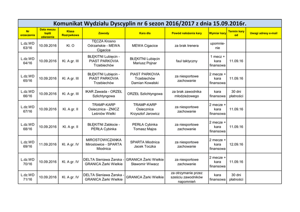 Komunikat Wydziału Dyscyplin nr 6 sezon 2016/2017 z dnia 15.09.2016r. Nr orzeczenia Data meczu bądź zdarzenia Klasa Rozrywkowa Zawody Kara dla Powód nałożenia kary Wymiar kary L.dz.WD 63/16 10.09.2016 Kl. O TĘCZA Krosno Odrzańskie - MEWA Cigacice MEWA Cigacice za brak trenera upomnienie L.dz.WD 64/16 10.09.2016 Kl. A gr. III BŁĘKITNI Lubięcin PIAST PARKOVIA Trzebiechów BŁĘKITNI Lubięcin Mariusz Pojnar faul taktyczny 1 mecz + kara finansowa PIAST PARKOVIA Trzebiechów Damian Kowalski za niesportowe zachowanie Termin kary od 11.09.16 L.dz.WD 65/16 10.09.2016 Kl. A gr. III BŁĘKITNI Lubięcin PIAST PARKOVIA Trzebiechów L.dz.WD 66/16 10.09.2016 Kl. A gr. III IKAR Zawada - ORZEŁ Szlichtyngowa ORZEŁ Szlichtyngowa za brak zawodnika młodzieżowego L.dz.WD 67/16 10.09.2016 Kl. A gr. II TRAMP-KARP Osiecznica - ZNICZ Leśniów Wielki TRAMP-KARP Osiecznica Krzysztof Jarowicz za niesportowe zachowanie 2 mecze + kara 11.09.16 finansowa L.dz.WD 68/16 10.09.2016 Kl. A gr. II BŁĘKITNI Zabłocie PERŁA Cybinka PERŁA Cybinka Tomasz Majos za niesportowe zachowanie 2 mecze + kara 11.09.16 finansowa L.dz.WD 69/16 11.09.2016 Kl. A gr. IV MIROSTOWICZANKA Mirostowice - SPARTA Miodnica SPARTA Miodnica Jacek Toczka za niesportowe zachowanie 2 mecze + kara 12.09.16 finansowa L.dz.WD 70/16 10.09.2016 Kl. A gr. IV DELTA Sieniawa Żarska - GRANICA Żarki Wielkie GRANICA Żarki Wielkie Sławomir Wiwacz za niesportowe zachowanie 2 mecze + kara 11.09.16 finansowa L.dz.WD 71/16 10.09.2016 Kl. A gr. IV DELTA Sieniawa Żarska GRANICA Żarki Wielkie GRANICA Żarki Wielkie za otrzymanie przez sześciu zawodników napomnień 2 mecze + kara 11.09.16 finansowa kara finansowa kara finansowa 30 dni płatności 30 dni płatności Uwagi adresy e-mail za dokonanie nieprawdziwego zapisu zdarzeń w sprawozdaniu EXTRANET za zawinione i nieusprawiedliwione opóźnienie rozpoczęcia zawodów Kl. A gr. II BŁĘKITNI Zabłocie PERŁA Cybinka sędzia Grzegorz Jurojć 11.09.2016 Kl. A gr. II STAL Jasień - RELAX Grabice RELAX Grabice L.dz.WD 74/16 11.09.2016 O. Liga Jun. Młod. KS FALUBAZ II Zielona Góra - FUNDACJA MŁODY TALENT Żary sędzia Filip Gąsior L.dz.WD 75/16 21.08.2016 Kl. A gr. II ENERGETYK Dychów SPARTA Mierków SPARTA Mierków za brak zawodnika młodzieżowego kara finansowa 30 dni płatności BESKID Bożnów za wycofanie drużyny z rozgrywek kara finansowa 30 dni płatności L.dz.WD 72/16 10.09.2016 L.dz.WD 73/16 L.dz.WD 76/16 Kl. A gr. IV kara finansowa 30 dni płatności kara finansowa 30 dni płatności za nieusprawiedliwioną kara nieobecność na zawodach finansowa 30 dni płatności L.dz.WD 77/16 RELAX Grabice zawieszenie licencji klubu L.dz.WD 78/16 ZNICZ Leśniów Wielki zawieszenie licencji klubu L.dz.WD 79/16 SPARTA Nietków zawieszenie licencji klubu kara biegnie od 19.09.16 aż do ustania przyczyny kara biegnie od 19.09.16 aż do ustania przyczyny kara biegnie od 19.09.16 aż do ustania przyczyny L.dz.WD 80/16 MIROSTOWICZANKA Mirostowice zawieszenie licencji klubu kara biegnie od 19.09.16 aż do ustania przyczyny 2 mecze + kara 11.09.16 finansowa L.dz.WD 81/16 10.09.2016 IV Liga KORONA Kożuchów LUBUSZANIN Drezdenko KORON Kożuchów Marcin Janik niesportowe zachowanie L.dz.WD 82/16 10.09.2016 IV Liga MEPROZET Stare Kunowo - ARKA Nowa Sól MEPROZET Stare Kunowo Grzegorz Korczyński faul taktyczny 1 mecz + kara finansowa 11.09.16 L.dz.WD 83/16 11.09.2016 II Liga O. Jun. Młod. SANTOS Świebodzin KS FALUBAZ II Zielona Góra SANTOS Świebodzin za niestawienie się na zawody kara finansowa 30 dni płatności L.dz.WD 84/16 04.09.2016 I Liga Woj. A1 ZAP JUNIOR Zbąszynek BUDOWLANI Lubsko Jun. Gr. 1 BUDOWLANI Lubsko za grę nieuprawnionego zawodnika kara finansowa 30 dni płatności L.dz.WD 85/16 10.09.2016 MEWA Cigacice za niestawienie się na zawody kara finansowa 30 dni płatności L.dz.WD 86/16 I Liga Woj. 27.08.2016 Jun. Star. Gr. 1 BUDOWLANI Lubsko DĄB Przybyszów BUDOWLANI Lubsko za grę siedmiu nieuprawionych zawodników kara finansowa 30 dni płatności L.dz.WD 87/16 04.09.2016 II Liga O. Jun. Młod. SOKÓŁ Kalsk - MKS Nowe Miasteczko MKS Nowe Miasteczko za niestawienie się na zawody kara finansowa 30 dni płatności L.dz.WD 88/16 03.09.2016 II Liga O. Tramp. KORONA Kożuchów POGOŃ Przyborów POGOŃ Przyborów za niestawienie się na zawody kara finansowa 30 dni płatności L.dz.WD 89/16 10.09.2016 I Liga O. Tramp. za grę nieuprawnionego zawodnika kara finansowa 30 dni płatności za wycofanie się z rozgrywek kara finansowa 30 dni płatności L.dz.WD 90/16 II Liga O. D1 ZAP JUNIOR Zbąszynek Młodzik gr. 2 MEWA Cigacice Liga Orlików podokręg Nowa Sól ODRA Bytom Odrzański ODRA Bytom Odrzański BUDOWLANI Lubsko CZARNI Rudno L.dz.WD 91/16 III Liga O. Jun. Młod. BŁĘKITNI Lubięcin za wycofanie się z rozgrywek kara finansowa 30 dni płatności L.dz.WD 92/16 III Liga O. Jun. Młod. RELAX Grabice za wycofanie się z rozgrywek kara finansowa 30 dni płatności L.dz.WD 93/16 III Liga O. Jun. Młod. CARINA Gubin za wycofanie się z rozgrywek kara finansowa 30 dni płatności DĄB Przybyszów za wycofanie się z rozgrywek kara finansowa 30 dni płatności ORZEŁ Stare Strącze za wycofanie się z rozgrywek kara finansowa 30 dni płatności MOTO Koło za wycofanie się z rozgrywek kara finansowa 30 dni płatności za brak należytego kara zabezpieczenia porządku finansowa 30 dni płatności Liga Orlików podokręg Nowa Sól Kl. B podokręg Nowa Sól Kl. B podokręg Nowa Sól L.dz.WD 94/16 L.dz.WD 95/16 L.dz.WD 96/16 L.dz.WD 97/16 03.09.2016 Kl. O PROMIEŃ Żary - UNIA Kunice Żarskie PROMIEŃ Żary