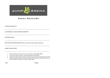 Zgoda Rodziców JANIŻEJPODPISANY/A ........................................................................................................................................................................................ LEGITYMUJĄCY/ASIĘDOWODEMOSOBISTYM ........................................................................................................................................................................................ WYDANYMPRZEZ ........................................................................................................................................................................................ JAKORODZIC/OPIEKUNPRAWNY(imię,nazwiskoidataurodzeniadziecka) ........................................................................................................................................................................................ NUMERKONTAKTOWY ........................................................................................................................................................................................ § § § § Wyrażamzgodęnakorzystanieprzezw/wdzieckozatrakcjiJUMPARENY PotwierdzampełnąznajomośćiakceptujęRegulaminJUMPARENY Odwołanieniniejszejzgodywymagazachowaniaformypisemnejpodrygoremnieważności OdwołaniezgodyrozumianejestprzezdostarczenieoświadczeniasiedzibyJumpAreny,Do tegoczaszgodajestwiążącaiwywołujewszelkieskutki. DataPodpis