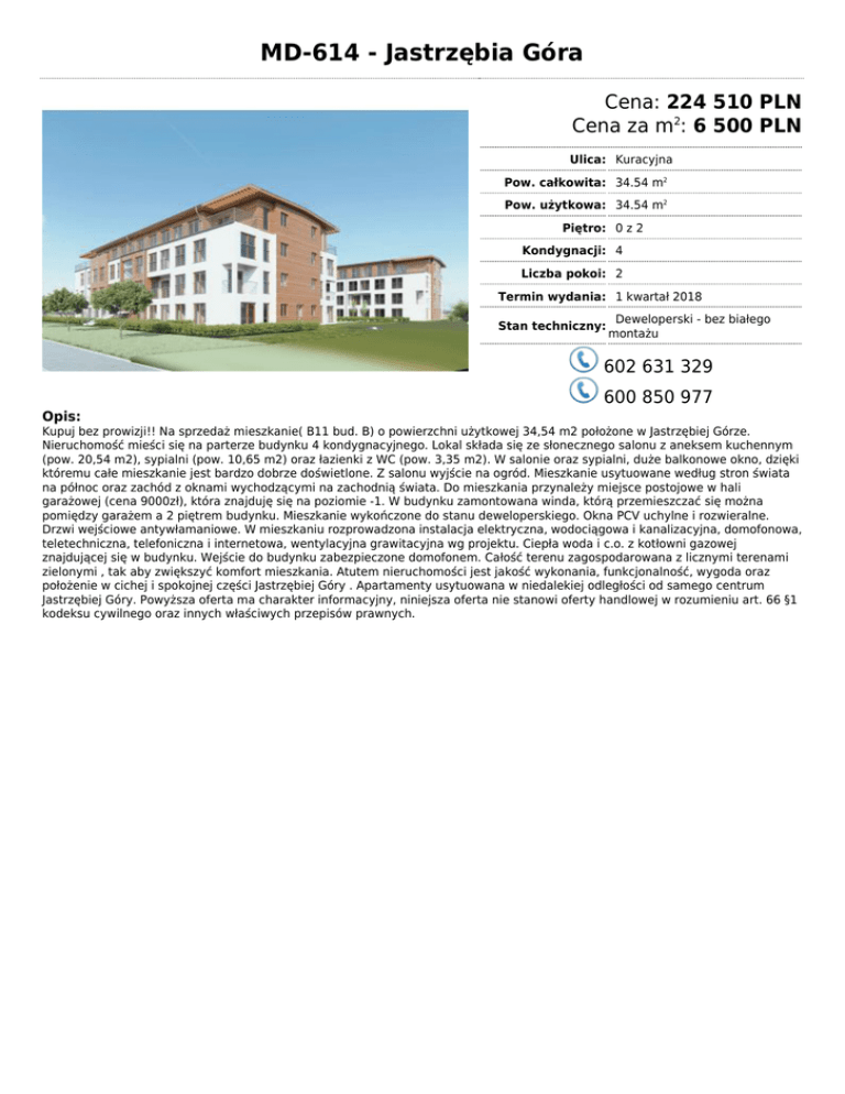 MD-614 - Jastrzębia Góra Cena: 224 510 PLN Cena za m2: 6 500 PLN Ulica: Kuracyjna Pow. całkowita: 34.54 m2 Pow. użytkowa: 34.54 m2 Piętro: 0 z 2 Kondygnacji: 4 Liczba pokoi: 2 Termin wydania: 1 kwartał 2018 Stan techniczny: Deweloperski - bez białego montażu 602 631 329 600 850 977 Opis: Kupuj bez prowizji!! Na sprzedaż mieszkanie( B11 bud. B) o powierzchni użytkowej 34,54 m2 położone w Jastrzębiej Górze. Nieruchomość mieści się na parterze budynku 4 kondygnacyjnego. Lokal składa się ze słonecznego salonu z aneksem kuchennym (pow. 20,54 m2), sypialni (pow. 10,65 m2) oraz łazienki z WC (pow. 3,35 m2). W salonie oraz sypialni, duże balkonowe okno, dzięki któremu całe mieszkanie jest bardzo dobrze doświetlone. Z salonu wyjście na ogród. Mieszkanie usytuowane według stron świata na północ oraz zachód z oknami wychodzącymi na zachodnią świata. Do mieszkania przynależy miejsce postojowe w hali garażowej (cena 9000zł), która znajduję się na poziomie -1. W budynku zamontowana winda, którą przemieszczać się można pomiędzy garażem a 2 piętrem budynku. Mieszkanie wykończone do stanu deweloperskiego. Okna PCV uchylne i rozwieralne. Drzwi wejściowe antywłamaniowe. W mieszkaniu rozprowadzona instalacja elektryczna, wodociągowa i kanalizacyjna, domofonowa, teletechniczna, telefoniczna i internetowa, wentylacyjna grawitacyjna wg projektu. Ciepła woda i c.o. z kotłowni gazowej znajdującej się w budynku. Wejście do budynku zabezpieczone domofonem. Całość terenu zagospodarowana z licznymi terenami zielonymi , tak aby zwiększyć komfort mieszkania. Atutem nieruchomości jest jakość wykonania, funkcjonalność, wygoda oraz położenie w cichej i spokojnej części Jastrzębiej Góry . Apartamenty usytuowana w niedalekiej odległości od samego centrum Jastrzębiej Góry. Powyższa oferta ma charakter informacyjny, niniejsza oferta nie stanowi oferty handlowej w rozumieniu art. 66 §1 kodeksu cywilnego oraz innych właściwych przepisów prawnych.