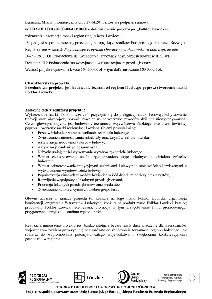 Burmistrz Miasta informuje, iż w dniu 29.04.2011 r. została podpisana umowa nr UDA-RPLD.03.02.00-00-413/10-00 o dofinansowanie projektu pn. „Folklor Łowicki – wdrożenie i promocja marki regionalnej miasta Łowicza”. Projekt jest współfinansowany przez Unię Europejską ze środków Europejskiego Funduszu Rozwoju Regionalnego w ramach Regionalnego Programu Operacyjnego Województwa Łódzkiego na lata 2007 – 2013 (Oś Priorytetowa III Gospodarka, innowacyjność, przedsiębiorczość RPO WŁ , Działanie III.2 Podnoszenie innowacyjności i konkurencyjności przedsiębiorstw. Wartość projektu opiewa na kwotę 334 000,00 zł w tym dofinansowanie 150 000,00 zł. Charakterystyka projektu: Przedmiotem projektu jest budowanie tożsamości regionu łódzkiego poprzez stworzenie marki Folklor Łowicki. Założone efekty realizacji projektu: Wykreowanie marki „Folklor Łowicki” przyczyni się do pielęgnacji sztuki ludowej, kultywowanie tradycji oraz obyczajów, pozwoli również na odtworzenie zawodów dziś już niewykonywanych. Celem głównym projektu jest budowanie tożsamości województwa łódzkiego oraz ziemi łowickiej poprzez utworzenie marki regionalnej Łowicza. Celami pośrednimi są: Przeciwdziałanie procesom zanikania rzemiosła ludowego, Zwiększanie zainteresowania młodzieży oraz turystów kulturą łowicka, Aktywizacja środowiska twórców ludowych, Aktywizacja osób niepełnosprawnych, Nabycie umiejętności wytwarzania wyrobów rękodzieła ludowego, Wzrost zainteresowania szkół organizowaniem zajęć szkolnych z udziałem twórców ludowych, Wzrost zainteresowania tradycyjnymi technikami ludowymi i możliwościami związanymi z wytwarzaniem wyrobów sztuki ludowej, Popularyzacja ginących zawodów łowickich wśród dzieci, młodzieży oraz turystów, Rozwijanie współpracy z lokalnymi przedsiębiorcami, Promocja lokalnych przedsiębiorstw oraz produktów, Zwiększanie konkurencyjności lokalnej gospodarki. Główne zadania w ramach projektu to: konkurs na logo marki Folklor Łowicki, organizacja konferencji, organizacja Warsztatów Ludowych, konkurs na produkt marki Folklor Łowicki, katalog produktów Folklor Łowicki, elementarz, promocja w tym przygotowanie filmu promocyjnego, przygotowanie projektu – studium wykonalności. Realizacja niniejszego projektu jest bardzo istotna i będzie miała duże znaczenie dla mieszkańców województwa bowiem przyczyni się ona zarówno do zbudowania tożsamości regionu łódzkiego, jak również do wypromowania potencjału całego województwa i zwiększania konkurencyjności gospodarki w regionie. FUNDUSZE EUROPEJSKIE DLA ROZWOJU REGIONU ŁÓDZKIEGO Projekt współfinansowany przez Unię Europejską z Europejskiego Funduszu Rozwoju Regionalnego