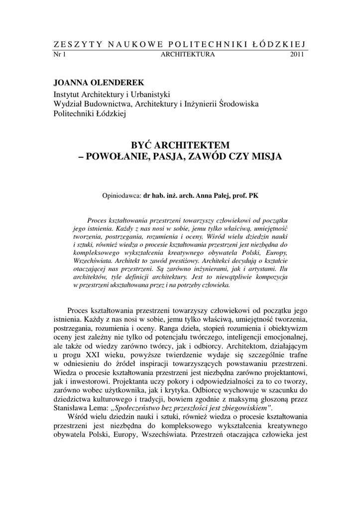 ZESZYTY NAUKOWE POLITECHNIKI ŁÓDZKIEJ Nr 1 ARCHITEKTURA 2011 JOANNA OLENDEREK Instytut Architektury i Urbanistyki Wydział Budownictwa, Architektury i Inżynierii Środowiska Politechniki Łódzkiej BYĆ ARCHITEKTEM – POWOŁANIE, PASJA, ZAWÓD CZY MISJA Opiniodawca: dr hab. inż. arch. Anna Palej, prof. PK Proces kształtowania przestrzeni towarzyszy człowiekowi od początku jego istnienia. Każdy z nas nosi w sobie, jemu tylko właściwą, umiejętność tworzenia, postrzegania, rozumienia i oceny. Wśród wielu dziedzin nauki i sztuki, również wiedza o procesie kształtowania przestrzeni jest niezbędna do kompleksowego wykształcenia kreatywnego obywatela Polski, Europy, Wszechświata. Architekt to zawód prestiżowy. Architekci decydują o kształcie otaczającej nas przestrzeni. Są zarówno inżynierami, jak i artystami. Ilu architektów, tyle definicji architektury. Jest to niewątpliwie kompozycja w przestrzeni ukształtowana przez i na potrzeby człowieka. Proces kształtowania przestrzeni towarzyszy człowiekowi od początku jego istnienia. Każdy z nas nosi w sobie, jemu tylko właściwą, umiejętność tworzenia, postrzegania, rozumienia i oceny. Ranga dzieła, stopień rozumienia i obiektywizm oceny jest zależny nie tylko od potencjału twórczego, inteligencji emocjonalnej, ale także od wiedzy zarówno twórcy, jak i odbiorcy. Architektom, działającym u progu XXI wieku, powyższe twierdzenie wydaje się szczególnie trafne w odniesieniu do źródeł inspiracji towarzyszących powstawaniu przestrzeni. Wiedza o procesie kształtowania przestrzeni jest niezbędna zarówno projektantowi, jak i inwestorowi. Projektanta uczy pokory i odpowiedzialności za to co tworzy, zarówno wobec użytkownika, jak i krytyka. Odbiorcę wychowuje w szacunku do dziedzictwa kulturowego i tradycji, bowiem zgodnie z maksymą głoszoną przez Stanisława Lema: „Społeczeństwo bez przeszłości jest zbiegowiskiem”. Wśród wielu dziedzin nauki i sztuki, również wiedza o procesie kształtowania przestrzeni jest niezbędna do kompleksowego wykształcenia kreatywnego obywatela Polski, Europy, Wszechświata. Przestrzeń otaczająca człowieka jest 28 Joanna Olenderek przecież jednym z istotnych czynników formujących jego świadomość, a ARS SINE SCIENTIA NIHIL EST. W ramach wystaw towarzyszących Festiwalom Nauki, Techniki i Sztuki w Łodzi, od początku obecnego trzeciego tysiąclecia, są prezentowane prace projektowe studentów i dyplomantów kierunku Architektura i Urbanistyka. Czy są to projekty znaczące dla ewolucji przestrzennej i przyszłego dziedzictwa architektonicznego miasta? Łódź, książkowa „Ziemia obiecana” naszego noblisty Władysława Stanisława Reymonta, także w czasach obecnych rozwija się równie burzliwie, aczkolwiek znacznie harmonijniej i inaczej, niż w epoce maszyny parowej. Nowe są bowiem uwarunkowania polityczno-społeczno-ekonomiczne obecnego okresu odradzania państwowości polskiej w nowych okolicznościach przynależności europejskiej. A przecież są one niezmiernie istotne w procesie kształtowania przestrzeni. Stanowią zasadnicze tło działań twórczych projektantów. Istnieje zatem potrzeba naświetlenia szeregu czynników stymulujących i warunkujących procesy inwestycyjne, w postaci ustawodawstwa, struktury terenowoadministracyjno-demograficznej, preferencji ideowych mecenatu, dziedzictwa kulturowego, polityki kredytowej i edukacyjnej. Spośród nich, w przypadku Łodzi, na pierwsze miejsce wysuwa się awans akademicki miasta, który skłania m.in. młodych ludzi, aby "zainwestowali w przestrzeń wokół siebie", a przede wszystkim w swą edukację i zostali wybitnymi architektami. Architekt to zawód prestiżowy. Architekci decydują o kształcie otaczającej nas przestrzeni. Są zarówno inżynierami, jak i artystami. Indywidualnie mogą dokonać wyboru, szukając równowagi pomiędzy artystyczną kreatywnością a racjonalizmem. Zawód architekta wymaga umiejętności zarówno plastycznych, jak i inżynierskich oraz wyjątkowych cech osobowości. Szczególną wagę należy przypisać wyobraźni. W odniesieniu do zawodu architekta, określenie powołanie nabiera, w świetle współczesnej transformacji świata, nowego znaczenia. Zgodnie z definicją (wg Słownika Języka Polskiego) pojęcie to oznacza posiadanie określonego daru do wykonywania danej czynności przez większą część życia. W przypadku architektury jako pracy trzeba mieć do niej powołanie, bowiem czynność tę wykonuje się bardziej z pobudek altruistycznych niż finansowych, choć te drugie, szczególnie w obecnych czasach urynkowienia gospodarki, nabierają również znaczenia. Z powołaniem wiąże się nierozerwalnie pasja − "wielkie zamiłowanie do czegoś". W tym przypadku architektura, jako obiekt tego upodobania, stanowi dziedzinę, którą ktoś zajmuje się z namiętnością. Zgodnie ze słownikiem języka francuskiego passion oznacza namiętność, ale obok entuzjazmu, w zajmowaniu się czymś z namiętnością, na architekta zgodnie z łacińskim tłumaczeniem słowa passio "cierpienie" czyha na każdym kroku męka tworzenia. Dlatego, mimo że zawód architekt jest zawodem wybranym, objętym europejską regulacją, w polskiej nomenklaturze uznany jako wolny zawód, to faktycznie jest zawodem, jak twierdzą architekci, niewolniczym − zniewalającym. Zajęcie to jest posłannictwem, a zatem misją, czyli ważnym odpowiedzialnym zadaniem do spełnienia. I tylko takie podejście do zawodu architekta pozwala na spełnianie oczekiwań społecznych, jest gwarancją prestiżu architektów. Jak słusznie zauważył Akos Być architektem – powołanie, pasja, zawód czy misja 29 Moravansky we wprowadzeniu do znakomicie zredagowanego opracowania Architekturtheorie im 20. Jahrhundert, od czasu kiedy Witruwiusz zapoczątkował wywód dotyczący genezy słowa "architektura", dyskusja o architekturze nie ustaje. Heidegger określił mowę jako "Haus 