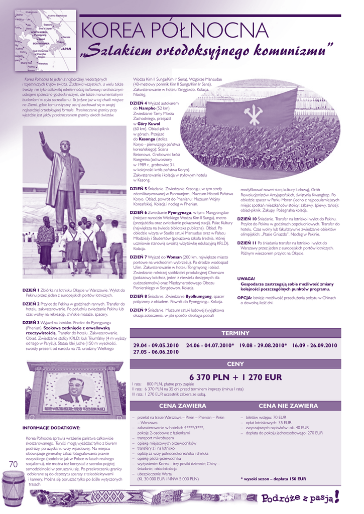 KOREA Pó¸nocna „Szlakiem ortodoksyjnego komunizmu” Korea Pó∏nocna to jeden z najbardziej niedost´pnych i tajemniczych krajów Êwiata. Zadziwia wszystkich, a wielu tak˝e trwo˝y, nie tyko ca∏kowità odmiennoÊcià kulturowà i archaicznym ustrojem spo∏eczno-gospodaraczym, ale tak˝e monumentalnymi budowlami w stylu socrealizmu. To jedyne ju˝ w tej chwili miejsce na Ziemi, gdzie komunistyczny ustrój zachowa∏ si´ w swojej najbardziej ortodoksyjnej formule. Przekroczenie granicy przy wjeêdzie jest jakby przekroczeniem granicy dwóch Êwiatów. Wodza Kim Il Sunga/Kim Ir Sena), Wzgórze Mansudae (40-metrowy pomnik Kim Il Sunga/Kim Ir Sena). Zakwaterowanie w hotelu Yanggakdo. Kolacja. Nocleg. DZIE¡ 4 Wyjazd autokarem do Nampho (52 km). Zwiedzanie Tamy Morza Zachodniego, przejazd w Góry Kuwol (60 km). Obiad-piknik w górach. Przejazd do Kesongu (stolica Koryo - pierwszego paƒstwa koreaƒskiego): Âciana Betonowa, Grobowiec króla Kongmina (odtworzony w 1989 r., grobowiec 31. w kolejnoÊci króla paƒstwa Koryo). Zakwaterowanie i kolacja w stylowym hotelu w Kesong. DZIE¡ 5 Âniadanie. Zwiedzanie Kesongu, w tym strefy zdemilitaryzowanej w Panmunjom, Muzeum Historii Paƒstwa Koryo. Obiad, powrót do Phenianu: Muzeum Wojny Koreaƒskiej. Kolacja i nocleg w Phenian. DZIE¡ 6 Zwiedzanie Pyongynagu, w tym: Mangyongdae (miejsce narodzin Wielkiego Wodza Kim Il Sunga), metro (przeja˝d˝ka oraz zwiedzanie pokazowej stacji), Pa∏ac Kultury (najwi´ksza na Êwiecie biblioteka publiczna). Obiad. Po obiedzie wizyta w Studio sztuki Mansudae oraz w Pa∏acu M∏odzie˝y i Studentów (pokazowa szko∏a Êrednia, której uczniowie stanowià swoistà wizytówk´ edukacyjnà KRLD). Kolacja. DZIE¡ 1 Zbiórka na lotnisku Ok´cie w Warszawie. Wylot do Pekinu przez jeden z europejskich portów lotniczych. DZIE¡ 2 Przylot do Pekinu w godzinach rannych. Transfer do hotelu, zakwaterowanie. Po po∏udniu zwiedzanie Pekinu lub czas wolny na rekreacj´, chiƒskie masa˝e, spacery. DZIE¡ 3 Wyjazd na lotnisko. Przelot do Pyongyangu (Phenian). Szokowe zetkni´cie z orwellowskà rzeczywistoÊcià. Transfer do hotelu. Zakwaterowanie. Obiad. Zwiedzanie stolicy KRLD: ¸uk Triumfalny (4 m wy˝szy od tego w Pary˝u), Statua Idei Juche (150 m wysokoÊci, swoisty prezent od narodu na 70. urodziny Wielkiego DZIE¡ 7 Wyjazd do Wonsan (200 km, najwi´ksze miasto portowe na wschodnim wybrze˝u). Po drodze wodospad Ulim. Zakwaterowanie w hotelu Tongmyong i obiad. Zwiedzanie rolniczej spó∏dzielni produkcyjnej Chonsam (pokazowy ko∏choz, jeden z niewielu dost´pnych dla cudzoziemców) oraz Mi´dzynarodowego Obozu Pionierskiego w Songdowon. Kolacja. DZIE¡ 8 Âniadanie. Zwiedzanie Byolkumgang, spacer po∏àczony z obiadem. Powrót do Pyongyangu. Kolacja. modyfikowaç nawet starà kultur´ ludowà), Grób Rewolucjonistów Antyjapoƒskich, Êwiàtynia Kwangbop. Po obiedzie spacer w Parku Moran (jedno z najpopularniejszych miejsc spotkaƒ mieszkaƒców stolicy: zabawy, Êpiewy, taƒce); obiad-piknik. Zakupy. Po˝egnalna kolacja. DZIE¡ 10 Âniadanie. Transfer na lotnisko i wylot do Pekinu. Przylot do Pekinu w godzinach popo∏udniowych. Transfer do hotelu. Czas wolny lub fakultatywnie zwiedzanie obiektów olimpijskich; „Ptasie Gniazdo”. Nocleg w Pekinie. DZIE¡ 11 Po Êniadaniu transfer na lotnisko i wylot do Warszawy przez jeden z europejskich portów lotniczych. Póênym wieczorem przylot na Ok´cie. UWAGA! Gospodarze zastrzegajà sobie mo˝liwoÊç zmiany kolejnoÊci poszczególnych punktów programu. OPCJA: Istnieje mo˝liwoÊç przed∏u˝enia pobytu w Chinach o dowolnà iloÊç dni. DZIE¡ 9 Âniadanie. Muzeum sztuki ludowej (wyjàtkowa okazja zobaczenia, w jaki sposób ideologia potrafi TERMINY 29.04 - 09.05.2010 27.05 - 06.06.2010 24.06 - 04.07.2010* 19.08 - 29.08.2010* 16.09 - 26.09.2010 CENY 6 370 PLN + 1 270 EUR I rata: 800 PLN, p∏atne przy zapisie II rata: 6 370 PLN na 35 dni przed terminem imprezy (minus I rata) III rata: 1 270 EUR uczestnik zabiera ze sobà. CENA ZAWIERA INFORMACJE DODATKOWE: 70 Korea Pó∏nocna sprawia wra˝enie paƒstwa ca∏kowicie skoszarowanego. TuryÊci mogà wje˝d˝aç tylko z biurem podró˝y, po uzyskaniu wizy wjazdowej. Na miejscu obowiàzuje generalny zakaz fotografowania prawie wszystkiego (podobnie jak w Polsce w latach realnego socjalizmu), nie mo˝na te˝ korzystaç z szeroko poj´tej samodzielnoÊci w poruszaniu si´. Po przekroczeniu granicy odbierane sà do depozytu aparaty z teleobiektywami i kamery. Mo˝na si´ poruszaç tylko po ÊciÊle wytyczonych trasach. – przelot na trasie Warszawa – Pekin – Phenian – Pekin – Warszawa – zakwaterowanie w hotelach 4****/3***, pokoje 2-osobowe z ∏azienkami – transport mikrobusem – opiek´ miejscowych przewodników – transfery z i na lotnisko – op∏at´ za wizy pó∏nocnokoreaƒska i chiƒska – opiek´ pilota-przewodnika – wy˝ywienie: Korea – trzy posi∏ki dziennie; Chiny – Êniadanie, obiadokolacja – ubezpieczenie Warta (KL 30 000 EUR i NNW 5 000 PLN) CENA NIE ZAWIERA – – – – biletów wst´pu: 70 EUR op∏at lotniskowych: 35 EUR zwyczajowych napiwków: ok. 40 EUR dop∏ata do pokoju jednoosobowego: 270 EUR * wysoki sezon – dop∏ata 150 EUR