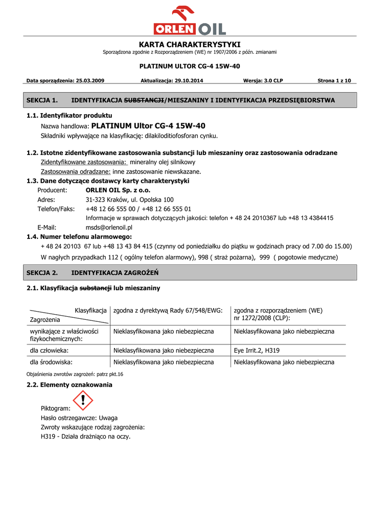 KARTA CHARAKTERYSTYKI Sporządzona zgodnie z Rozporządzeniem (WE) nr 1907/2006 z późn. zmianami PLATINUM ULTOR CG-4 15W-40 Data sporządzenia: 25.03.2009 SEKCJA 1. Aktualizacja: 29.10.2014 Wersja: 3.0 CLP Strona 1 z 10 IDENTYFIKACJA SUBSTANCJI/MIESZANINY I IDENTYFIKACJA PRZEDSIĘBIORSTWA 1.1. Identyfikator produktu Nazwa handlowa: PLATINUM Ultor CG-4 15W-40 Składniki wpływające na klasyfikację: dilakiloditiofosforan cynku. 1.2. Istotne zidentyfikowane zastosowania substancji lub mieszaniny oraz zastosowania odradzane Zidentyfikowane zastosowania: mineralny olej silnikowy Zastosowania odradzane: inne zastosowanie niewskazane. 1.3. Dane dotyczące dostawcy karty charakterystyki Producent: ORLEN OIL Sp. z o.o. Adres: 31-323 Kraków, ul. Opolska 100 Telefon/Faks: +48 12 66 555 00 / +48 12 66 555 01 Informacje w sprawach dotyczących jakości: telefon + 48 24 2010367 lub +48 13 4384415 E-Mail: [email protected] 1.4. Numer telefonu alarmowego: + 48 24 20103 67 lub +48 13 43 84 415 (czynny od poniedziałku do piątku w godzinach pracy od 7.00 do 15.00) W nagłych przypadkach 112 ( ogólny telefon alarmowy), 998 ( straż pożarna), 999 ( pogotowie medyczne) SEKCJA 2. IDENTYFIKACJA ZAGROŻEŃ 2.1. Klasyfikacja substancji lub mieszaniny Klasyfikacja zgodna z dyrektywą Rady 67/548/EWG: zgodna z rozporządzeniem (WE) nr 1272/2008 (CLP): wynikające z właściwości fizykochemicznych: Nieklasyfikowana jako niebezpieczna Nieklasyfikowana jako niebezpieczna dla człowieka: Nieklasyfikowana jako niebezpieczna Eye Irrit.2, H319 dla środowiska: Nieklasyfikowana jako niebezpieczna Nieklasyfikowana jako niebezpieczna Zagrożenia Objaśnienia zwrotów zagrożeń: patrz pkt.16 2.2. Elementy oznakowania Piktogram: Hasło ostrzegawcze: Uwaga Zwroty wskazujące rodzaj zagrożenia: H319 - Działa drażniąco na oczy. KARTA CHARAKTERYSTYKI Sporządzona zgodnie z Rozporządzeniem (WE) nr 1907/2006 z późn. zmianami PLATINUM ULTOR CG-4 15W-40 Data sporządzenia: 25.03.2009 Aktualizacja: 29.10.2014 Wersja: 3.0 CLP Strona 2 z 10 Zwroty wskazujące środki ostrożności: P280 - Stosować rękawice ochronne/ochronę oczu. P305+P351+P338 - W PRZYPADKU DOSTANIA SIĘ DO OCZU: Ostrożnie płukać wodą przez kilka minut. Wyjąć soczewki kontaktowe, jeżeli są i można je łatwo usunąć. P337+P313 W przypadku utrzymywania się działania drażniącego na oczy zasięgnąć porady lekarza. P501 - Zawartość/pojemnik usuwać do upoważnionego odbiorcy odpadów. 2.3. Inne zagrożenia Produkt nie spełnia kryteriów PBT lub vPvB zgodnie z załącznikiem XIII Rozporządzenia REACH. Produkt palny o wysokiej temperaturze zapłonu. SEKCJA 3. SKŁAD/INFORMACJA O SKŁADNIKACH 3.1. Substancje – nie dotyczy 3.2. Mieszaniny: mieszanina mineralnych olejów bazowych i dodatków uszlachetniających Niebezpieczne składniki, zakresy ich stężeń w mieszaninie: Nazwa substancji/ Nr rejestracji REACH Dialkiloditiofosforan cynku Nr CAS / Nr WE 68649-42-3/ % wag. 0,79 – 1,48 Nr indeksowy - 272-082-3 4-dodecylofenol 104-43-8/ Klasyfikacja wg 67/548/EWG Klasyfikacja wg 1272/2008 (CLP) Xi;R41, R38 Eye Dam.1, H318 Skin Irrit.2, H315 Aquatic Chronic 2, H411 Rep.2, H361f Skin Irrit.2, H315 Aquatic Acute 1, H400 Aquatic Chronic 1, H410 N;R51/53 0,06 – 0,12 203-202-9 - Repr.Cat.3, R62 Xi; R38 N;R50/53 Opis zwrotów R,H oraz pełne brzmienie klasyfikacji podano w Sekcji 16. SEKCJA 4. ŚRODKI PIERWSZEJ POMOCY 4.1. Opis środków pierwszej pomocy Wdychanie: Poszkodowanego usunąć (wyprowadzić/wynieść) z miejsca narażenia na świeże powietrze; zapewnić spokój i ciepło. Nieprzytomnego ułożyć w pozycji bocznej ustalonej, rozluźnić uciskające części ubrania; kontrolować i utrzymywać drożność dróg oddechowych. W przypadku zaburzeń w oddychaniu podawać tlen, w przypadku braku oddechu stosować sztuczne oddychanie. W przypadku utraty przytomności, zaburzeń oddychania lub utrzymującego się złego samopoczucia natychmiast zapewnić pomoc lekarską. Kontakt ze skórą: Natychmiast zdjąć zanieczyszczoną/nasiąkniętą odzież i buty. Zanieczyszczoną skórę umyć dokładnie wodą z mydłem lub łagodnym detergentem, a następnie spłukać wodą. W przypadku wystąpienia i utrzymywania się objawów podrażnienia skonsultować się z lekarzem. UWAGA: Zanieczyszczoną/nasiąkniętą odzież usunąć w bezpieczne miejsce z dala od źródeł ciepła i źródeł zapłonu. Kontakt z oczami: Zanieczyszczone oczy natychmiast płukać ciągłym strumieniem wody, usunąć szkła kontaktowe (jeśli są) i kontynuować płukanie przez ok. 15 minut. Podczas płukania trzymać powieki szeroko rozwarte i poruszać gałką oczną. W przypadku wystąpienia i utrzymywania się dolegliwości KARTA CHARAKTERYSTYKI Sporządzona zgodnie z Rozporządzeniem (WE) nr 1907/2006 z późn. zmianami PLATINUM ULTOR CG-4 15W-40 Data sporządzenia: 25.03.2009 Aktualizacja: 29.10.2014 Wersja: 3.0 CLP skonsultować się z lekarzem. UWAGA: Nie stosować zbyt silnego strumienia wody, aby nie uszkodzić rogówki. Połknięcie: Nie prowokować wymiotów. W przypadku wystąpienia samoistnych wymiotów trzymać poszkodowanego w pozycji nachylonej do przodu z twarzą skierowaną do ziemi. Zapewnić pomoc medyczną. 4.2. Najważniejsze ostre i opóźnione objawy oraz skutki narażenia Nie określono. 4.3. Wskazania dotyczące wszelkiej natychmiastowej pomocy lekarskiej i szczególnego postępowania z poszkodowanym Nie prowokować wymiotów i nie podawać niczego doustnie osobie nieprzytomnej. Pokazać kartę charakterystyki lub etykietę/opakowanie personelowi medycznemu udzielającemu pomocy. Osoby udzielające pomocy w obszarze o nieznanym stężeniu par/mgły powinny być wyposażone w odpowiednie ochrony dróg oddechowych. Wskazówki dla lekarza: leczenie objawowe. SEKCJA 5. POSTĘPOWANIE W PRZYPADKU POŻARU 5.1. Środki gaśnicze Odpowiednie środki gaśnicze: dwutlenek węgla, proszek gaśniczy, piana, rozpylona woda Niewłaściwe środki gaśnicze: z
