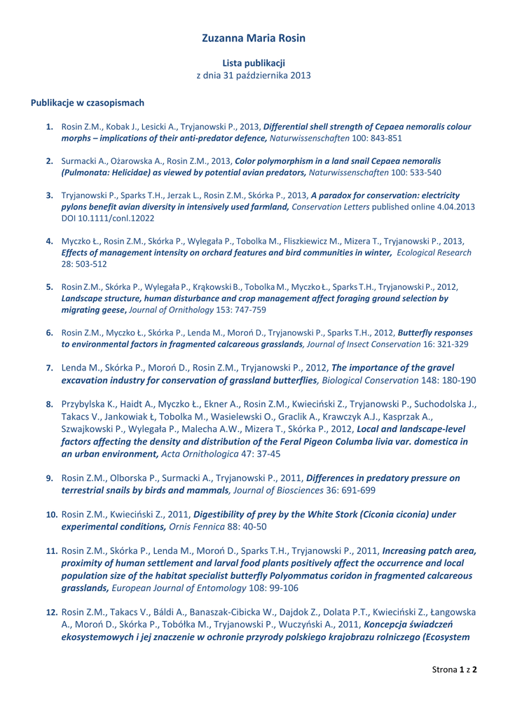 Zuzanna Maria Rosin Lista publikacji z dnia 31 października 2013 Publikacje w czasopismach 1. Rosin Z.M., Kobak J., Lesicki A., Tryjanowski P., 2013, Differential shell strength of Cepaea nemoralis colour morphs – implications of their anti-predator defence, Naturwissenschaften 100: 843-851 2. Surmacki A., Ożarowska A., Rosin Z.M., 2013, Color polymorphism in a land snail Cepaea nemoralis (Pulmonata: Helicidae) as viewed by potential avian predators, Naturwissenschaften 100: 533-540 3. Tryjanowski P., Sparks T.H., Jerzak L., Rosin Z.M., Skórka P., 2013, A paradox for conservation: electricity pylons benefit avian diversity in intensively used farmland, Conservation Letters published online 4.04.2013 DOI 10.1111/conl.12022 4. Myczko Ł., Rosin Z.M., Skórka P., Wylegała P., Tobolka M., Fliszkiewicz M., Mizera T., Tryjanowski P., 2013, Effects of management intensity on orchard features and bird communities in winter, Ecological Research 28: 503-512 5. Rosin Z.M., Skórka P., Wylegała P., Krąkowski B., Tobolka M., Myczko Ł., Sparks T.H., Tryjanowski P., 2012, Landscape structure, human disturbance and crop management affect foraging ground selection by migrating geese, Journal of Ornithology 153: 747-759 6. Rosin Z.M., Myczko Ł., Skórka P., Lenda M., Moroń D., Tryjanowski P., Sparks T.H., 2012, Butterfly responses to environmental factors in fragmented calcareous grasslands, Journal of Insect Conservation 16: 321-329 7. Lenda M., Skórka P., Moroń D., Rosin Z.M., Tryjanowski P., 2012, The importance of the gravel excavation industry for conservation of grassland butterflies, Biological Conservation 148: 180-190 8. Przybylska K., Haidt A., Myczko Ł., Ekner A., Rosin Z.M., Kwieciński Z., Tryjanowski P., Suchodolska J., Takacs V., Jankowiak Ł, Tobolka M., Wasielewski O., Graclik A., Krawczyk A.J., Kasprzak A., Szwajkowski P., Wylegała P., Malecha A.W., Mizera T., Skórka P., 2012, Local and landscape-level factors affecting the density and distribution of the Feral Pigeon Columba livia var. domestica in an urban environment, Acta Ornithologica 47: 37-45 9. Rosin Z.M., Olborska P., Surmacki A., Tryjanowski P., 2011, Differences in predatory pressure on terrestrial snails by birds and mammals, Journal of Biosciences 36: 691-699 10. Rosin Z.M., Kwieciński Z., 2011, Digestibility of prey by the White Stork (Ciconia ciconia) under experimental conditions, Ornis Fennica 88: 40-50 11. Rosin Z.M., Skórka P., Lenda M., Moroń D., Sparks T.H., Tryjanowski P., 2011, Increasing patch area, proximity of human settlement and larval food plants positively affect the occurrence and local population size of the habitat specialist butterfly Polyommatus coridon in fragmented calcareous grasslands, European Journal of Entomology 108: 99-106 12. Rosin Z.M., Takacs V., Báldi A., Banaszak-Cibicka W., Dajdok Z., Dolata P.T., Kwieciński Z., Łangowska A., Moroń D., Skórka P., Tobółka M., Tryjanowski P., Wuczyński A., 2011, Koncepcja świadczeń ekosystemowych i jej znaczenie w ochronie przyrody polskiego krajobrazu rolniczego (Ecosystem Strona 1 z 2 services as an efficient tool of nature conservation: a view from the Polish farmland), Chrońmy Przyrodę Ojczystą 67: 3-20 13. Wylegała P., Rosin Z.M., 2010, High number of the Spotted Crake Porzana porzana in the Middle Notec River Valley during floods in 2010, Ornis Polonica 51: 304-305 14. Wylegała P., Krąkowski B., Sieracki P., Rosin Z.M., Kasprzak A., 2009, Abundance, density and breeding sites of the Crested Lark Galerida cristata in the Wielkopolska agricultural landscape, Ornis Polonica 50: 313-319 15. Rosin Z.M., 2007, Gospodarka wapniem u ptaków wróblowych w okresie lęgowym, Wiadomości Ekologiczne 2: 55 – 87 Strona 2 z 2