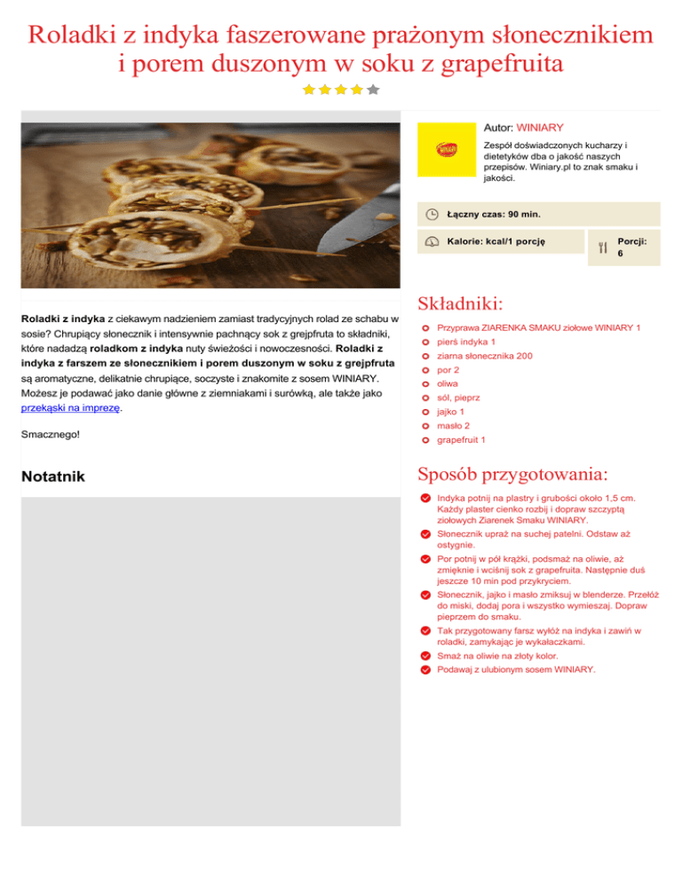 Roladki z indyka faszerowane prażonym słonecznikiem i porem duszonym w soku z grapefruita Autor: WINIARY Zespół doświadczonych kucharzy i dietetyków dba o jakość naszych przepisów. Winiary.pl to znak smaku i jakości. Łączny czas: 90 min. Kalorie: kcal/1 porcję Porcji: 6 Składniki: Roladki z indyka z ciekawym nadzieniem zamiast tradycyjnych rolad ze schabu w sosie? Chrupiący słonecznik i intensywnie pachnący sok z grejpfruta to składniki, które nadadzą roladkom z indyka nuty świeżości i nowoczesności. Roladki z indyka z farszem ze słonecznikiem i porem duszonym w soku z grejpfruta są aromatyczne, delikatnie chrupiące, soczyste i znakomite z sosem WINIARY. Możesz je podawać jako danie główne z ziemniakami i surówką, ale także jako przekąski na imprezę. Przyprawa ZIARENKA SMAKU ziołowe WINIARY 1 pierś indyka 1 ziarna słonecznika 200 por 2 oliwa sól, pieprz jajko 1 masło 2 Smacznego! Notatnik grapefruit 1 Sposób przygotowania: Indyka potnij na plastry i grubości około 1,5 cm. Każdy plaster cienko rozbij i dopraw szczyptą ziołowych Ziarenek Smaku WINIARY. Słonecznik upraż na suchej patelni. Odstaw aż ostygnie. Por potnij w pół krążki, podsmaż na oliwie, aż zmięknie i wciśnij sok z grapefruita. Następnie duś jeszcze 10 min pod przykryciem. Słonecznik, jajko i masło zmiksuj w blenderze. Przełóż do miski, dodaj pora i wszystko wymieszaj. Dopraw pieprzem do smaku. Tak przygotowany farsz wyłóż na indyka i zawiń w roladki, zamykając je wykałaczkami. Smaż na oliwie na złoty kolor. Podawaj z ulubionym sosem WINIARY.