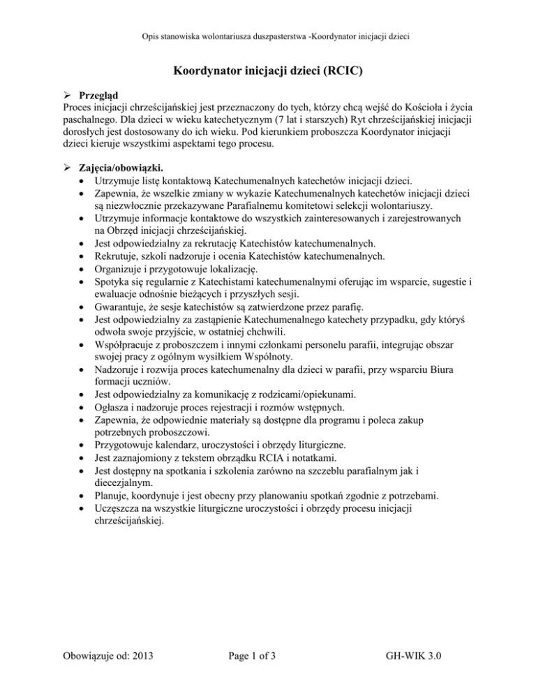 Opis stanowiska wolontariusza duszpasterstwa -Koordynator inicjacji dzieci Koordynator inicjacji dzieci (RCIC) Przegląd Proces inicjacji chrześcijańskiej jest przeznaczony do tych, którzy chcą wejść do Kościoła i życia paschalnego. Dla dzieci w wieku katechetycznym (7 lat i starszych) Ryt chrześcijańskiej inicjacji dorosłych jest dostosowany do ich wieku. Pod kierunkiem proboszcza Koordynator inicjacji dzieci kieruje wszystkimi aspektami tego procesu. Zajęcia/obowiązki. Utrzymuje listę kontaktową Katechumenalnych katechetów inicjacji dzieci. Zapewnia, że wszelkie zmiany w wykazie Katechumenalnych katechetów inicjacji dzieci są niezwłocznie przekazywane Parafialnemu komitetowi selekcji wolontariuszy. Utrzymuje informacje kontaktowe do wszystkich zainteresowanych i zarejestrowanych na Obrzęd inicjacji chrześcijańskiej. Jest odpowiedzialny za rekrutację Katechistów katechumenalnych. Rekrutuje, szkoli nadzoruje i ocenia Katechistów katechumenalnych. Organizuje i przygotowuje lokalizację. Spotyka się regularnie z Katechistami katechumenalnymi oferując im wsparcie, sugestie i ewaluacje odnośnie bieżących i przyszłych sesji. Gwarantuje, że sesje katechistów są zatwierdzone przez parafię. Jest odpowiedzialny za zastąpienie Katechumenalnego katechety przypadku, gdy któryś odwoła swoje przyjście, w ostatniej chchwili. Współpracuje z proboszczem i innymi członkami personelu parafii, integrując obszar swojej pracy z ogólnym wysiłkiem Wspólnoty. Nadzoruje i rozwija proces katechumenalny dla dzieci w parafii, przy wsparciu Biura formacji uczniów. Jest odpowiedzialny za komunikację z rodzicami/opiekunami. Ogłasza i nadzoruje proces rejestracji i rozmów wstępnych. Zapewnia, że odpowiednie materiały są dostępne dla programu i poleca zakup potrzebnych proboszczowi. Przygotowuje kalendarz, uroczystości i obrzędy liturgiczne. Jest zaznajomiony z tekstem obrządku RCIA i notatkami. Jest dostępny na spotkania i szkolenia zarówno na szczeblu parafialnym jak i diecezjalnym. Planuje, koordynuje i jest obecny przy planowaniu spotkań zgodnie z potrzebami. Uczęszcza na wszystkie liturgiczne uroczystości i obrzędy procesu inicjacji chrześcijańskiej. Obowiązuje od: 2013 Page 1 of 3 GH-WIK 3.0 Opis stanowiska wolontariusza duszpasterstwa -Koordynator inicjacji dzieci Działalność/obowiązki wymienione powyżej mogą nie w pełni obrazować duszpasterstwo w tej parafii. Proszę zapoznać się z obowiązkami, które są specyficzne dla tej parafii, w polu "Inne szczegóły". Inne szczegóły: ________________________________________________________________________ ________________________________________________________________________ ________________________________________________________________________ Umiejętności, doświadczenie i kwalifikacje Jest członkiem w pełni zainicjowanym w Kościele katolickim, zgodnie z wymogami. Musi mieć, co najmniej 21 lat. Jest zarejestrowany w parafii, od co najmniej 2 lat. Posiada pełną wiedzę na temat obrzędu inicjacji chrześcijańskiej. Posiada rzetelną wiedzę o aktualnej teologii i katolickiej tradycji. Jest znana w parafii, jako osoba o dobrej reputacji. Powinien mieć doświadczenie, jako katechumenalny katecheta. Zaleca się posiadanie studiów lub szkolenia w dziedzinie teologii, edukacji religijnej lub duszpasterstwa. Jest zaznajomiony z procesem i aspektami pedagogicznymi związanymi z koordynacją i prowadzeniem chrześcijańskiej inicjacji dzieci. Posiada umiejętności dobrych relacji i efektywnego komunikowania się z innymi, szczególnie z dziećmi, młodzieżą i ich rodzinami. Ma odpowiednie umiejętności kierownictwa oraz organizacji. Jest w stanie szkolić, oddelegować, wspierać otwartą komunikację, rozwijać dynamikę zespołu oraz wspierać talenty innych we Wspólnocie. Umiejętność organizowania spotkań oraz planowania i wdrażania programów. Posiada dobre umiejętności organizacyjne. W nagłych przypadkach wie, z kim się kontaktować i/lub zna procedury. Musi być chętny do wzięcia udziału w bieżących formacjach. Osobiste cechy i zalety Pragnie służyć Wspólnocie i przeznacza na to czas i talent. Winien być człowiekiem modlitwy. Powinny być napełniony wiarą, psychicznie zdrowy, pełen wiary i posiadać zdolność do rozróżnienia między dzieleniem się wiarą a nauczaniem prawd. Pragnie rozwijać głębsze zrozumienie i docenienie obrzędów liturgicznych. Ma chęć do pracy z proboszczem i Katechumenalnymi katechistami dla zapewnienia, że praca duszpasterska jest prowadzona wydajnie, przy odpowiednim wystroju i z szacunkiem. Ma postawę osoby pomocnej, wspierającej i niezagrażającej w pracy z dziećmi i ich rodzicami. Nie ma problemu z byciem rozliczanym oraz przestrzega właściwych granic. Uczciwy, niezawodny i mogący utrzymywać ścisłą poufność. Obowiązuje od: 2013 Page 2 of 3 GH-WIK 3.0 Opis stanowiska wolontariusza duszpasterstwa -Koordynator inicjacji dzieci Zwraca uwagę na szczegóły. Ma w sobie ducha hojności. Orientacja i szkolenia Szkolenia i struktury oferowane przez proboszcza i/lub Archidiecezję Toronto. Warsztaty i seminaria przewidziane przez Biuro formacji uczniów. Grupa uczestników Katechumenalni katecheci, sponsorzy, dzieci i ich rodziny. Wsparcie, nadzór i ewaluacja Proboszcz jest pierwszą instancją oferującą wsparcie, nadzór i ewaluacje. Długość kadencji Trzy do pięciu lat z możliwością odnowienia. (Ogólne ryzyko) Termin jednego roku z możliwością odnowienia (* Wysokie ryzyko) Korzyści i warunki pracy Mają bezpośredni wpływ na kształtowanie wiary dzieci i ich rodzin. Będzie rozwijać umiejętności przywódcze, szkoleniowe oraz organizacyjne. Wzbogaci rozwój swojej wiary. Możliwość pracy społecznej i nabrania doświadczenia do wykorzystania w szkole bądź dla awansowania kariery. Jest to pozycja wolontariusza, która wymaga zaangażowania czasu ___ godzin na tydzień / ___ godzin mie