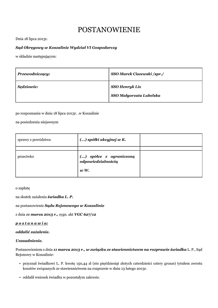 POSTANOWIENIE Dnia 18 lipca 2013r. Sąd Okręgowy w Koszalinie Wydział VI Gospodarczy w składzie następującym: Przewodniczący: SSO Marek Ciszewski /spr./ Sędziowie: SSO Henryk Lis SSO Małgorzata Lubelska po rozpoznaniu w dniu 18 lipca 2013r. .w Koszalinie na posiedzeniu niejawnym sprawy z powództwa (...) spółki akcyjnej w K. przeciwko (...) spółce z ograniczoną odpowiedzialnością w W. o zapłatę na skutek zażalenia świadka L. P. na postanowienie Sądu Rejonowego w Koszalinie z dnia 11 marca 2013 r., sygn. akt VGC 627/12 p o s t a n a w i a: oddalić zażalenie. Uzasadnienie. Postanowieniem z dnia 11 marca 2013 r., w związku ze stawiennictwem na rozprawie świadka L. P., Sąd Rejonowy w Koszalinie: • przyznał świadkowi L. P. kwotę 150,44 zł (sto pięćdziesiąt złotych czterdzieści cztery grosze) tytułem zwrotu kosztów związanych ze stawiennictwem na rozprawie w dniu 13 lutego 2013r. • oddalił wniosek świadka w pozostałym zakresie. W uzasadnieniu tego orzeczenia Sąd Rejonowy wskazał, że w związku ze stawiennictwem na rozprawę w dniu 13 lutego 2013r., świadek wniósł o zwrot kosztów podróży, samochodem osobowym o pojemności skokowej powyżej 900cm3 na trasie C. - K. - C., a nadto o zwrot utraconego zarobku w kwocie 180 zł, licząc 6 godzin po 30 zł/h. W zakresie zwrotu kosztów przejazdu, żądanie świadka znajduje uzasadnienie w treści art. 277 kpc, zgodnie z którym świadek ma prawo żądać zwrotu wydatków koniecznych, związanych ze stawiennictwem do sądu, a ponadto wynagrodzenia za utratę zarobku. Stosownie do art. 85 ustawy o kosztach sądowych w sprawach cywilnych świadkowi przysługuje zwrot kosztów podróży, z miejsca jego zamieszkania do miejsca wykonywania czynności sądowej na wezwanie sądu, w wysokości rzeczywiście poniesionych, racjonalnych i celowych kosztów przejazdu własnym samochodem lub innym odpowiednim środkiem transportu. Górną granicę należności, o których mowa, stanowi wysokość kosztów przysługujących pracownikowi zatrudnionemu w państwowej lub samorządowej jednostce sfery budżetowej z tytułu podróży służbowej na obszarze kraju. Świadek L. P. mieszka w C., oddalonym o około 90 km od siedziby Sądu. Podróż odbył samochodem osobowym o pojemności skokowej powyżej 900cm3, w związku z czym, przy zastosowaniu stawki z rozporządzenia Ministra Infrastruktury z dnia 25 marca 2002r. w sprawie warunków ustalania oraz sposobu dokonywania zwrotu kosztów używania do celów służbowych samochodów osobowych, motocykli i motorowerów niebędących własnością pracodawcy ((Dz.U. 2002, nr 27, poz. 271 ze zm.) należny zwrot kosztów wynieść powinien kwotę 150,44 zł (2 x 90 km x 0,8358 zł). Co do żądania wynagrodzenia za utratę zarobku Sąd Rejonowy zważył, że zgodnie z art. 86 ustawy o kosztach sądowych w sprawach cywilnych świadkowi przysługuje zwrot zarobku lub dochodu utraconego z powodu stawiennictwa na wezwanie sądu. Utratę zarobku lub dochodu oraz ich wysokość świadek powinien należycie wykazać, o czym świadek został należycie pouczony na druku wezwania. Oznacza to, że świadek L. P. miał możliwość udokumentowania wniosku o zwrot utraconego zarobku poprzez złożenie stosownego zaświadczenia od pracodawcy potwierdzającego fakt zatrudnienia oraz wysokość utraconego wynagrodzenia. Świadek takiego zaświadczenia nie przedłożył, wnosząc jedynie o zwrot kosztów utraconych zarobków bez wskazania konkretnej kwoty. W tym stanie rzeczy wniosek świadka L. P. w tej części nie mógł zostać uwzględniony i w punkcie II postanowienia Sąd Rejonowy żądanie to oddalił. W zażaleniu od tego postanowienia, w zakresie odmowy przyznania wynagrodzenia za utratę zarobku, świadek L. P. podniósł, że wymagane dla ustalenia tej należności dokumenty złożył w czasie pobytu w Sądzie w dniu 13 lutego 2013r., w szczególności wnioskował o przyznanie z tytułu utraty zarobku kwoty 180 zł licząc 6 godzin po 30 zł/h. Prowadzi on działalność gospodarczą jednoosobowo i nie ma możliwości wystawienia zaświadczenia o własnych zarobkach. Z treści zażalenia wynikało, że świadek domaga się zmiany postanowienia i przyznania kwoty 180 zł z tytułu wynagrodzenia za utratę zarobku. W piśmie z dnia 20 czerwca 2013r. skarżący rozszerzył żądanie zażalenia. Przedłożył kserokopię fragmentów opracowania pn Regulamin Honorariów Architekta z 2003r. i żądał określenia jego należności wg przewidzianych tam stawek tj kwoty 900 zł licząc 6 godzin po 150 zł/h. Sąd zważył, co następuje: Do uwzględnienia zażalenia brak jest jakichkolwiek podstaw. Zasadnie Sąd Rejonowy wskazał, że norma ogólna art. 277 kpc przyznaje świadkowi, w związku z obowiązkiem złożenia zeznań w sądzie, prawo żądania zwrotu wydatków koniecznych, związanych ze stawiennictwem do sądu, a ponadto wynagrodzenia za utratę zarobku. W sprawie świadek otrzymał zwrot kosztów podróży i należności z tego tytułu nie kwestionuje. Przedmiotem roszczenia skarżący uczynił zwrot utraconego dochodu. Normę art. 277 kpc w tym zakresie rozwija art. 86 ustawy o kosztach sądowych w sprawach cywilnych stanowiąc, że świadkowi przysługuje zwrot zarobku lub dochodu utraconego z powodu stawiennictwa na wezwanie sądu. Wynagrodzenie za utracony zarobek lub dochód za każdy dzień udziału w czynnościach sądowych przyznaje się świadkowi w wysokości jego przeciętnego dziennego zarobku lub dochodu. W przypadku świadka pozostającego w stosunku pracy przeciętny dzienny utracony zarobek oblicza się według zasad obowiązujących przy ustalaniu należnego pracownikowi ekwiwalentu pieniężnego za urlop /art. 86 ust. 2 uksc/. Istotna jest również regulacja art. 86 ust. 4 uksc, według której utratę zarobku lub dochodu, o których mowa w ust. 1, oraz ich wysokość świadek powinien należycie wykazać. Z przytoczonych przepisów wynika, że prawo uzyska