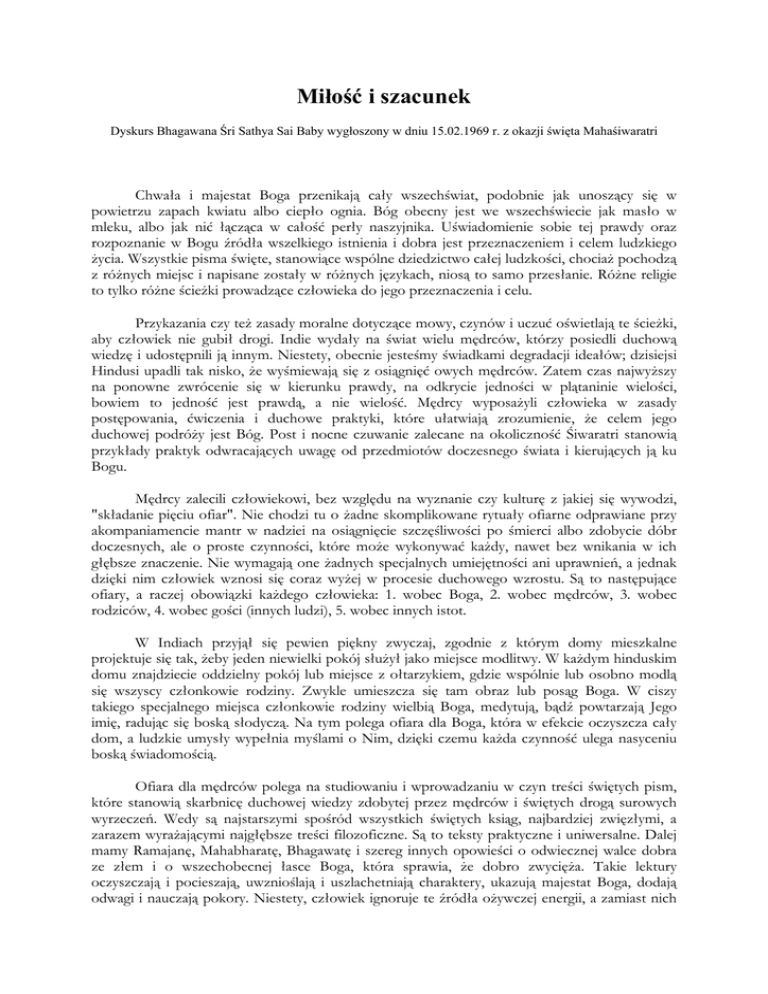 Miłość i szacunek Dyskurs Bhagawana Śri Sathya Sai Baby wygłoszony w dniu 15.02.1969 r. z okazji święta Mahaśiwaratri Chwała i majestat Boga przenikają cały wszechświat, podobnie jak unoszący się w powietrzu zapach kwiatu albo ciepło ognia. Bóg obecny jest we wszechświecie jak masło w mleku, albo jak nić łącząca w całość perły naszyjnika. Uświadomienie sobie tej prawdy oraz rozpoznanie w Bogu źródła wszelkiego istnienia i dobra jest przeznaczeniem i celem ludzkiego życia. Wszystkie pisma święte, stanowiące wspólne dziedzictwo całej ludzkości, chociaż pochodzą z różnych miejsc i napisane zostały w różnych językach, niosą to samo przesłanie. Różne religie to tylko różne ścieżki prowadzące człowieka do jego przeznaczenia i celu. Przykazania czy też zasady moralne dotyczące mowy, czynów i uczuć oświetlają te ścieżki, aby człowiek nie gubił drogi. Indie wydały na świat wielu mędrców, którzy posiedli duchową wiedzę i udostępnili ją innym. Niestety, obecnie jesteśmy świadkami degradacji ideałów; dzisiejsi Hindusi upadli tak nisko, że wyśmiewają się z osiągnięć owych mędrców. Zatem czas najwyższy na ponowne zwrócenie się w kierunku prawdy, na odkrycie jedności w plątaninie wielości, bowiem to jedność jest prawdą, a nie wielość. Mędrcy wyposażyli człowieka w zasady postępowania, ćwiczenia i duchowe praktyki, które ułatwiają zrozumienie, że celem jego duchowej podróży jest Bóg. Post i nocne czuwanie zalecane na okoliczność Śiwaratri stanowią przykłady praktyk odwracających uwagę od przedmiotów doczesnego świata i kierujących ją ku Bogu. Mędrcy zalecili człowiekowi, bez względu na wyznanie czy kulturę z jakiej się wywodzi, "składanie pięciu ofiar". Nie chodzi tu o żadne skomplikowane rytuały ofiarne odprawiane przy akompaniamencie mantr w nadziei na osiągnięcie szczęśliwości po śmierci albo zdobycie dóbr doczesnych, ale o proste czynności, które może wykonywać każdy, nawet bez wnikania w ich głębsze znaczenie. Nie wymagają one żadnych specjalnych umiejętności ani uprawnień, a jednak dzięki nim człowiek wznosi się coraz wyżej w procesie duchowego wzrostu. Są to następujące ofiary, a raczej obowiązki każdego człowieka: 1. wobec Boga, 2. wobec mędrców, 3. wobec rodziców, 4. wobec gości (innych ludzi), 5. wobec innych istot. W Indiach przyjął się pewien piękny zwyczaj, zgodnie z którym domy mieszkalne projektuje się tak, żeby jeden niewielki pokój służył jako miejsce modlitwy. W każdym hinduskim domu znajdziecie oddzielny pokój lub miejsce z ołtarzykiem, gdzie wspólnie lub osobno modlą się wszyscy członkowie rodziny. Zwykle umieszcza się tam obraz lub posąg Boga. W ciszy takiego specjalnego miejsca członkowie rodziny wielbią Boga, medytują, bądź powtarzają Jego imię, radując się boską słodyczą. Na tym polega ofiara dla Boga, która w efekcie oczyszcza cały dom, a ludzkie umysły wypełnia myślami o Nim, dzięki czemu każda czynność ulega nasyceniu boską świadomością. Ofiara dla mędrców polega na studiowaniu i wprowadzaniu w czyn treści świętych pism, które stanowią skarbnicę duchowej wiedzy zdobytej przez mędrców i świętych drogą surowych wyrzeczeń. Wedy są najstarszymi spośród wszystkich świętych ksiąg, najbardziej zwięzłymi, a zarazem wyrażającymi najgłębsze treści filozoficzne. Są to teksty praktyczne i uniwersalne. Dalej mamy Ramajanę, Mahabharatę, Bhagawatę i szereg innych opowieści o odwiecznej walce dobra ze złem i o wszechobecnej łasce Boga, która sprawia, że dobro zwycięża. Takie lektury oczyszczają i pocieszają, uwznioślają i uszlachetniają charaktery, ukazują majestat Boga, dodają odwagi i nauczają pokory. Niestety, człowiek ignoruje te źródła ożywczej energii, a zamiast nich czyta lektury ordynarne, wulgarne, niskie, opisujące karygodne zachowania obłąkanych nieszczęśników, przy czym nie uświadamia sobie, że takie książki szkodzą jego psychice i wstrzymują jego duchowy rozwój. Lektury tego rodzaju niepostrzeżenie wciągają go w niewolę seksu i bagno zwierzęcych instynktów. Nie wystarczy, jeśli będziecie przekonani o swym człowieczeństwie, musicie jeszcze dowieść swoimi czynami, myślami i słowami, że różnicie się od zwierząt. Musicie osiągnąć poziom prawdziwego człowieczeństwa, czyli porzucić wszelkie zwierzęce cechy, nauczyć się nieprzywiązania i rozróżniania, aby panować nad swymi zmysłami, tendencjami i emocjami. Właśnie tego nauczają wartościowe lektury, w których powinniście szukać inspiracji i wskazówek. Trzecia ofiara, do jakiej zobowiązany jest każdy człowiek, to ofiara dla rodziców. Wedy mówią: matru dewo bhawa, pitru dewo bhawa - traktuj matkę jak Boga, traktuj ojca jak Boga. Chociaż to przykazanie powtarza się wam do znudzenia, nie widać, żebyście darzyli czcią swoich rodziców. Kto nie szanuje rodziców, skazuje się na niechybną zgubę. Rodzice nie szczędzą trudu dla swych dzieci, rezygnują z wielu dóbr, żeby je wykształcić. Tymczasem dzieci są niewdzięczne urągają im i dokuczają, zadają ból, wyśmiewając ich zwyczaje i przekonania, lekceważą ich rady. Skoro nie potraficie uszanować tych, którzy są niejako stwórcami waszego ciała i umysłu, czy można oczekiwać, że będziecie czcić stwórcę wszechświata - Boga, który jest źródłem wszelkiego życia? Szanujcie rodziców, żeby wasze dzieci nauczyły się szanować was. W puranach znajdziecie pewną historię na ten temat. Boscy rodzice, Śiwa i Parwati, postanowili poddać próbie swych dwóch synów - Ganapatiego i Subrahmanję. Mieli oni obiec wokół cały świat; nagroda czekała na tego, który pierwszy wykona to zadanie. Subrahmanja bardzo szybko biegł przez doliny i góry, natomiast Ganapati powoli i spokojnie okrążył rodziców, gdyż dla niego to oni stanowili cały świat