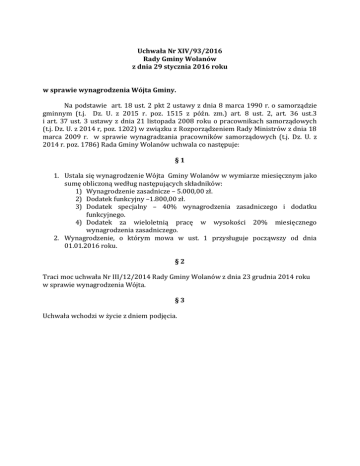 Uchwała Nr XIV/93/2016 Rady Gminy Wolanów z dnia 29 stycznia 2016 roku w sprawie wynagrodzenia Wójta Gminy. Na podstawie art. 18 ust. 2 pkt 2 ustawy z dnia 8 marca 1990 r. o samorządzie gminnym (t.j. Dz. U. z 2015 r. poz. 1515 z późn. zm.) art. 8 ust. 2, art. 36 ust.3 i art. 37 ust. 3 ustawy z dnia 21 listopada 2008 roku o pracownikach samorządowych (t.j. Dz. U. z 2014 r, poz. 1202) w związku z Rozporządzeniem Rady Ministrów z dnia 18 marca 2009 r. w sprawie wynagradzania pracowników samorządowych (t.j. Dz. U. z 2014 r. poz. 1786) Rada Gminy Wolanów uchwala co następuje: §1 1. Ustala się wynagrodzenie Wójta Gminy Wolanów w wymiarze miesięcznym jako sumę obliczoną według następujących składników: 1) Wynagrodzenie zasadnicze – 5.000,00 zł. 2) Dodatek funkcyjny –1.800,00 zł. 3) Dodatek specjalny – 40% wynagrodzenia zasadniczego i dodatku funkcyjnego. 4) Dodatek za wieloletnią pracę w wysokości 20% miesięcznego wynagrodzenia zasadniczego. 2. Wynagrodzenie, o którym mowa w ust. 1 przysługuje począwszy od dnia 01.01.2016 roku. §2 Traci moc uchwała Nr III/12/2014 Rady Gminy Wolanów z dnia 23 grudnia 2014 roku w sprawie wynagrodzenia Wójta. §3 Uchwała wchodzi w życie z dniem podjęcia. Uzasadnienie do uchwały Nr XIV/93/2016 Rady Gminy Wolanów z dnia 29 stycznia 2016 roku w sprawie wynagrodzenia Wójta Gminy Artykuł 18 ust 2 pkt 2 ustawy o samorządzie gminnym (Dz. U. z 2015 r., poz. 1515 z późn. zm.) stanowi, że do wyłącznej właściwości rady gminy należy m.in. ustalanie wynagrodzenia wójta. Taką kompetencje dla rady zastrzega również art. 8 ust. 2 ustawa z dnia 21 listopada 2008 r. o pracownikach samorządowych (t. j. Dz. U. z 2014 r. poz. 1202 z póżn. Zm.) który brzmi: „Czynności z zakresu prawa pracy wobec Wójta (burmistrza, prezydenta miasta), związane z nawiązaniem i rozwiązaniem stosunku pracy, wykonuje przewodniczący rady gminy, a pozostałe czynności – wyznaczona przez wójta (burmistrza, prezydenta miasta) osoba zastępująca lub sekretarz gminy, z tym że wynagrodzenie Wójta ustala Rada Gminy w drodze uchwały”. Zasady wynagradzania pracowników samorządowych, w tym również wójta, określa Rozporządzenie Rady Ministrów z dnia 18 marca 2009 r. w sprawie zasad wynagradzania pracowników samorządowych (t.j. Dz. U z 2014 , poz. 1786) Proponowane w projekcie uchwały wynagrodzenie Wójta zostało określone w oparciu o załącznik nr 3 do w/w Rozporządzenia, który określa warunki i sposób wynagradzania pracowników samorządowych zatrudnionych na podstawie wybory i maksymalny poziom dodatku funkcyjnego. Wynagrodzenie zasadnicze na stanowisku wójtów/burmistrzów zgodnie z tabelą I wspomnianego załącznika nr 3, w gminach do 15 tysięcy mieszkańców mieści się w przedziale od 4.200 zł. do 5.900 zł., natomiast stawka dodatku funkcyjnego nie może przekroczyć 1.900 zł. Art. 36 ust. 3 przywołanej na wstępie ustawy o pracownikach samorządowych stanowi, że wójtowi (burmistrzowi, prezydentowi miasta), staroście oraz marszałkowi województwa przysługuje dodatek specjalny. Dodatek specjalny jest obligatoryjnym składnikiem wynagrodzenia wójta i zgodnie z § 6 Rozporządzenia Rady Ministrów z dnia 18 marca 2009 r. w sprawie zasad wynagradzania pracowników samorządowych wysokość dodatku specjalnego przysługuje w kwocie wynoszącej co najmniej 20% i nieprzekraczającej 40% łącznie wynagrodzenia zasadniczego i dodatku funkcyjnego. Obligatoryjnym składnikiem wynagrodzenia wójta zgodnie z art. 38 ust. 1 ustawy o pracownikach samorządowych jest dodatek za wieloletnią pracę, którego minimalna wysokość wynosi 5% a maksymalna 20% miesięcznego wynagrodzenia. Artykuł 37 ust.3 ustawy o pracownikach samorządowych stanowi, że maksymalne wynagrodzenie pracowników samorządowych zatrudnionych na podstawie wyboru nie może przekroczyć w okresie miesiąca siedmiokrotności kwoty bazowej określonej w ustawie budżetowej dla osób zajmujących kierownicze stanowiska państwowe na podstawie przepisów ustawy z dnia 23 grudnia 1999r. o kształtowaniu wynagrodzeń w państwowej sferze budżetowe oraz o zmianie niektórych ustaw. Kwota bazowa dla osób zajmujących stanowiska kierownicze, zgodnie z ustawą budżetową na rok 2016 wynosi 1.766,46 zł. W świetle ww. przepisów wynagrodzenie Wójta po uwzględnieniu wszystkich składników nie może przekroczyć siedmiokrotności kwoty bazowej, a więc kwoty 12.365,22 zł. Reasumując zasadnym jest aby wynagrodzenie wójta kształtowało się na następującym poziomie: - Wynagrodzenie zasadnicze - Dodatek funkcyjny - Dodatek specjalny - Dodatek za wieloletnią pracę Łącznie 5.000,00 zł. 1.800,00 zł. 2.720,00 zł. 1.000,00zł. ok. 10.520,00 zł. brutto