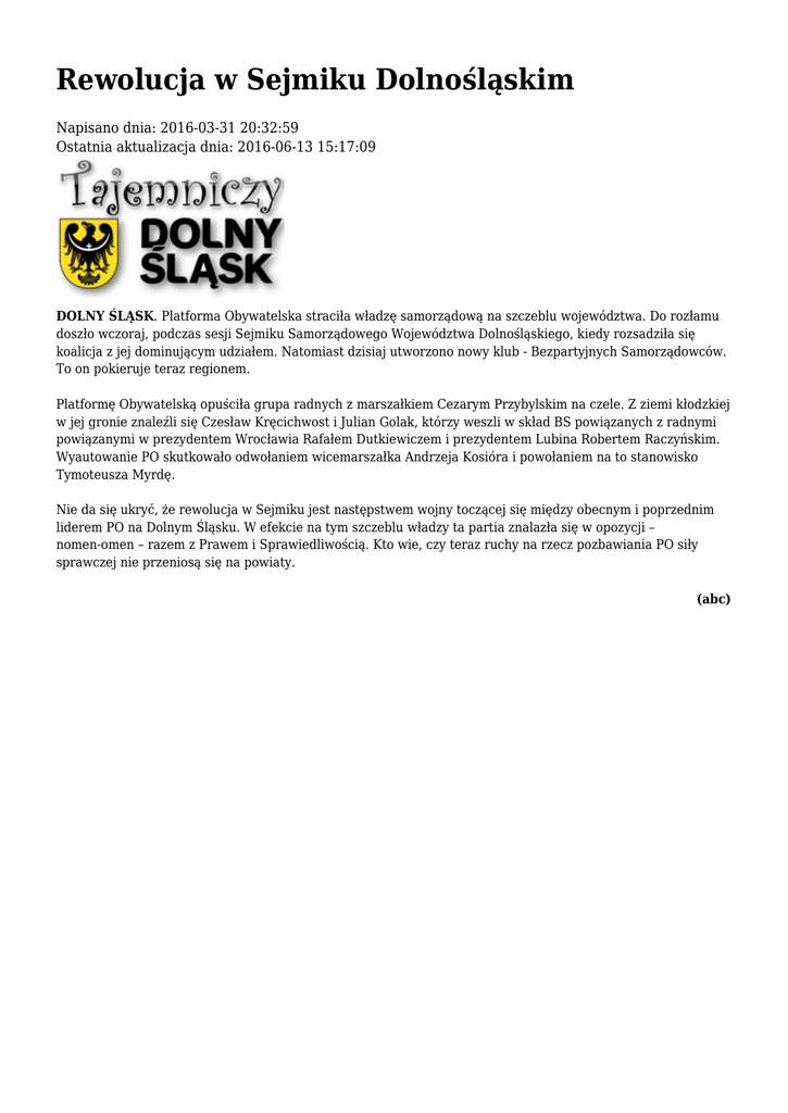 Rewolucja w Sejmiku Dolnośląskim Napisano dnia: 2016-03-31 20:32:59 Ostatnia aktualizacja dnia: 2016-06-13 15:17:09 DOLNY ŚLĄSK. Platforma Obywatelska straciła władzę samorządową na szczeblu województwa. Do rozłamu doszło wczoraj, podczas sesji Sejmiku Samorządowego Województwa Dolnośląskiego, kiedy rozsadziła się koalicja z jej dominującym udziałem. Natomiast dzisiaj utworzono nowy klub - Bezpartyjnych Samorządowców. To on pokieruje teraz regionem. Platformę Obywatelską opuściła grupa radnych z marszałkiem Cezarym Przybylskim na czele. Z ziemi kłodzkiej w jej gronie znaleźli się Czesław Kręcichwost i Julian Golak, którzy weszli w skład BS powiązanych z radnymi powiązanymi w prezydentem Wrocławia Rafałem Dutkiewiczem i prezydentem Lubina Robertem Raczyńskim. Wyautowanie PO skutkowało odwołaniem wicemarszałka Andrzeja Kosióra i powołaniem na to stanowisko Tymoteusza Myrdę. Nie da się ukryć, że rewolucja w Sejmiku jest następstwem wojny toczącej się między obecnym i poprzednim liderem PO na Dolnym Śląsku. W efekcie na tym szczeblu władzy ta partia znalazła się w opozycji – nomen-omen – razem z Prawem i Sprawiedliwością. Kto wie, czy teraz ruchy na rzecz pozbawiania PO siły sprawczej nie przeniosą się na powiaty. (abc)