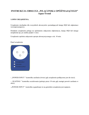 INSTRUKCJA OBSŁUGI „WŁĄCZNIKA OPÓŹNIAJĄCEGO” Aqua-Trend 1.OPIS URZĄDZENIA. Urządzenie niezbędne dla wszystkich akwarystów posiadających lampę HQI lub odpieniacz wewnątrzsumpowy. Działanie urządzenia polega na opóźnieniu załączenia odpieniacza, lampy HQI lub innego urządzenia np. po zaniku prądu w sieci. Urządzenie opóźnia załączenie sprzętu akwarystycznego o ok. 10 min. Www.aqu a-trend.pl Panel urządzenia POWER INPUT WAITING POWER OUTPUT - „POWER INPUT ” kontrolka zasilania (świeci gdy urządzenie podłączone jest do sieci). - „WAITING ” kontrolka oczekiwania (pulsuje przez 10 min gdy nastąpi powrót zasilania w sieci). -„POWER INPUT” kontrolka sygnalizuje że na gnieździe urządzenia jest napięcie. 2. UŻYTKOWANIE „KROK PO KROKU” a. podłączenie urządzenia Aby nasze urządzenie mogło funkcjonować, należy dolną część (wtyczkę) umieścić w gniazdku elektrycznym 230V Do gniazda w górnej części obudowy, należy podłączyć dowolne urządzenie o mocy nieprzekraczającej 500W. b. działanie Po zaniku prądu w sieci i po jego ponownym pojawieniu się nasz „Włącznik Opóźniający” załączy podłączone do niego urządzenie dopiero po około 10 minutach, stan oczekiwania sygnalizowany jest poprzez pulsowanie diody „Waiting”. 3. WARUNKI PRACY Urządzenie „Włącznik Opóźniający” jak każde urządzenie elektroniczne nie może pracować w warunkach dużej wilgotności powietrza. Do urządzenia nie można podłączać sprzętu, którego moc przekracza 500W. 4. ŚRODKI OSTROŻNSCI Dozownik Doser One Evolution jak każde urządzenie elektroniczne nie może pracować w warunkach dużej wilgotności powietrza, dozownik należy więc umieścić w suchym miejscu poza szafką sumpową, lub zapewnić bardzo dobrą wentylację szafki. Aby zapewnić maksymalne bezpieczeństwo swoim podopiecznym, pamiętaj aby w zbiornikach z których pobierane są płyny znajdowała się taka ilość płynu, która w przypadku gdy doszłoby do wlania do akwarium całego zapasu płynu to dawka ta nie zaszkodzi mieszkańcom akwarium. 5. DANE TECHNICZNE Napięcie zasilania 230v AC Pobór prądu 200 mA Max obciążenie gniazda 500W Wymiary urządzenia w cm.: 12 x 7 x 4 Waga urządzenia: 270 g. KARTA GWARANCYJNA 1. Okres gwarancji wynosi 24 miesiące i jest liczony od daty podanej na karcie gwarancyjnej. 2. Reklamacje należy zgłaszać w miejscu zakupu produktu lub w siedzibie producenta, przedstawiając dowód zakupu, opis uszkodzenia oraz kartę gwarancyjną. Sprzedawca po zapoznaniu się z dokumentami i stanem reklamowanego produktu zdecyduje o dalszym postępowaniu gwarancyjnym. 3. Karta gwarancyjna jest ważna z dowodem zakupu (oryginał lub kserokopia), gdy posiada wpisaną datę sprzedaży, nazwę, model, oraz jest potwierdzona pieczątką i podpisem sprzedającego. 4. Reklamowany produkt może wymagać przeprowadzenia szczegółowej ekspertyzy celem stwierdzenia zarówno zaistnienia uszkodzenia, jak i zasadności reklamacji. Produkt powinien zawierać wszystkie akcesoria dołączone przez producenta. 5. Reklamowany produkt do serwisu powinien być dostarczony na koszt użytkownika. 6. Gwarancja nie obejmuje: a. Materiałów eksploatacyjnych takich jak węże tłoczące i podające b. Uszkodzeń powstałych na skutek stosowania produktu niezgodnie z instrukcją c. Uszkodzeń powstałych na skutek niewłaściwego montaż lub magazynowania produktu d. Trwałego zanieczyszczenia powodującego pogorszenie właściwości użytkowych produktu e. Uszkodzeń powstałych w wyniku dokonywania nieautoryzowanych napraw lub modyfikacji produktu f. Uszkodzeń powstałych na skutek zdarzeń losowych (np. pożaru, wyładowań atmosferycznych, powodzi) g. Uszkodzeń powstałych na skutek transportu do serwisu 7. Serwis zastrzega sobie prawo obciążenia Nabywcy kosztami materiałów, robocizny i transportu, gdy uszkodzenie nie było objęte gwarancją, lub produkt okazał się sprawny. 8. Gwarancja nie obejmuje prawa Nabywcy do odszkodowania z tytułu utraty spodziewanych korzyści i poniesionych kosztów, wynikających z użytkowania lub niemożności użytkowania produktu. Zerwanie lub zniszczenie plomby gwarancyjnej powoduje utratę gwarancji. Produkt wyprodukowano w Polsce. Producent: Aqua-Trend Lokatorska 11 lok. 6 93-021 Łódź DATA SPRZEDAŻY:………………………………….. MODEL:……………………………………………….. PODPIS:………………………………………………..